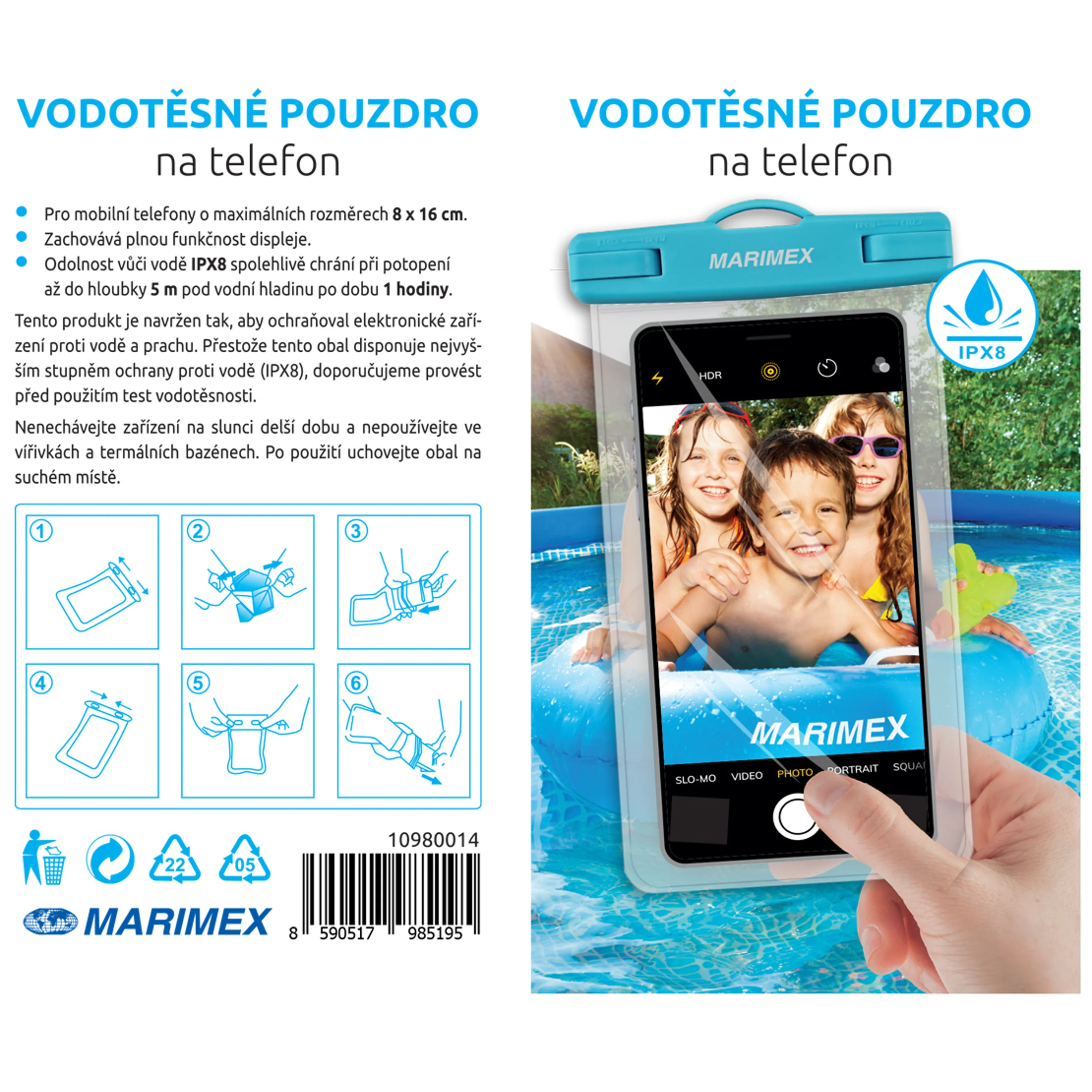 Upozornění: tento produkt je navržen tak, aby chránil elektronické zařízení proti vodě a prachu. Přestože tento obal disponuje nejvyšším stupněm ochrany proti vodě (IPX8), doporučujeme provést před použitím test vodotěsnosti.