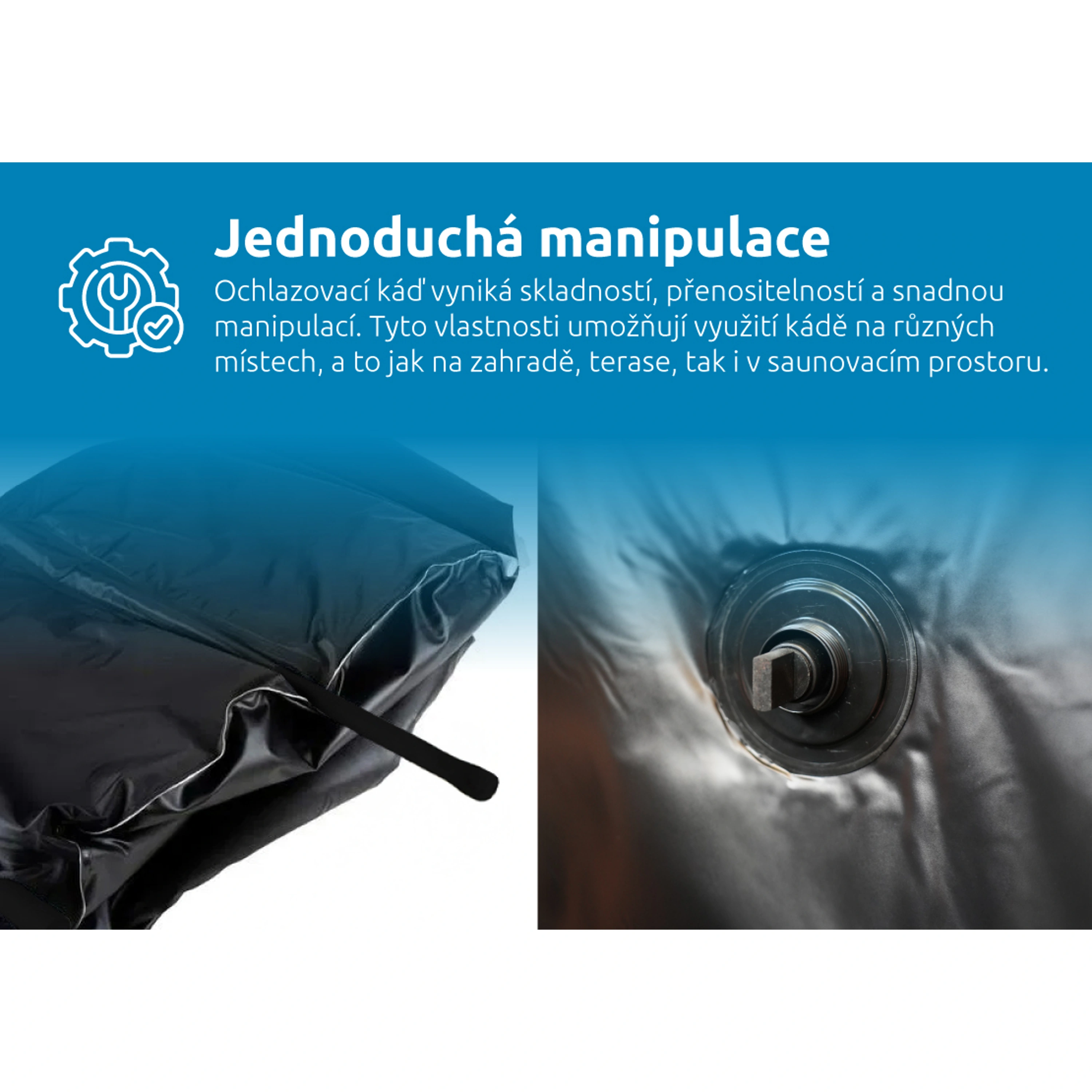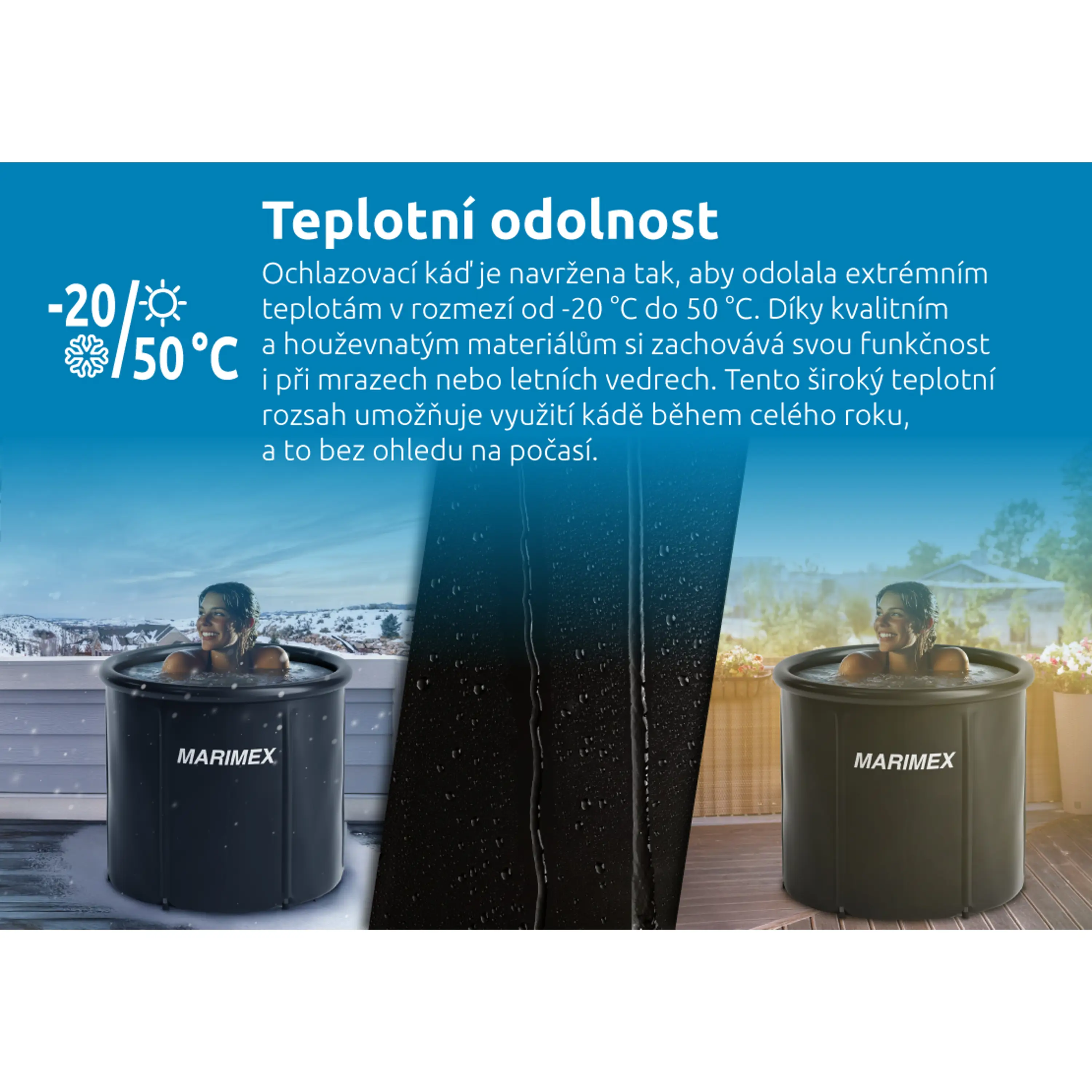 Díky odolnosti vůči teplotám v rozmezí -20 °C až 50 °C můžete káď využívat po celý rok, a to bez ohledu na počasí. Vnější kryt chrání káď před nečistotami, prachem a hmyzem, termokryt udržuje optimální teplotu vody, minimalizuje tepelné ztráty a zvyšuje energetickou úspornost. Tyto vlastnosti společně s jednoduchou manipulací dělají z ochlazovací kádě ideálního společníka na zahradu, terasu i do saunovacího prostoru.