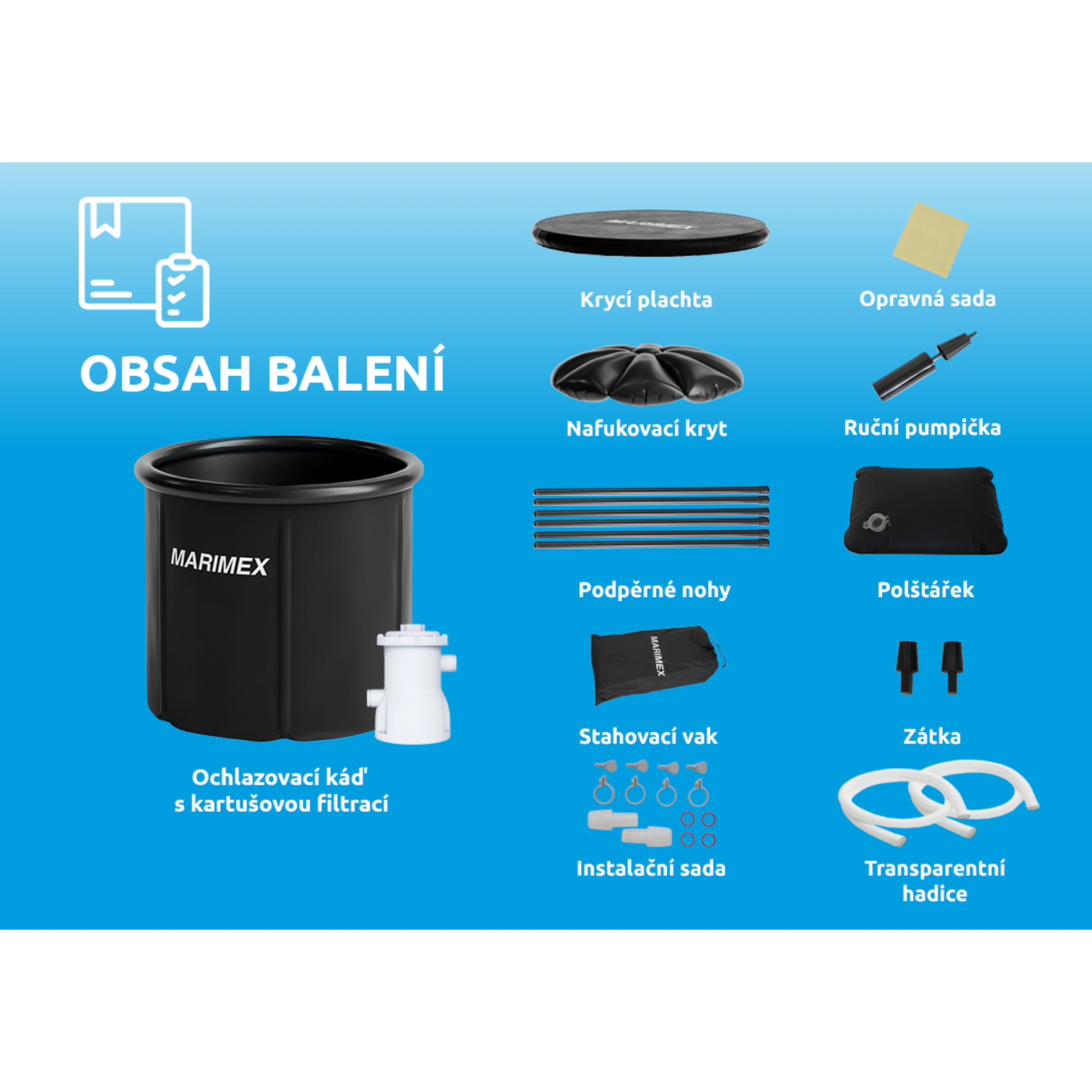 Součástí balení ochlazovací kádě je kartušová filtrace (včetně hadic a všech propojovacích dílů), která se snadno napojuje na průchody stěnou. Díky tomu zůstává voda v kádi čistá a průzračná po delší dobu. Filtrace efektivně odstraňuje nečistoty a zajišťuje pohodlnější a hygieničtější používání bez nutnosti časté výměny vody.
