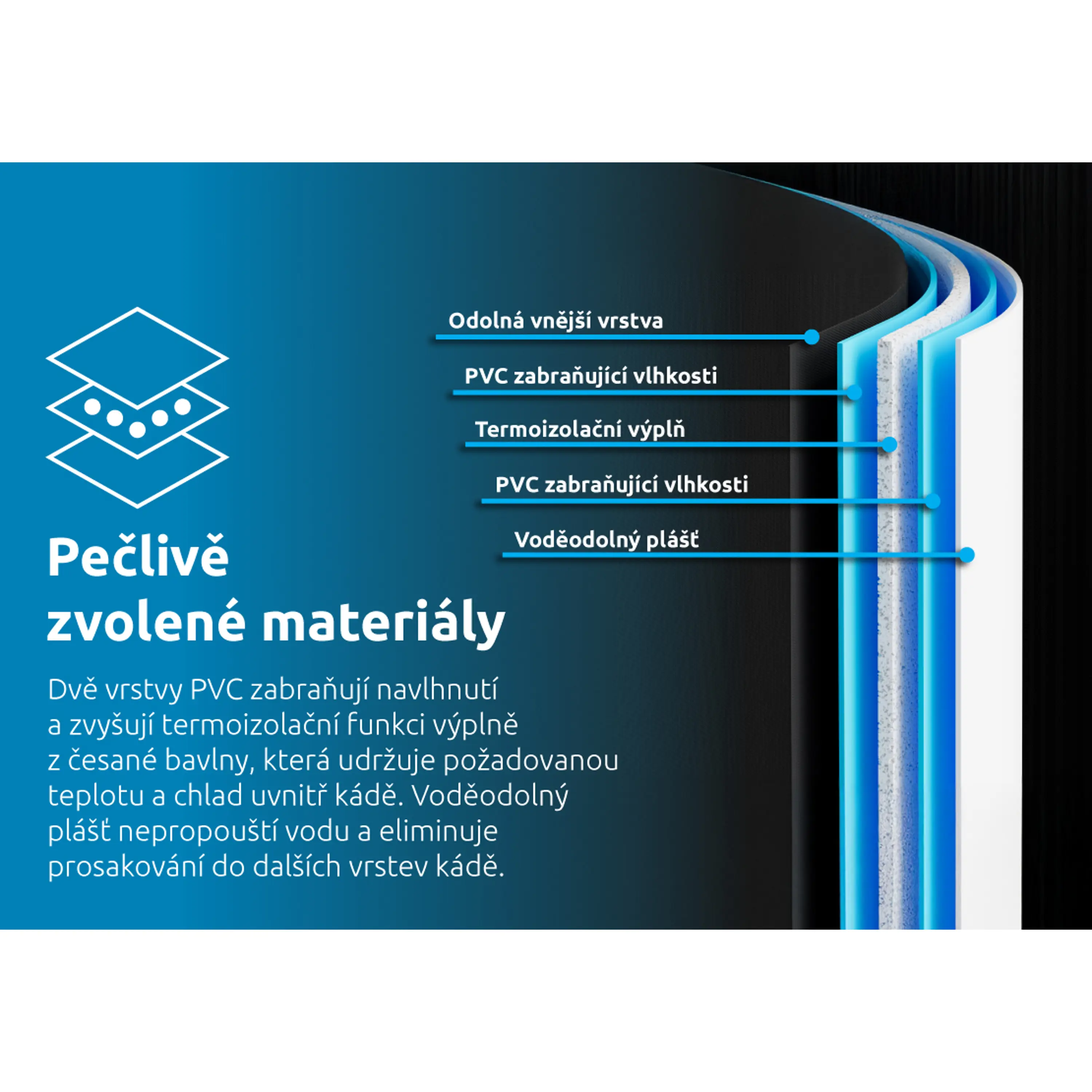 5vrstvé stěny i dnoDvě vrstvy PVC a výplň z česané bavlny zajišťují perfektní termoizolaci a zabraňují navlhnutí. Voděodolný plášť navíc eliminuje prosakování a udržuje obsah kádě v perfektním stavu. |