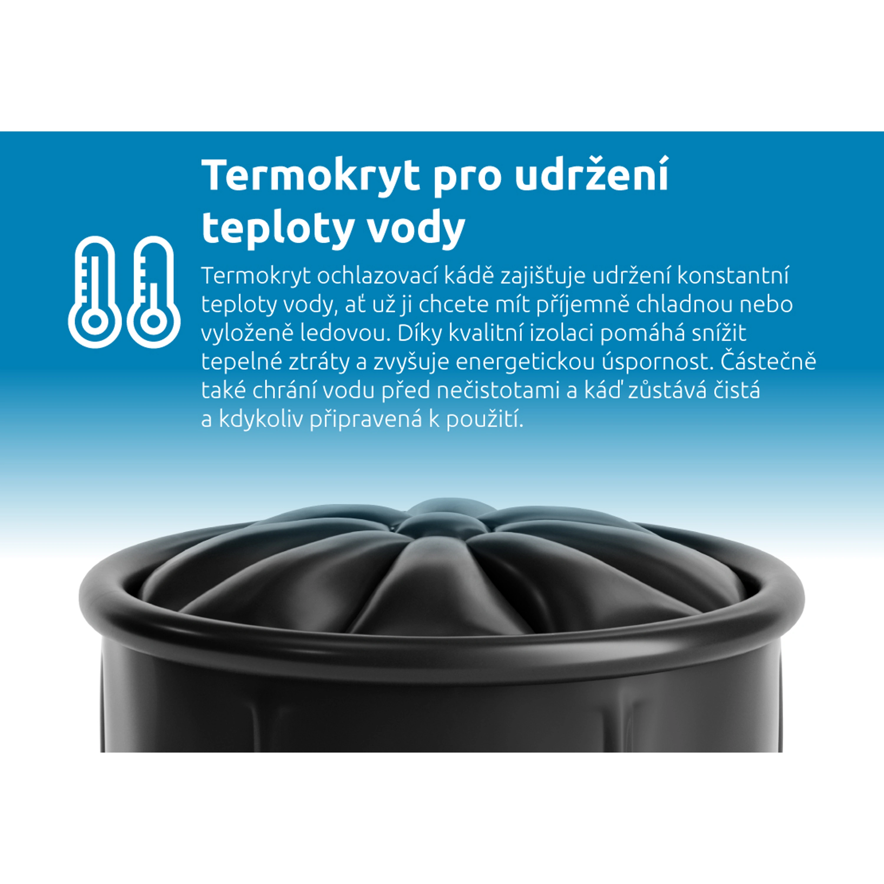 Díky odolnosti vůči teplotám v rozmezí -20 °C až 50 °C můžete káď využívat po celý rok, a to bez ohledu na počasí. Praktická výpusť umožňuje rychlé vypuštění vody, zatímco vnější kryt chrání káď před nečistotami, prachem a hmyzem. Termokryt navíc udržuje optimální teplotu vody, minimalizuje tepelné ztráty a zvyšuje energetickou úspornost. Tyto vlastnosti společně s jednoduchou manipulací dělají z ochlazovací kádě ideálního společníka na zahradu, terasu i do saunovacího prostoru.