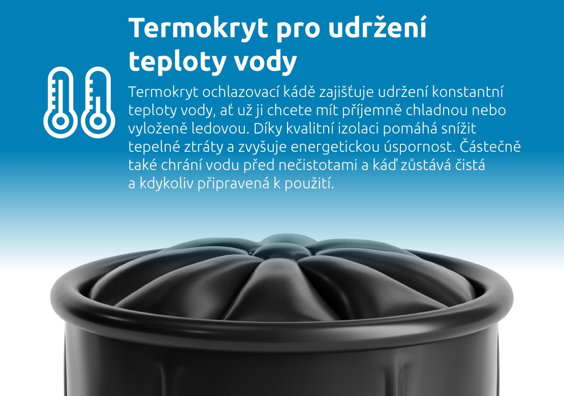 Díky odolnosti vůči teplotám v rozmezí -20 °C až 50 °C můžete káď využívat po celý rok, a to bez ohledu na počasí. Praktická výpusť umožňuje rychlé vypuštění vody, zatímco vnější kryt chrání káď před nečistotami, prachem a hmyzem. Termokryt navíc udržuje optimální teplotu vody, minimalizuje tepelné ztráty a zvyšuje energetickou úspornost. Tyto vlastnosti společně s jednoduchou manipulací dělají z ochlazovací kádě ideálního společníka na zahradu, terasu i do saunovacího prostoru.