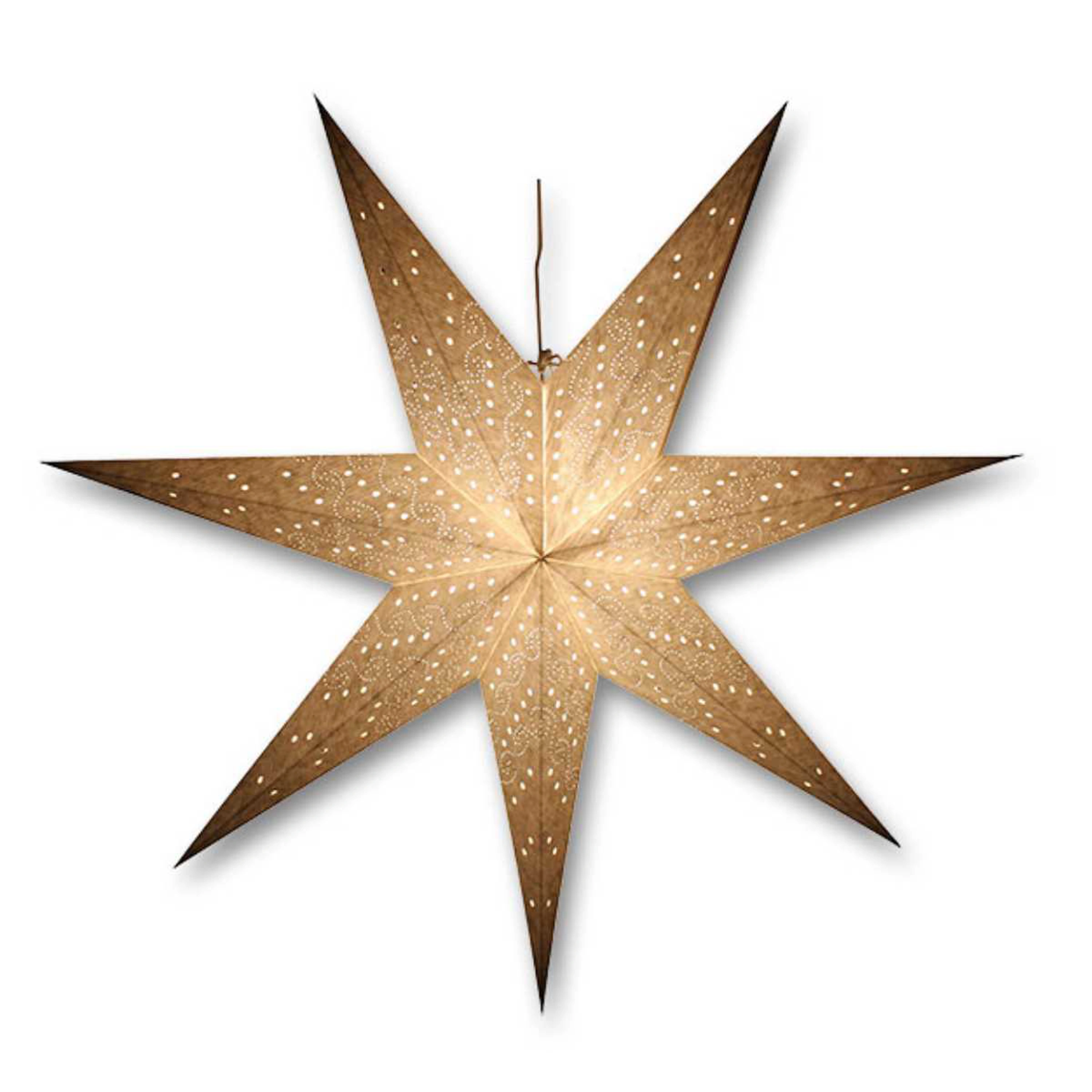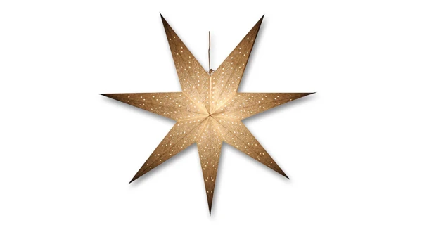 Originální vánoční dekorace v podobě papírové hvězdy s decentním vzorem a se zabudovanou světelnou instalací.