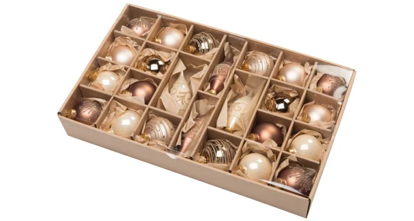 Set obsahuje zlaté, krémové a purpurové kousky, které povznesou Vánoce na zcela jinou úroveň. Exkluzivní kousky zdobené drobnými třpytkami, kamínky a decentními proužky (12 ks) dopňují minimalistické kousky bez zdobení s oslnivým saténovým efektem (12 ks).