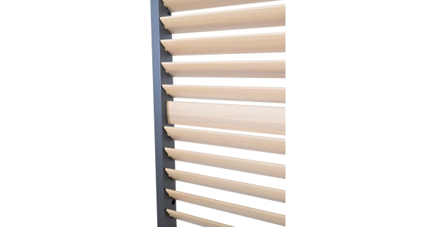 Panel WOOD 1,3 m s horizontálními sklápěcími lamelami pro zastínění bioklimatické pergoly a získání většího soukromí.