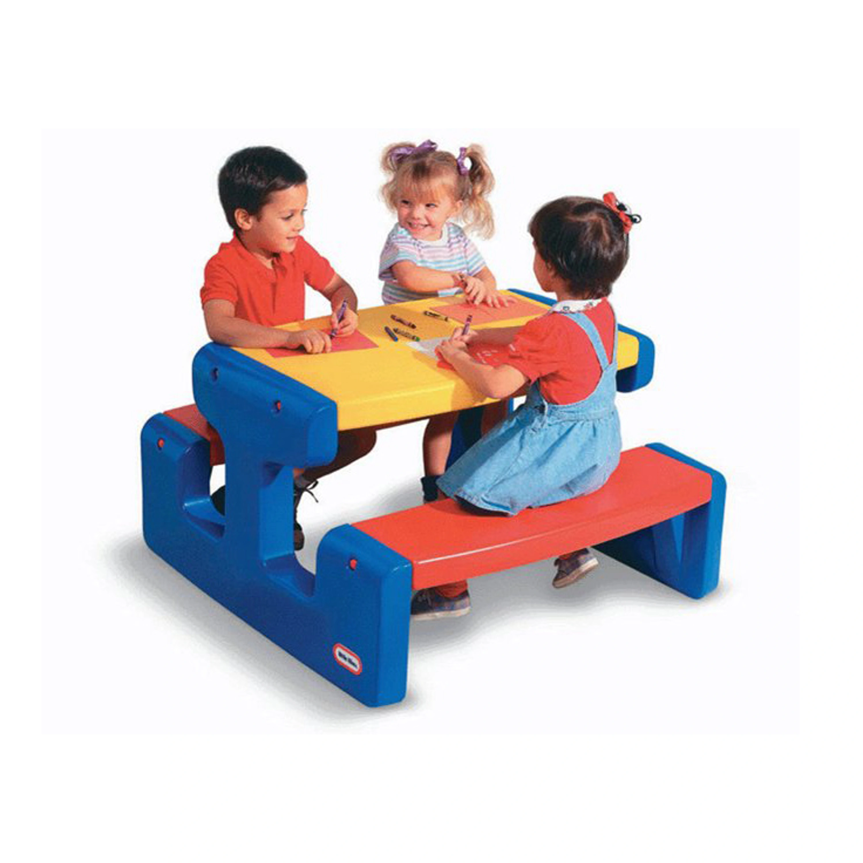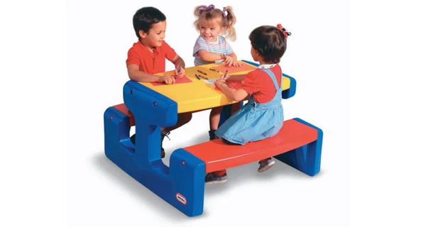 Piknikový stoleček se dvěma lavicemi je dostatečně velký, aby u něho mohlo sedět až šest dětí. Nosnost lavice je 91 kg. Vrchní deska stolečku je hladká, tudíž se snadno čistí. Kvalitní odolný materiál a zaoblené hrany zaručují bezpečné dětské hrátky venku i doma. Konstrukce sestavy zabraňuje převrhnutí. Stoleček je vhodný pro děti od 3 let do 6 let. Lze jej využívat nejen k jídlu, ale i k dalším činnostem, jako je kreslení či modelování. Stoleček je nabízen v barevné kombinaci modré, červené a žluté.