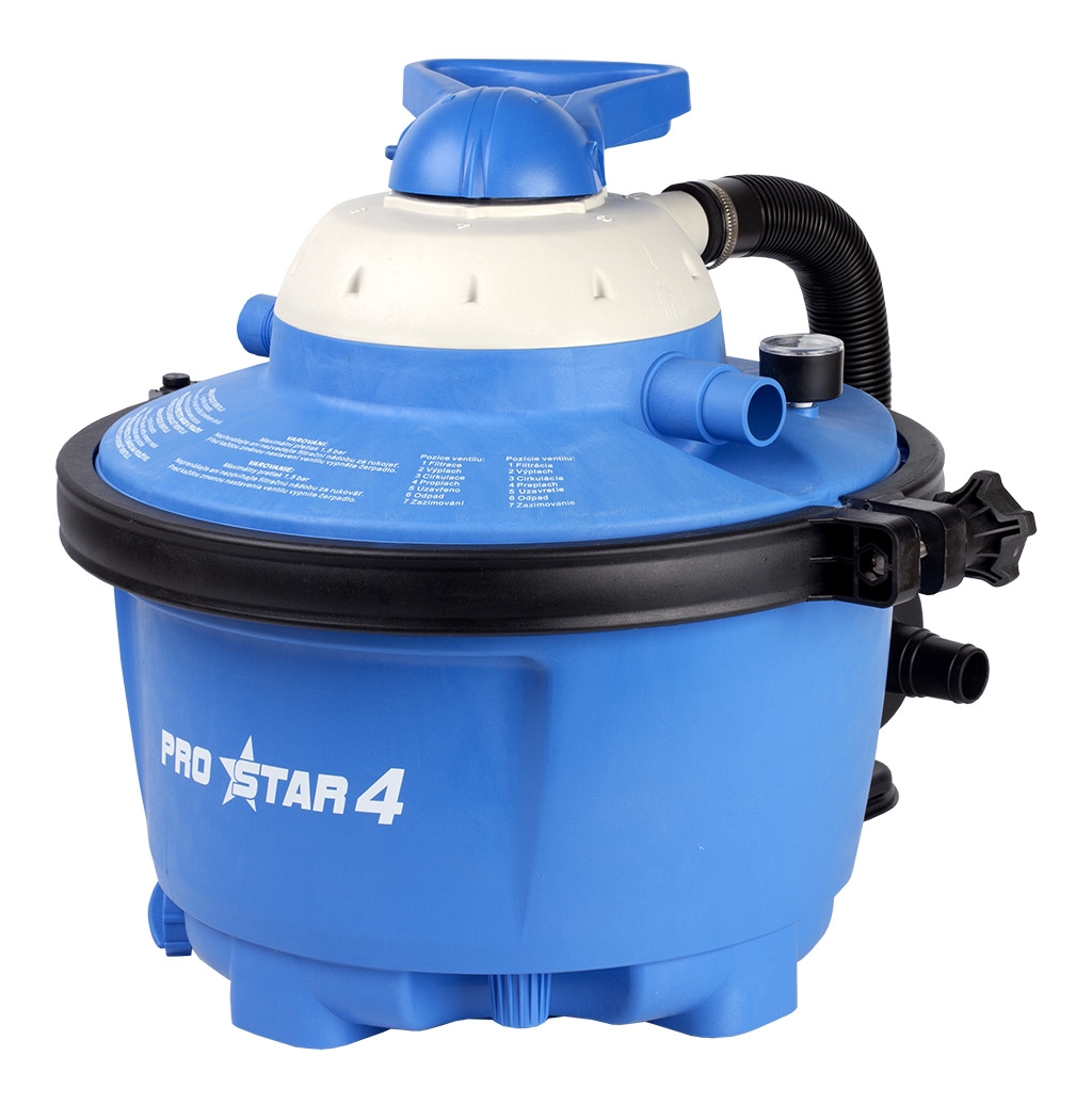 Filtrační systém pískové filtrace ProStar 4 se skládá z filtrační nádoby, do které se vejde 17 kg filtračního písku. Nádoba je vyrobena z vysoce kvalitního polypropylenu (PP). Je beze švů, odolává korozi a běžně dostupným chemikáliím používaných v bazénech.