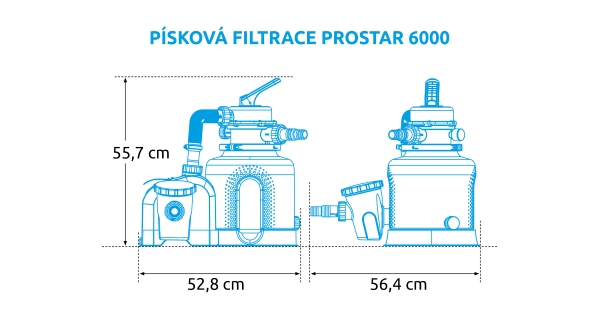 Filtrační systém pískové filtrace ProStar 6000 se skládá z filtrační nádoby, do které se vejde 18 kg filtračního písku. Nádoba je vyrobena z vysoce kvalitního polypropylenu (PP). Odolává korozi a běžně dostupným chemikáliím používaných v bazénech.