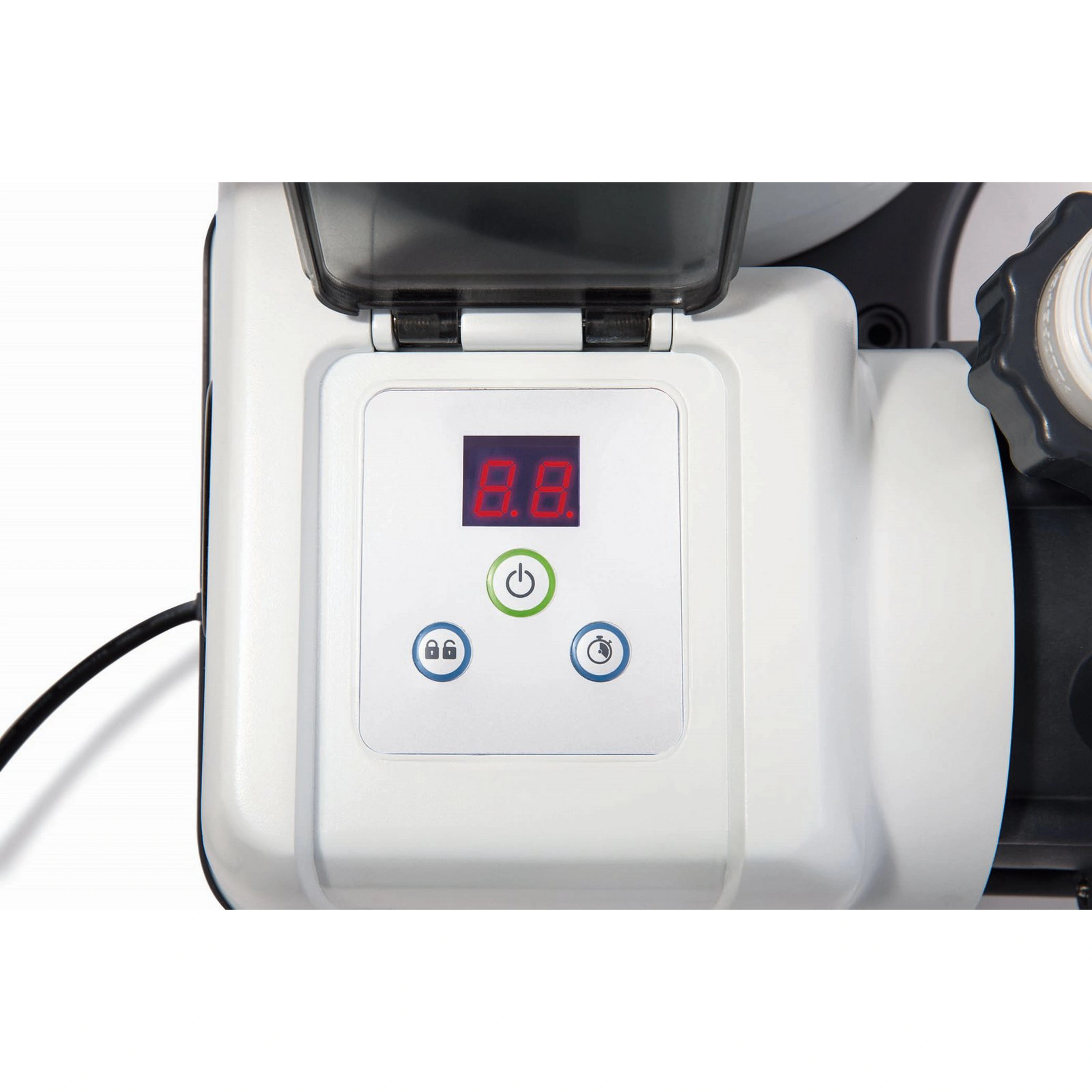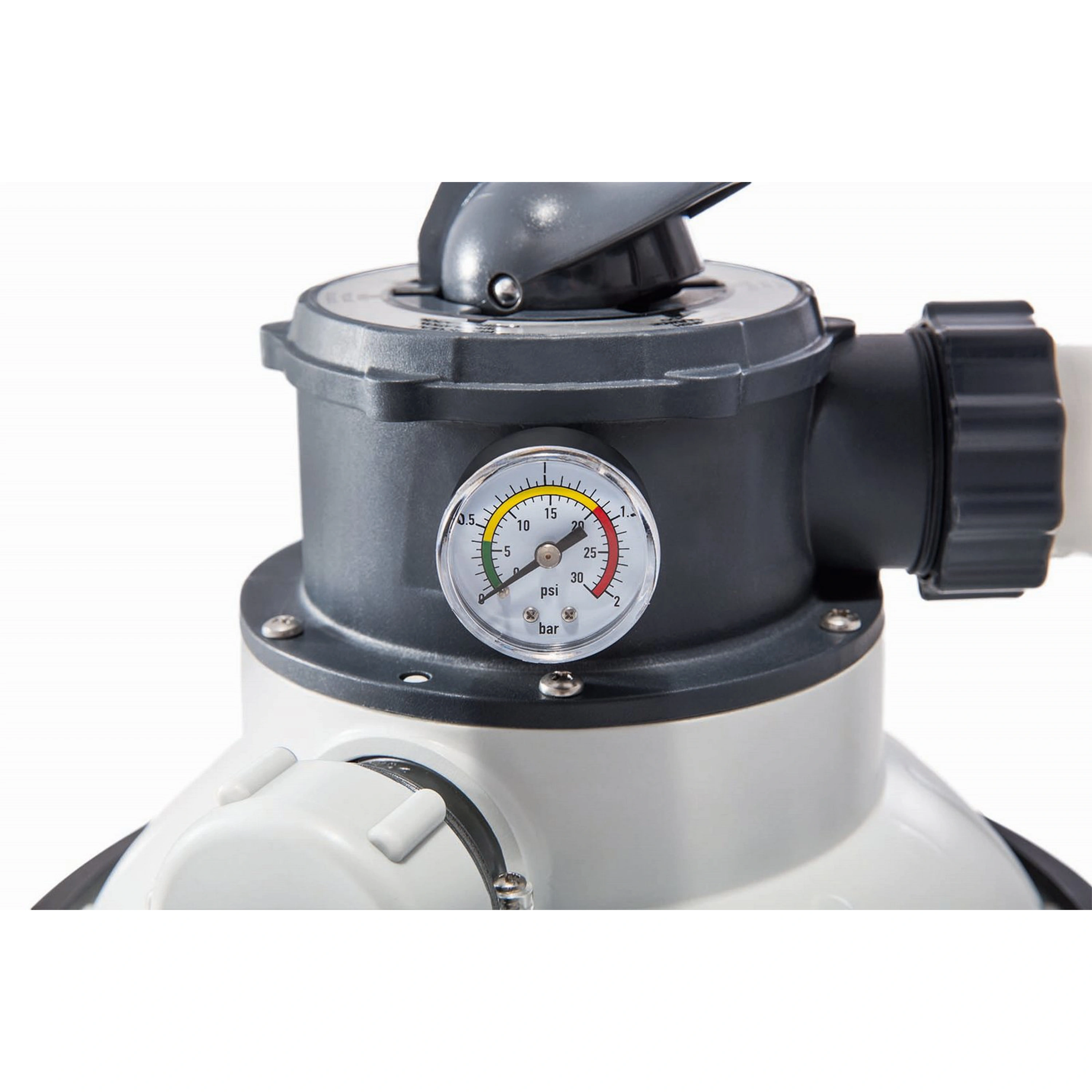 Bazénová voda je nasávána skrz filtr čerpadlem a vháněna do šesticestného ventilu a poté do vrchního prostoru nádoby. Voda je pak protlačena do spodního prostoru nádoby. Přes ventil se voda vrací zpět do bazénu. Do tohoto filtračního zařízení je potřeba 12 kg pískové náplně. Písková náplň není součástí balení