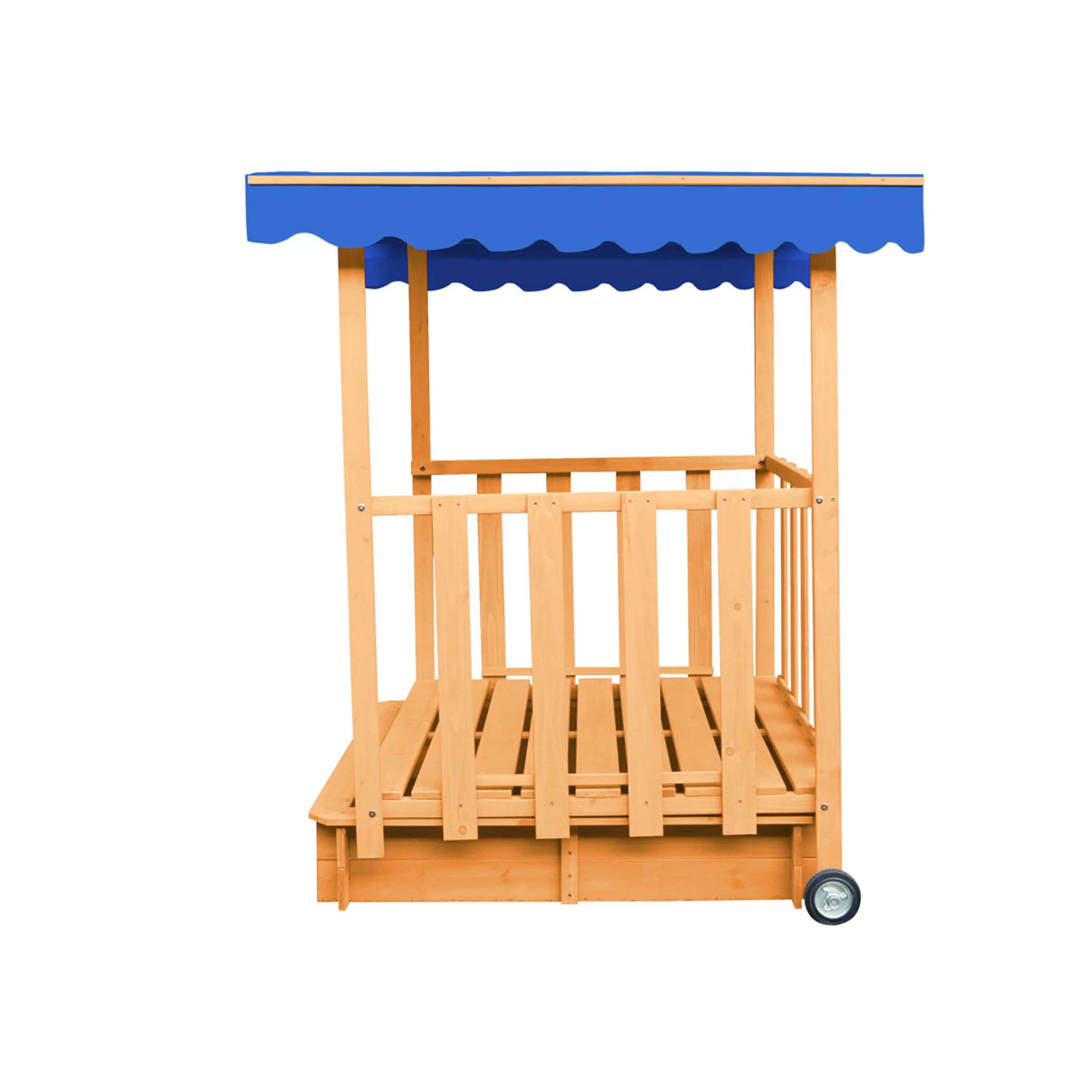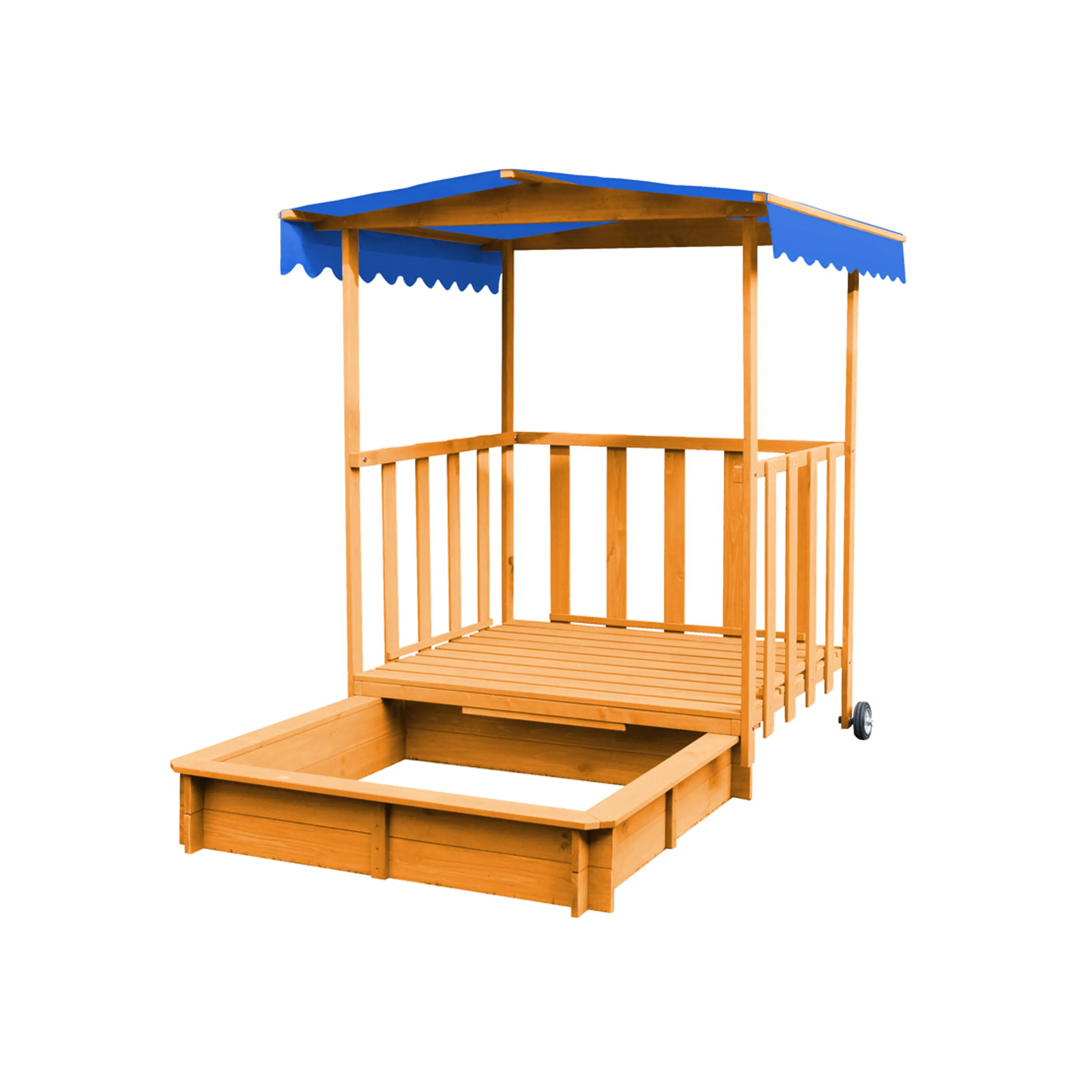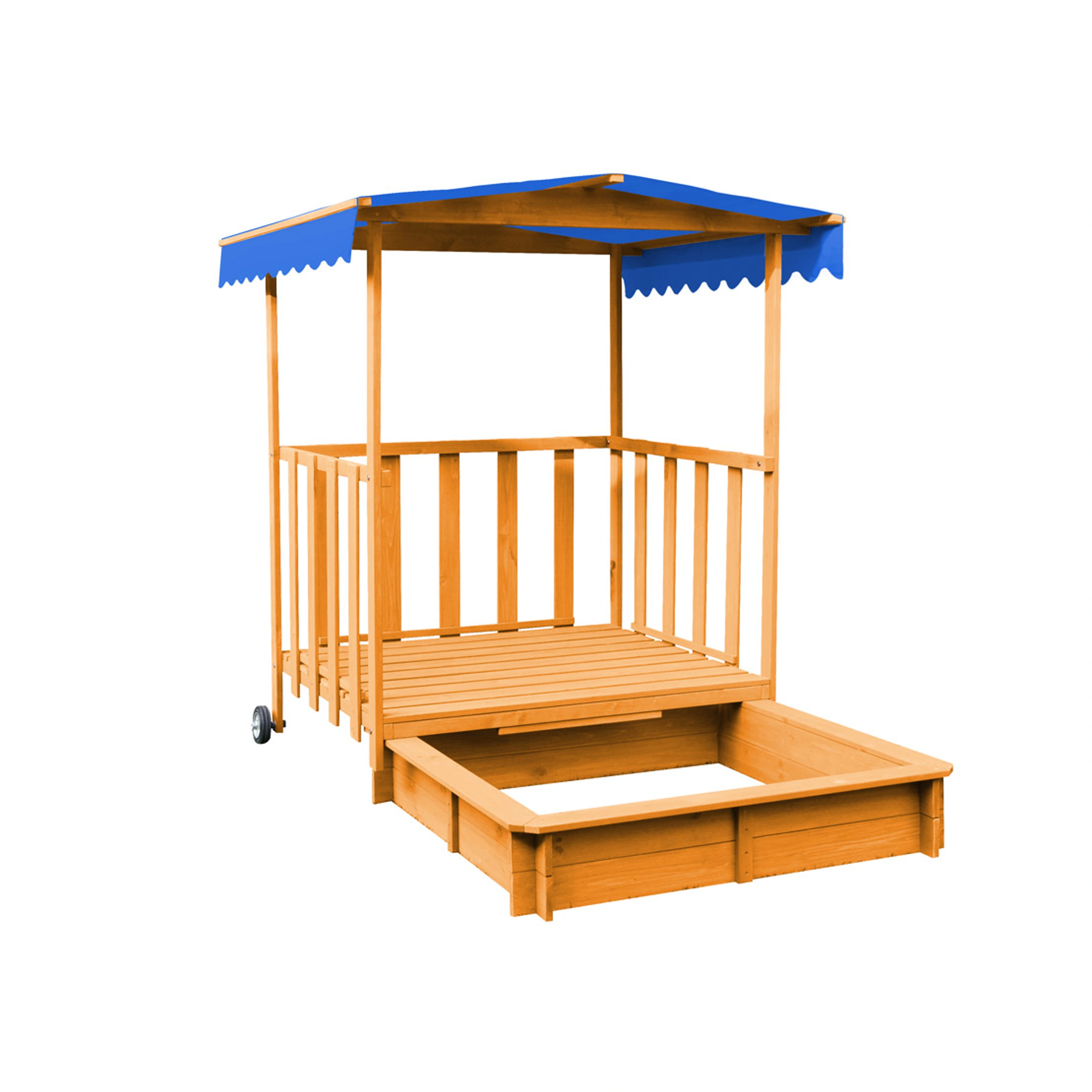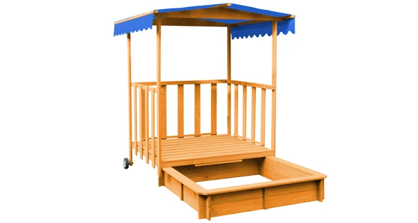 Dřevěné čtvercové pískoviště se sedátky, včetně altánku se zábradlím a nepromokavou střechou, která chrání před deštěm i sluncem. Altánek má kolečka a slouží zároveň jako kryt pískoviště, když není používáno. Altánek je také vybaven kolečky pro snažší manipulaci. Pískoviště nemá dno. Veškeré dřevo je povrchově upraveno pro delší životnost.