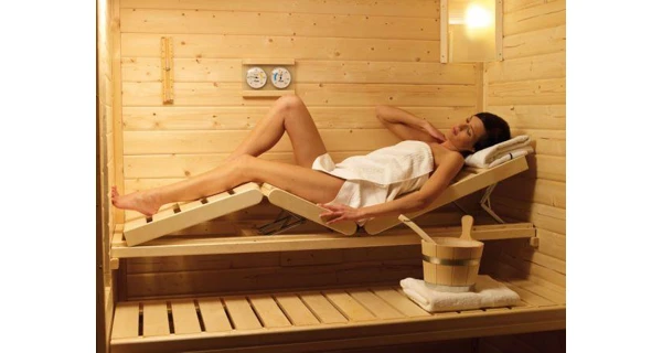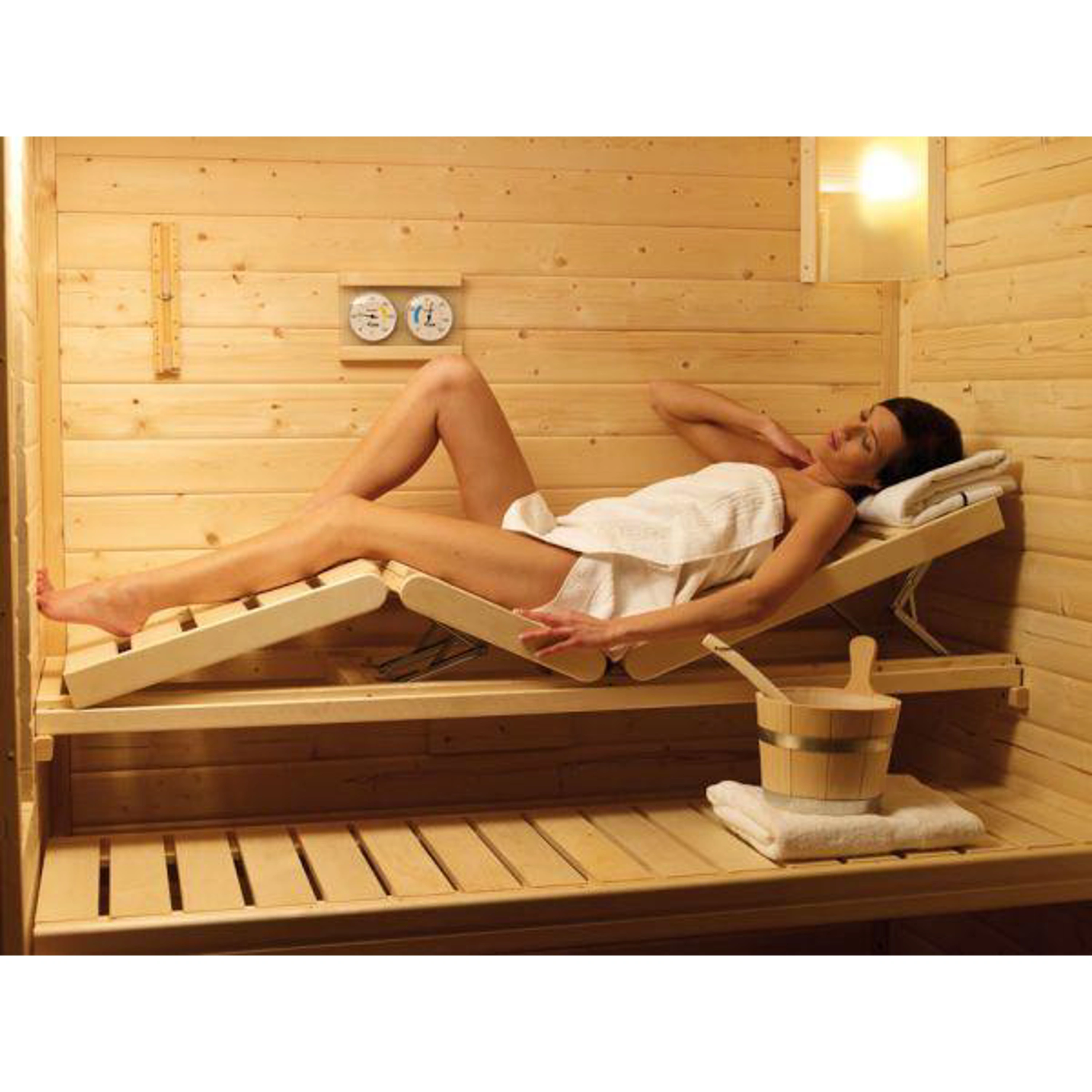 Třídílné dřevěné lehátko určené pro wellness centra i domácí sauny. Lehátko je snadno polohovatelné.