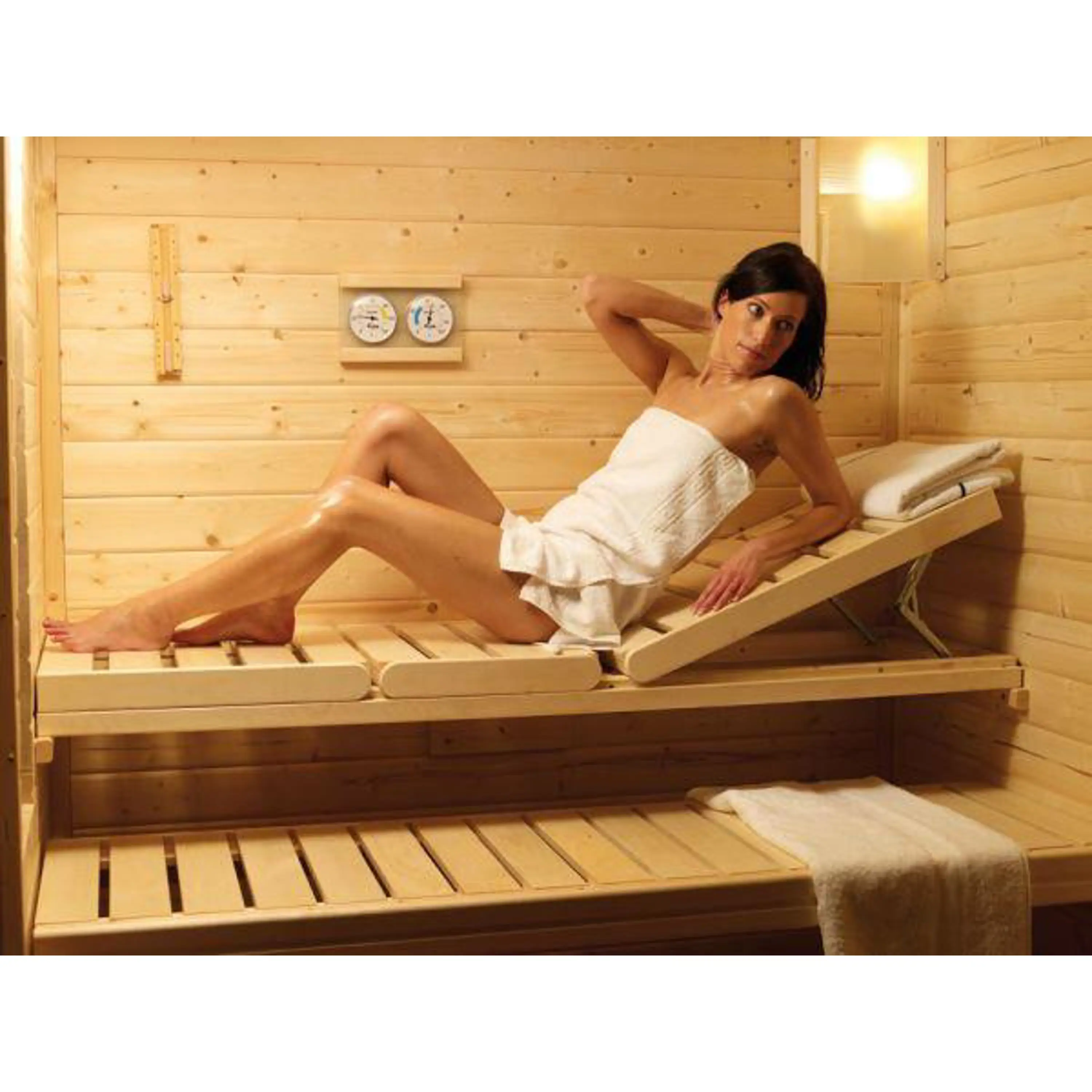 Třídílné dřevěné lehátko určené pro wellness centra i domácí sauny. Lehátko je snadno polohovatelné.