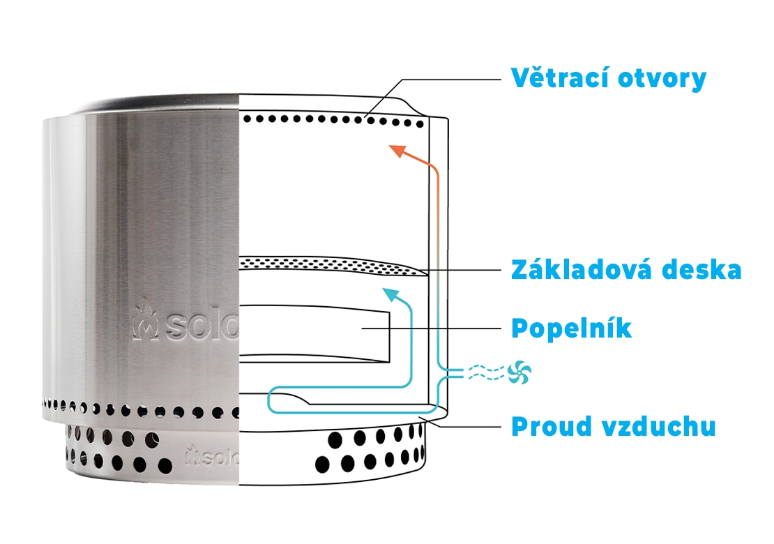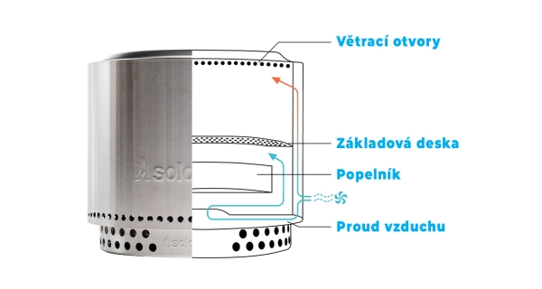 Větrací otvory v blízkosti horní části spalovací komory umožňují předehřátému kyslíku přivádět palivo do plamene, což vede k dokonalejšímu spalování a žhavějšímu ohni s menším množstvím kouře.
