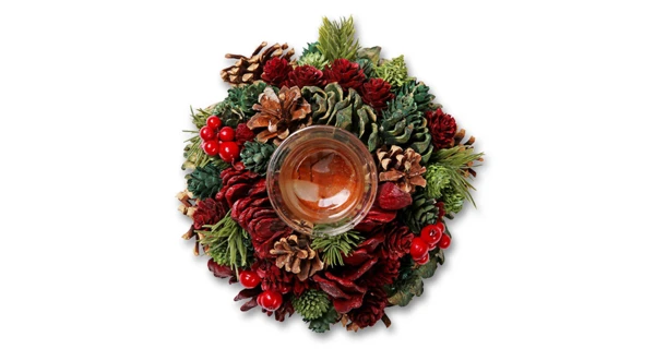 Stojan na svíčku v tradičním pojetí kombinuje červenou a zelenou barvu. Je zdoben šiškami, větvemi a červenými plody. Stojánek na svíčku je skleněný.