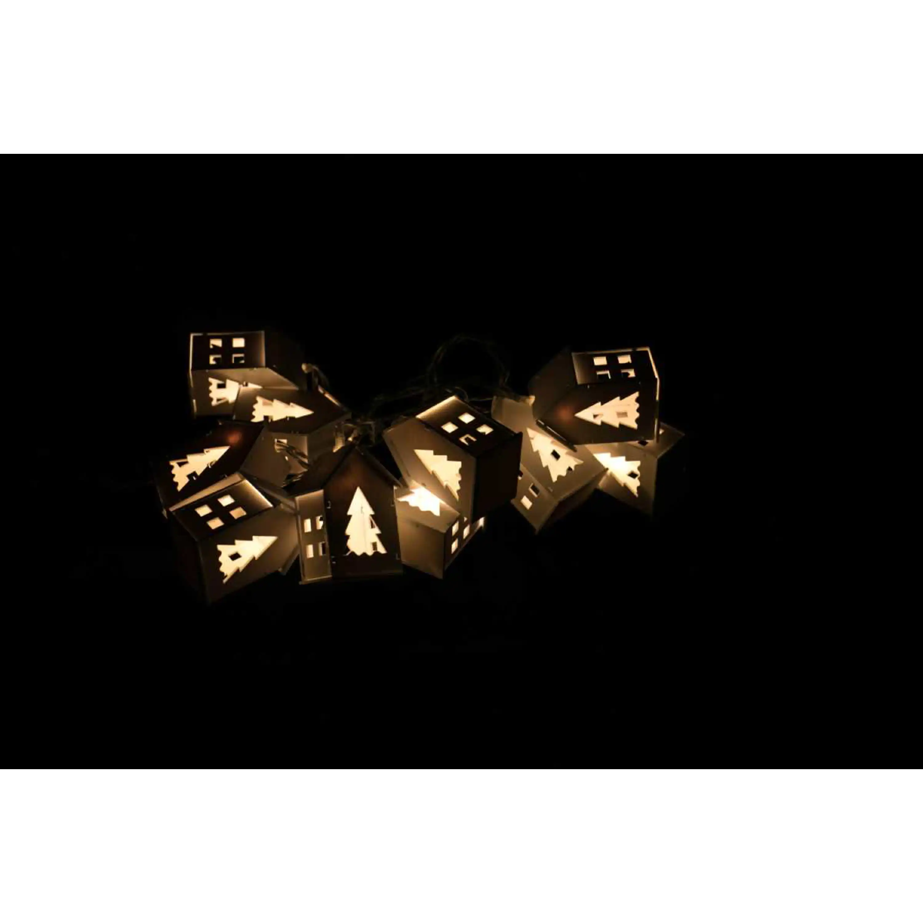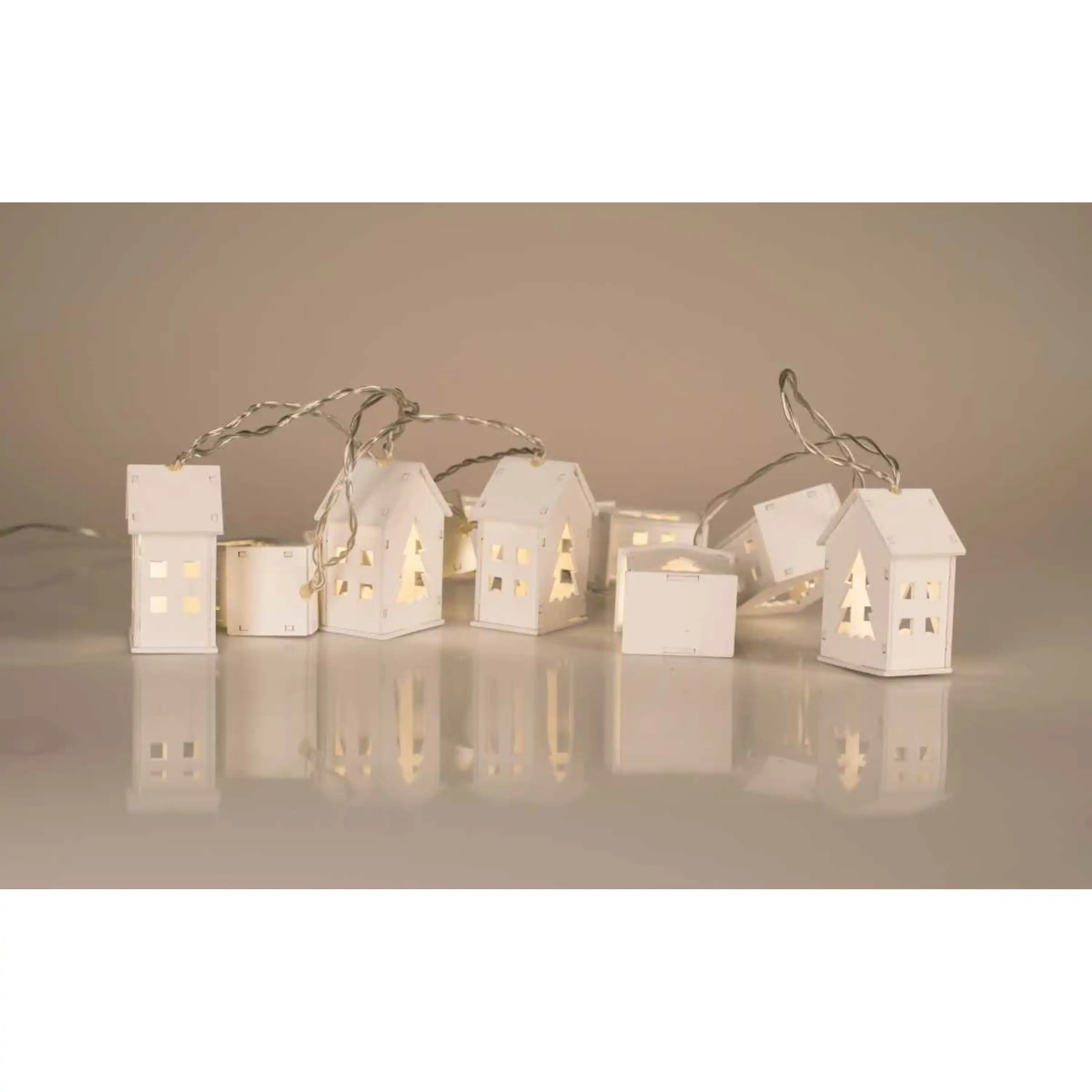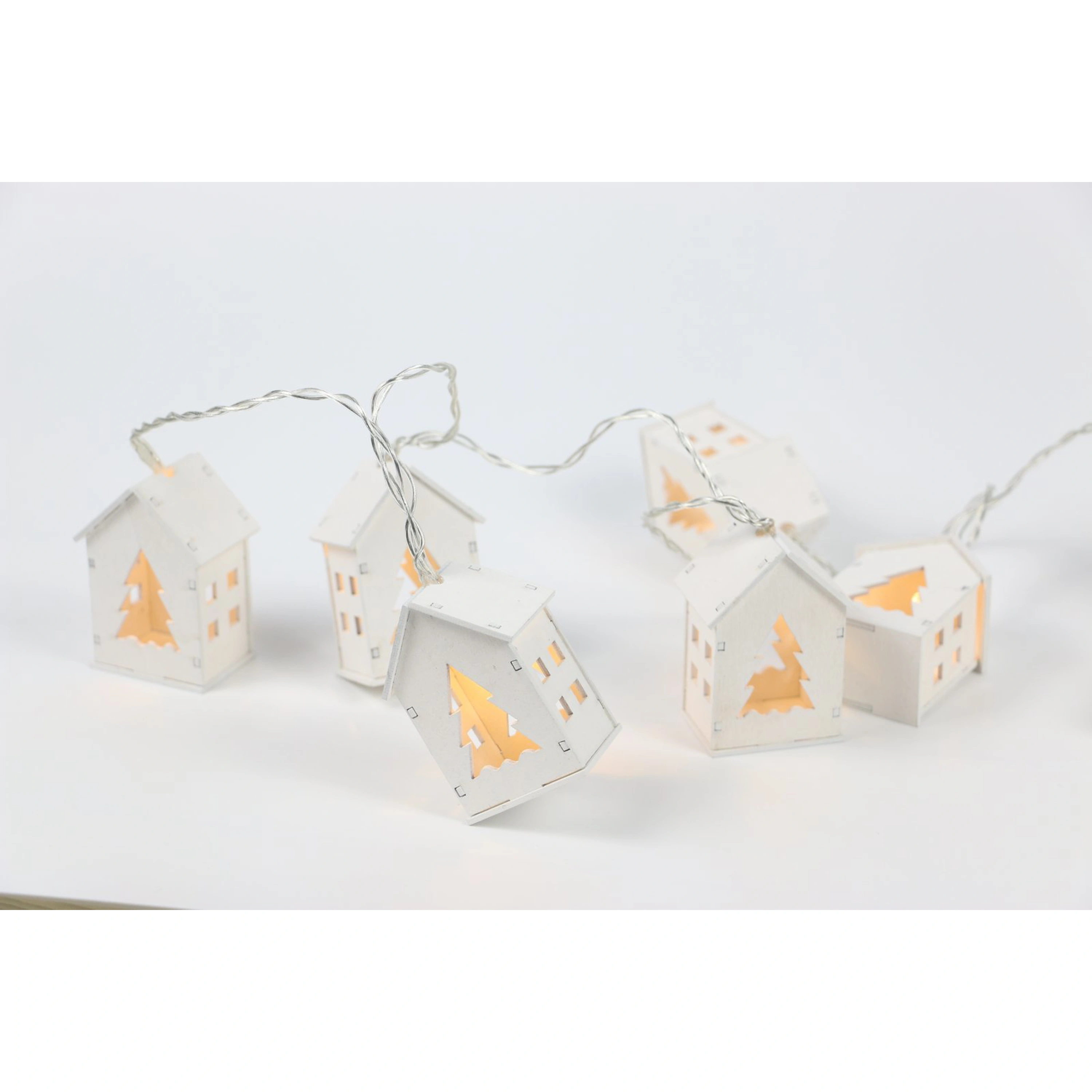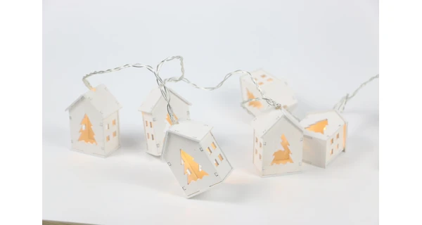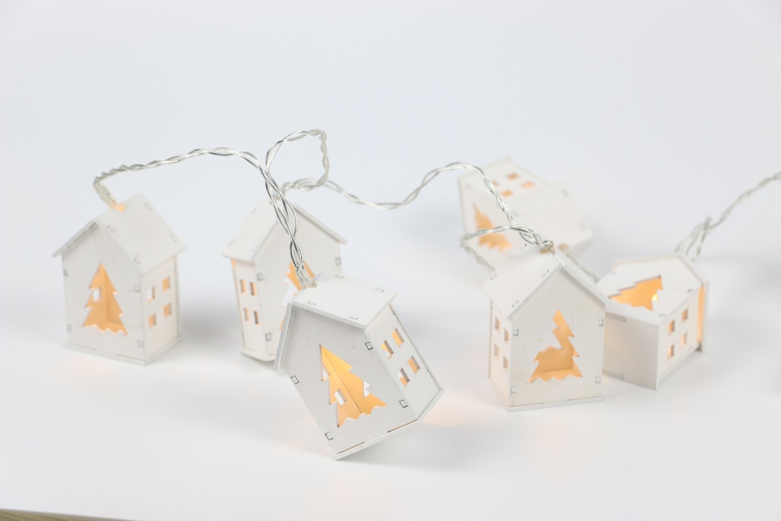 Dřevěný řetěz s domečky v bílém designu. Díky zabudovaným diodám přímo v domečcích rozjasní tento krásný řetěz vaší místnost. Řetěz má 10 domečků, které září teplou bílou barvou.