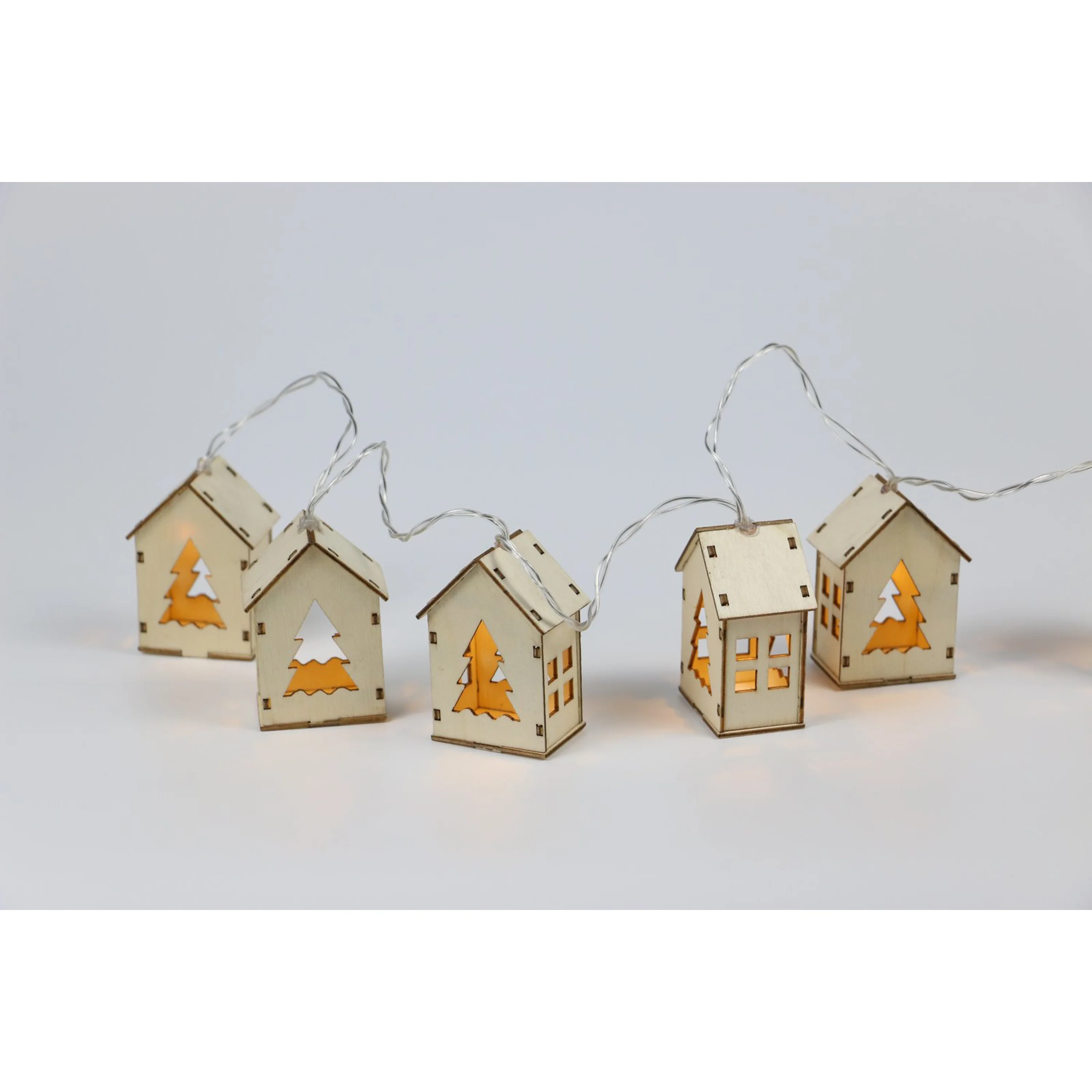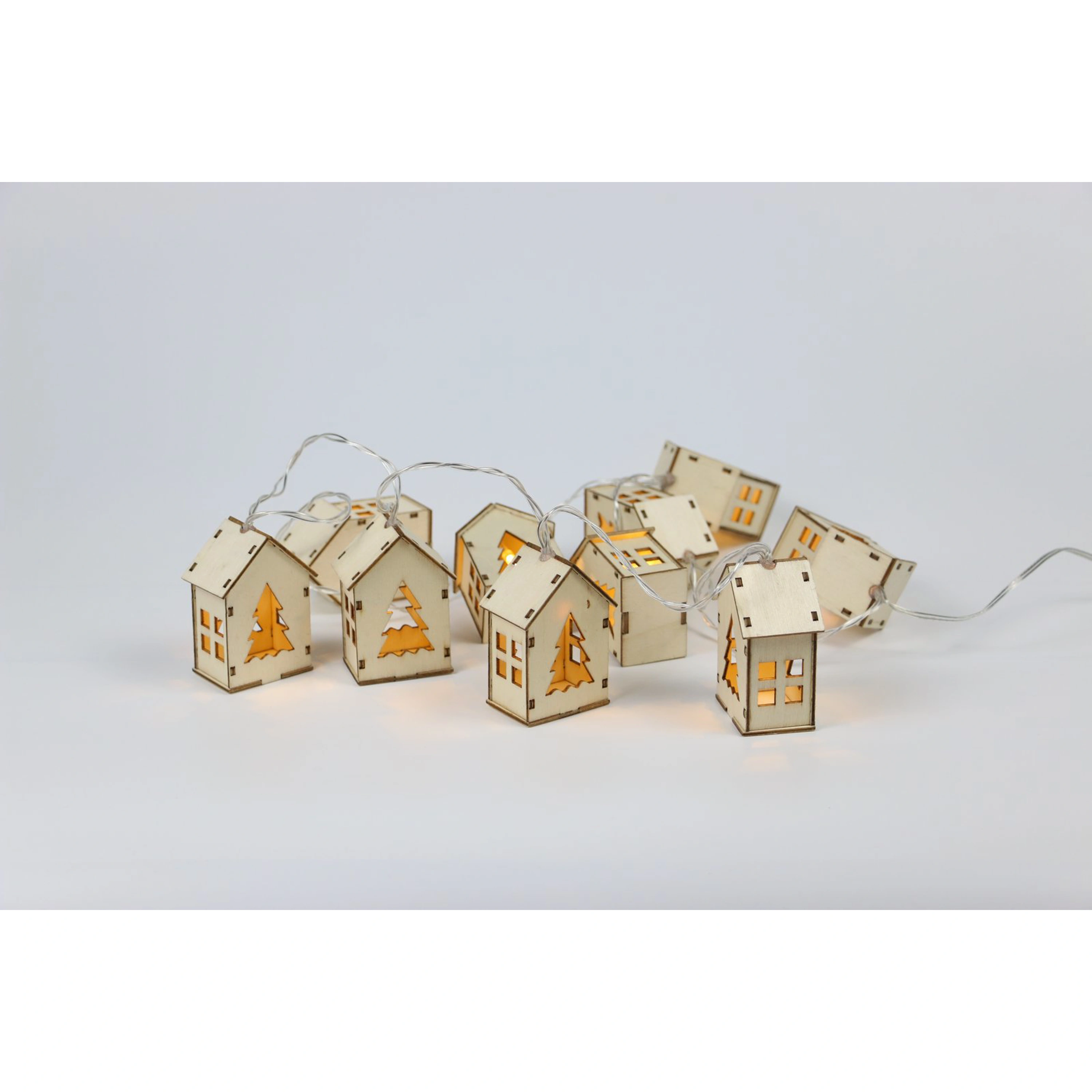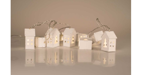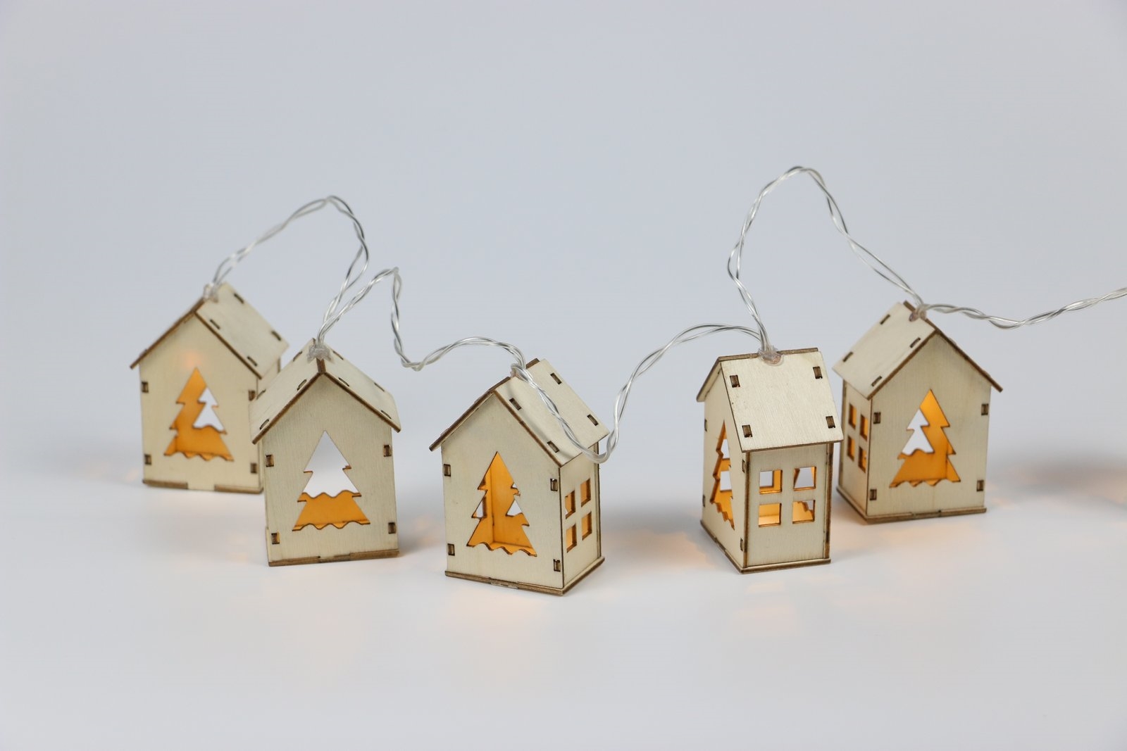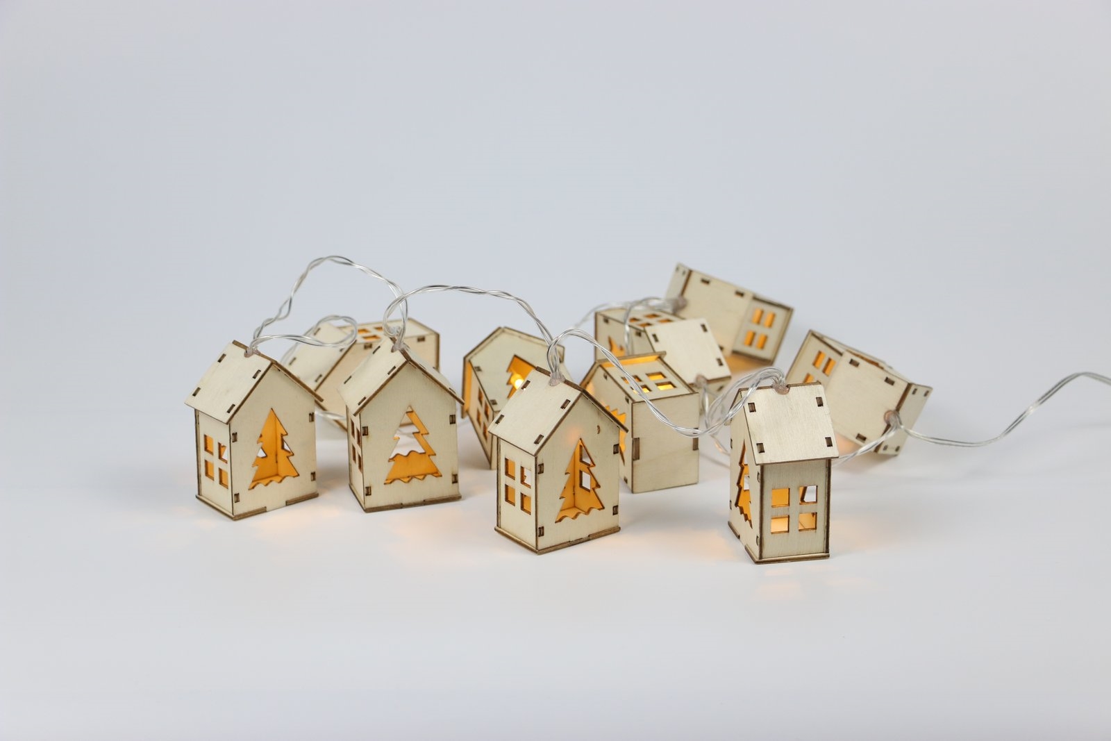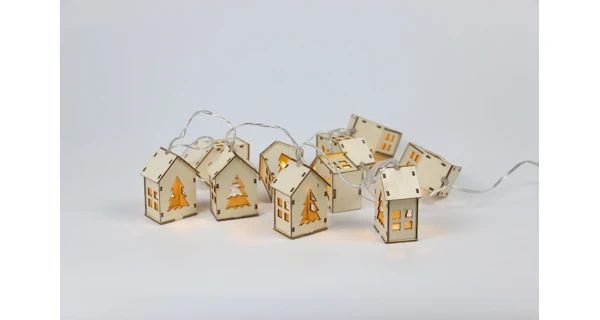 Dřevěný řetěz s domečky v přírodním designu. Díky zabudovaným diodám přímo v domečcích rozjasní tento krásný řetěz vaší místnost. Řetěz má 10 domečků, které září teplou bílou barvou.
