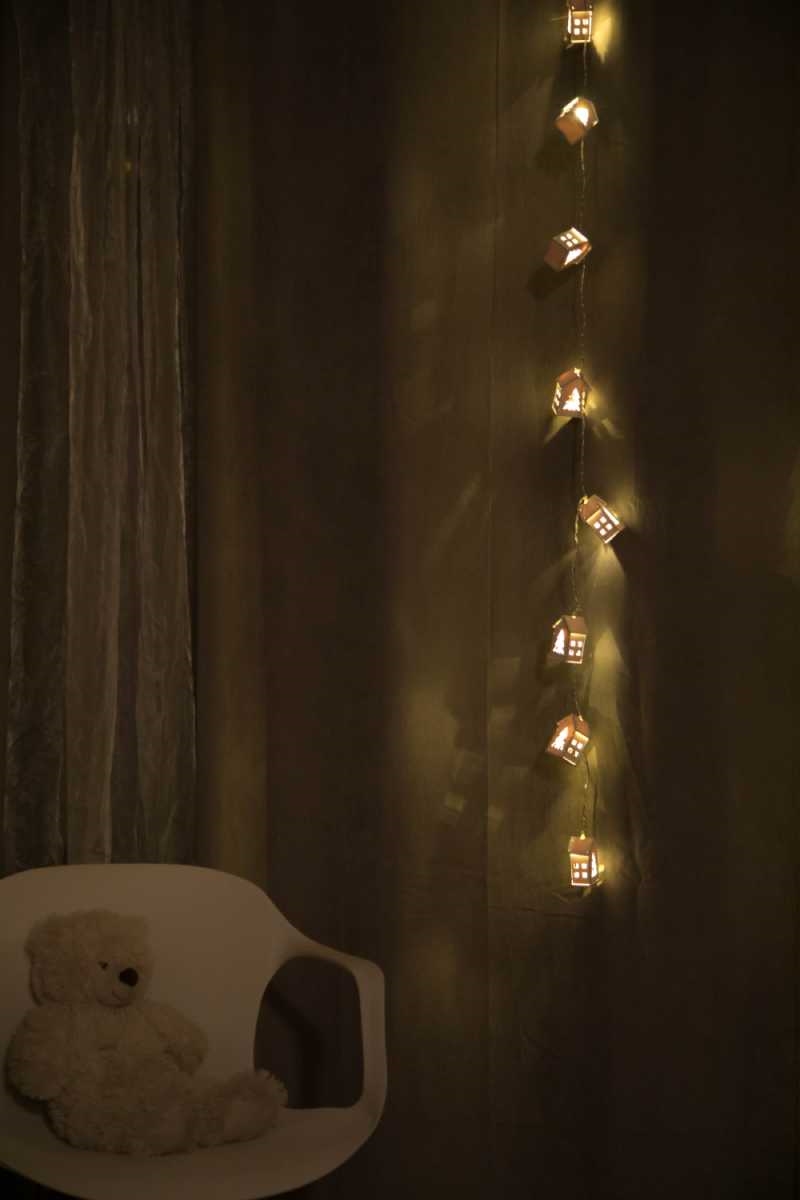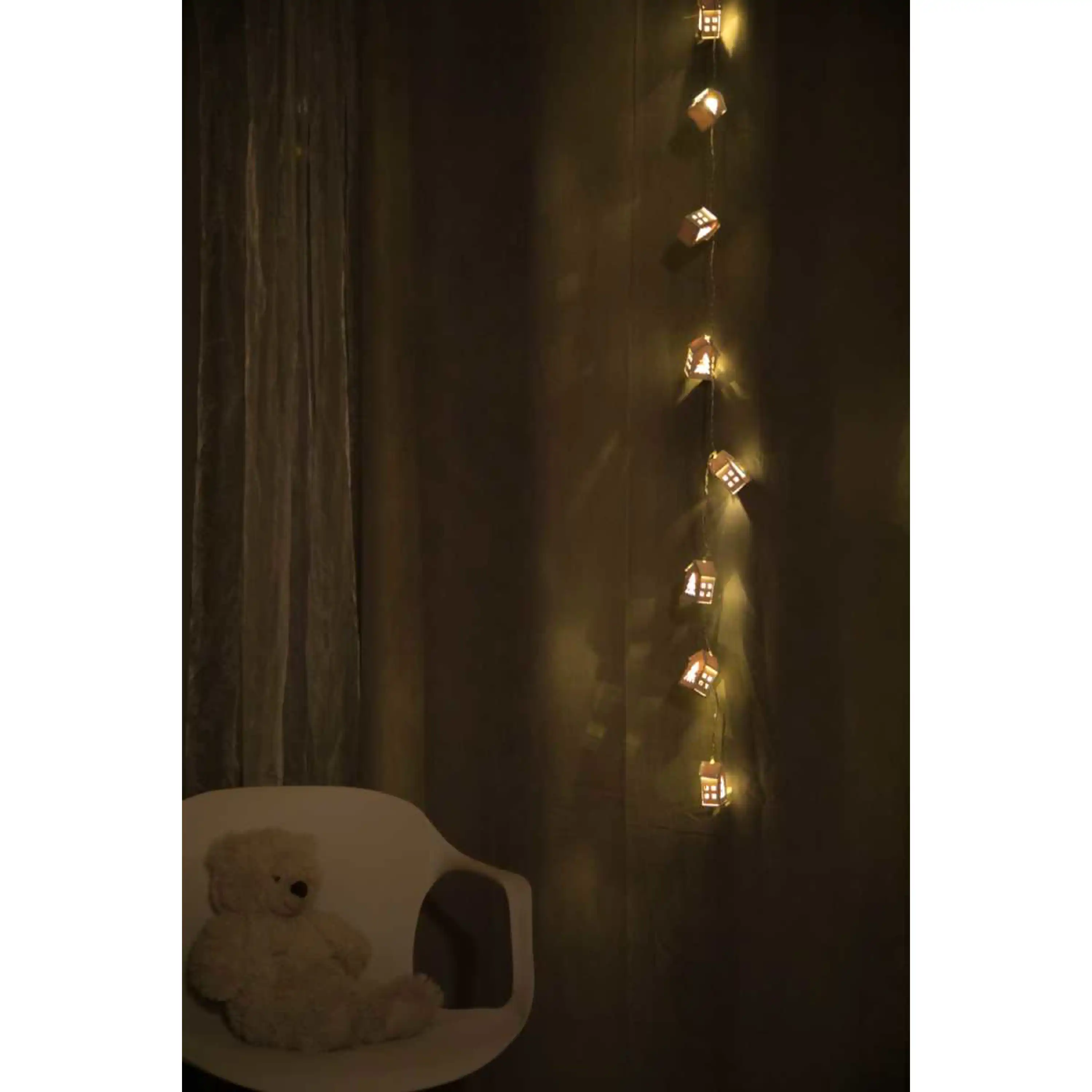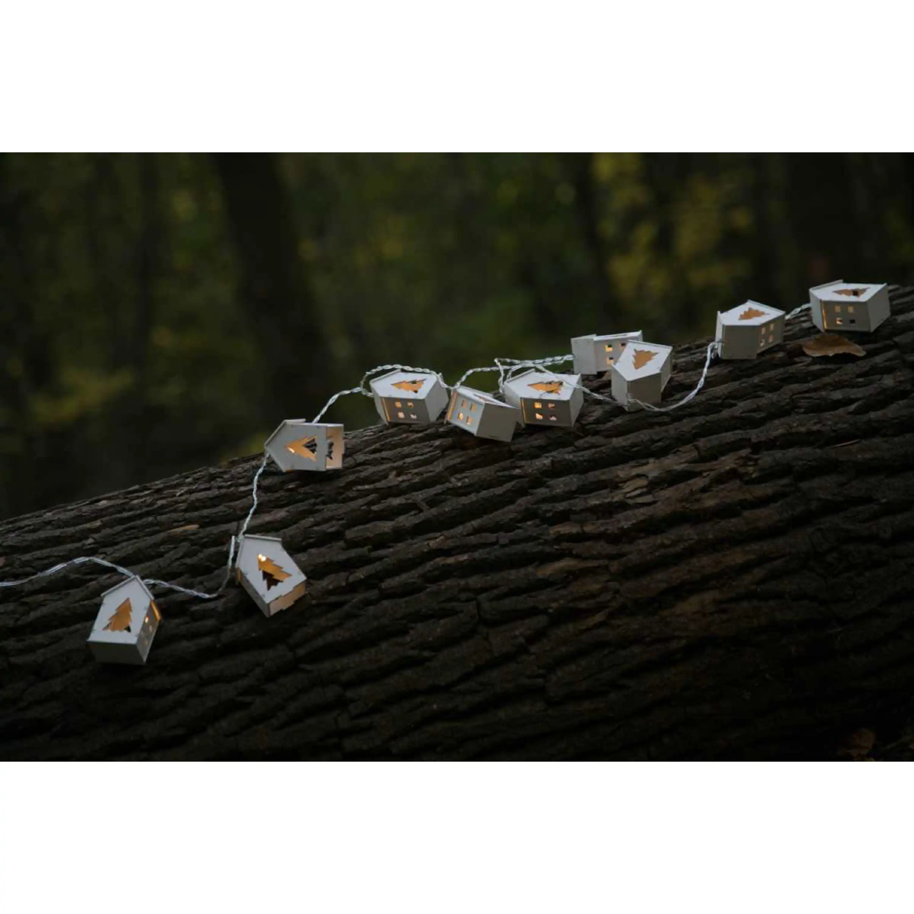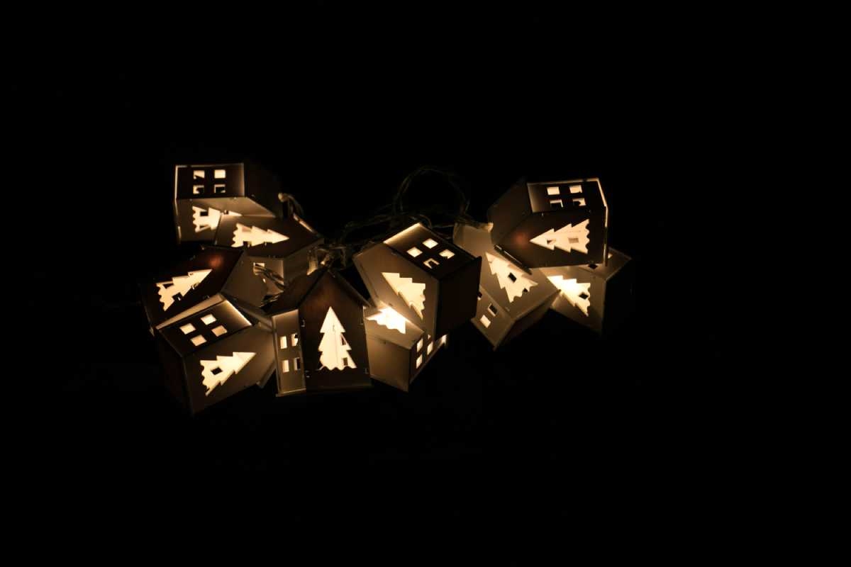 Dřevěný řetěz s domečky v přírodním designu. Díky zabudovaným diodám přímo v domečcích rozjasní tento krásný řetěz vaší místnost. Řetěz má 10 domečků, které září teplou bílou barvou.
