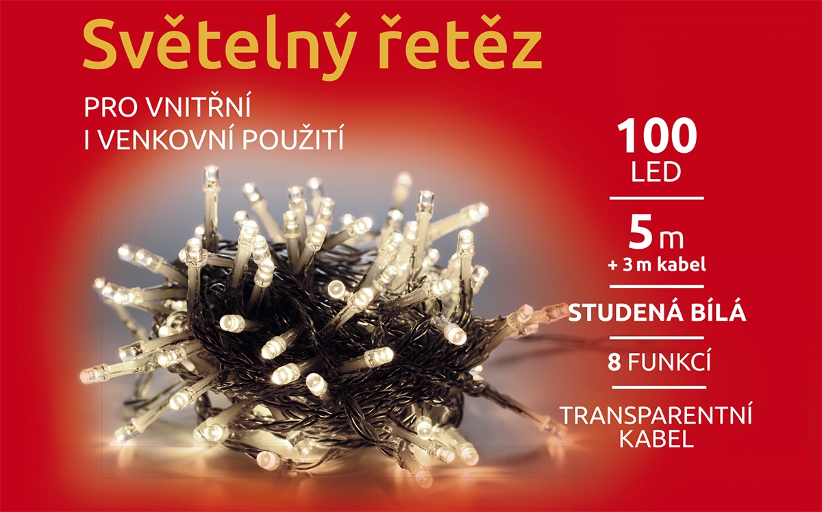 Světelný řetěz ozáří váš interiér i exteriér. Vhodný na okno, stromek, balkón i dům. Díky LED diodám ušetříte až 90 % energie oproti klasickým žárovkám. Průměrná životnost LED diody je cca 2 000 hodin svícení. Studená bílá barva osvětlení, se světelnými efekty - 8 módů.