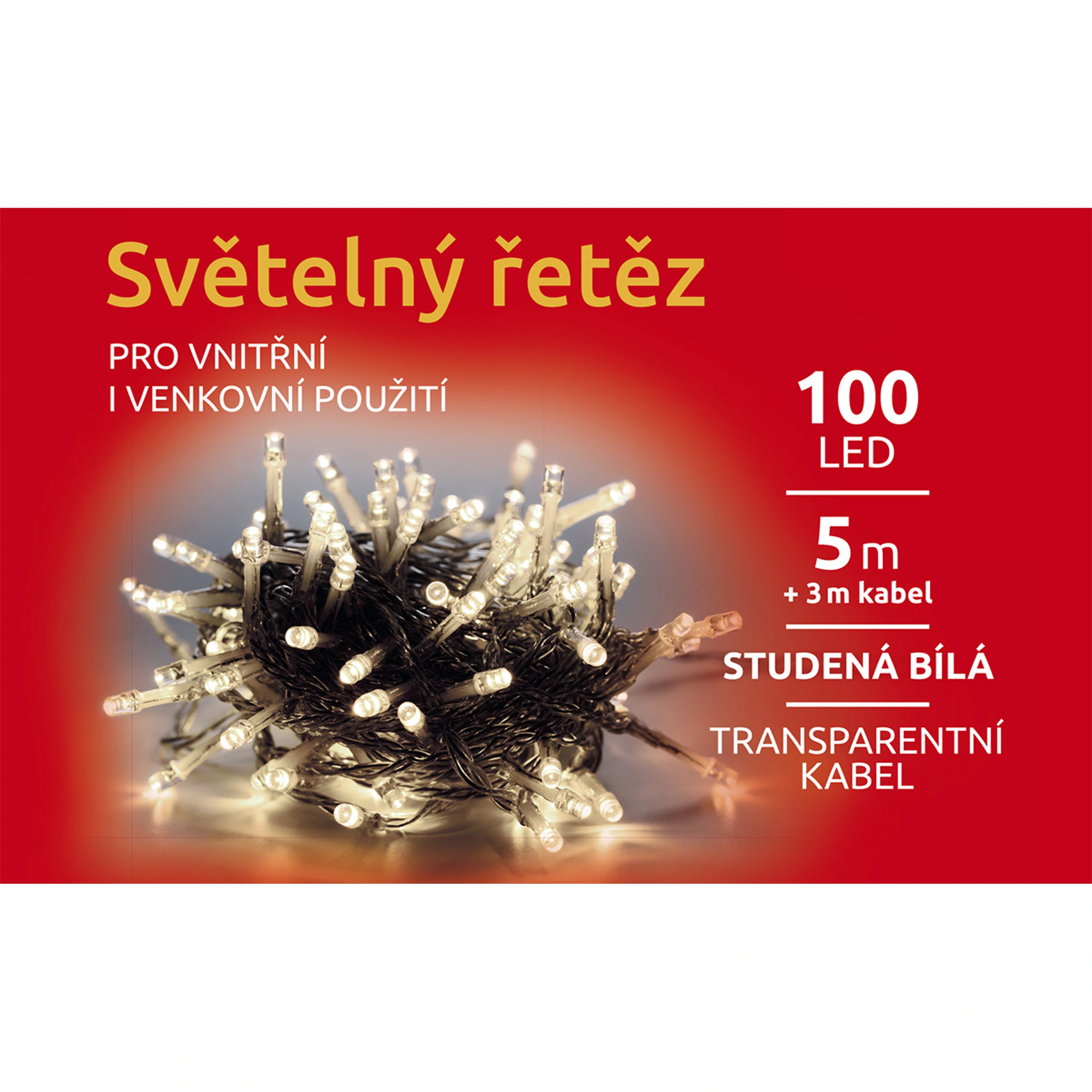 Světelný řetěz ozáří váš interiér i exteriér. Vhodný na okno, stromek, balkón i dům. Díky LED diodám ušetříte až 90 % energie oproti klasickým žárovkám. Průměrná životnost LED diody je cca 2 000 hodin svícení. Studená bílá barva osvětlení, bez světelných efektů - pouze svítí.