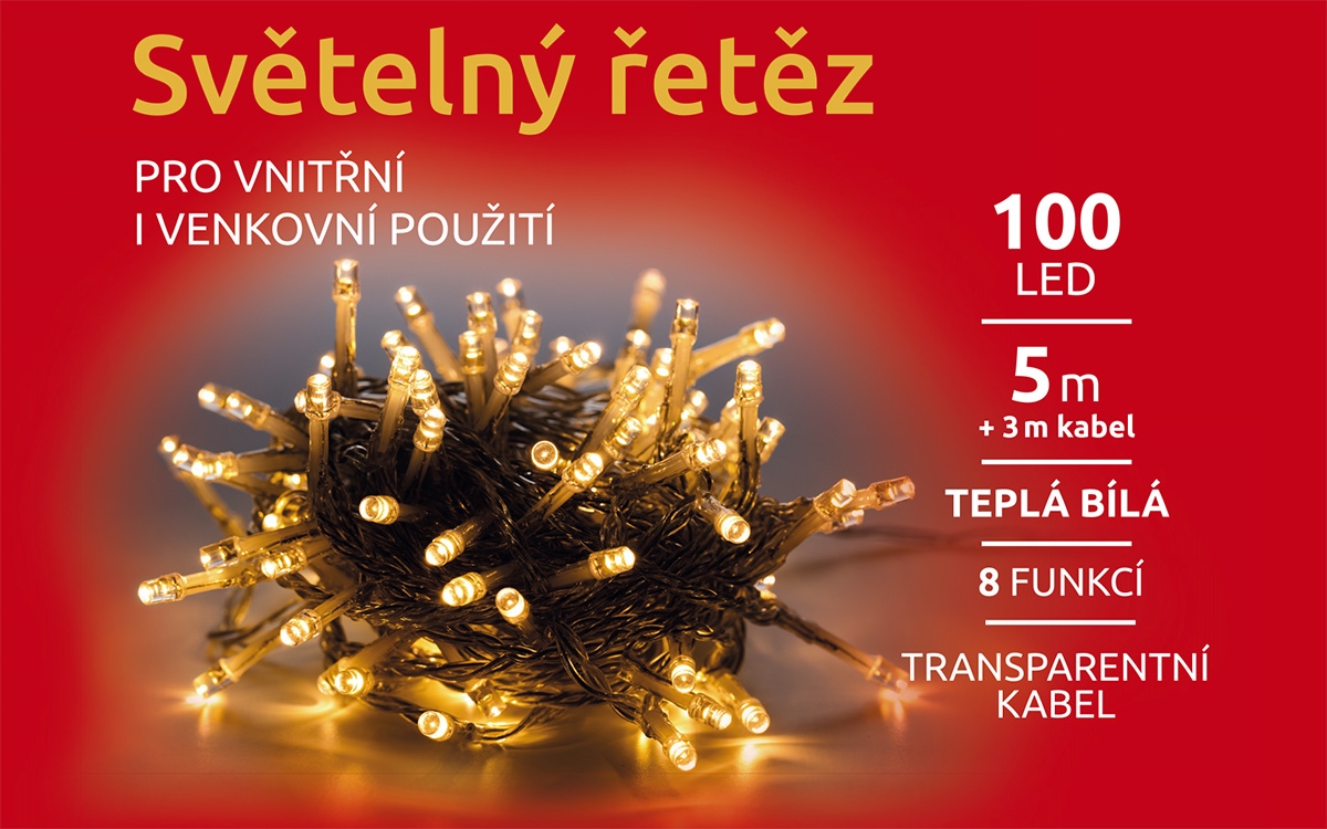 Světelný řetěz ozáří váš interiér i exteriér. Vhodný na okno, stromek, balkón i dům. Díky LED diodám ušetříte až 90 % energie oproti klasickým žárovkám. Průměrná životnost LED diody je cca 2 000 hodin svícení. Teplá bílá barva osvětlení, se světelnými efekty - 8 módů.