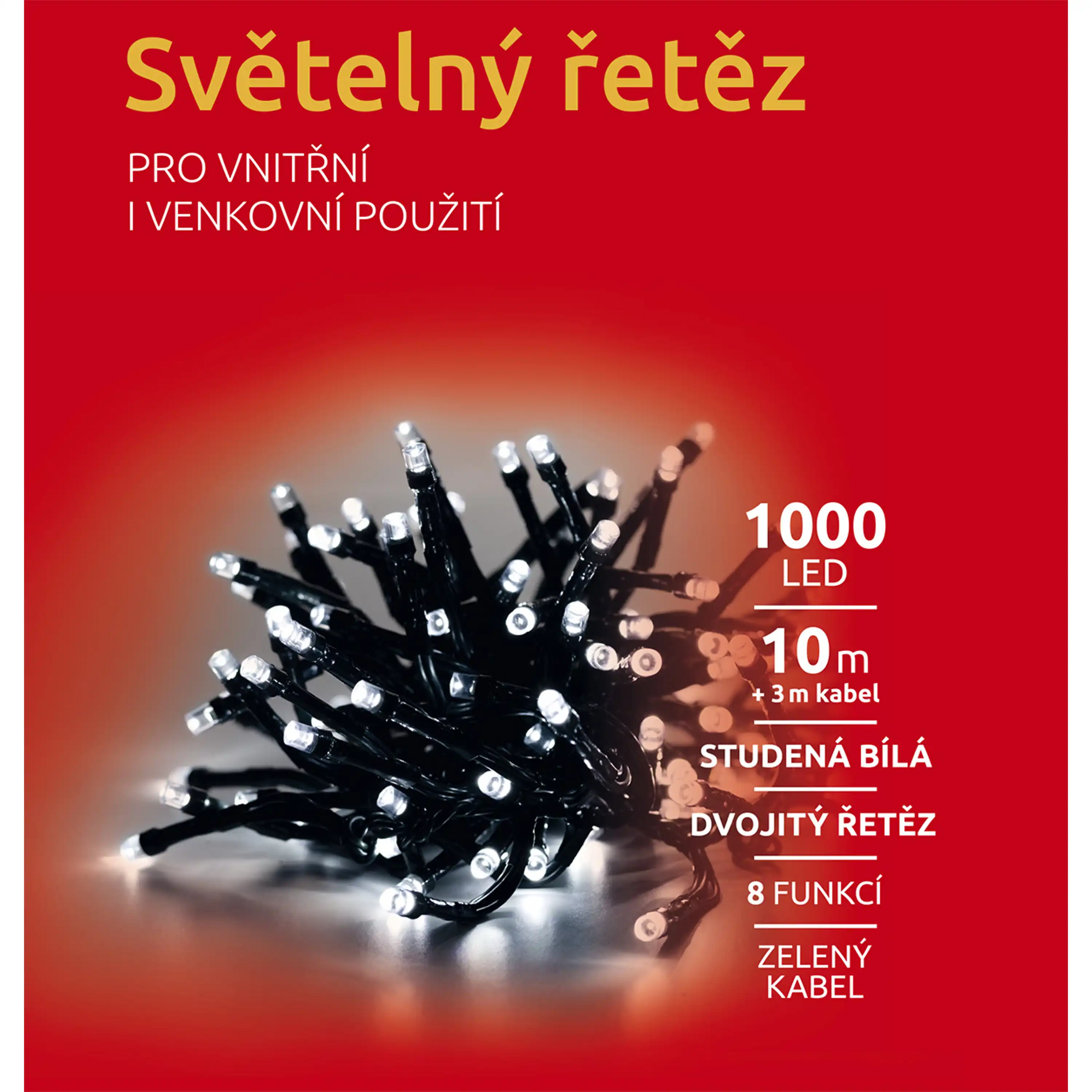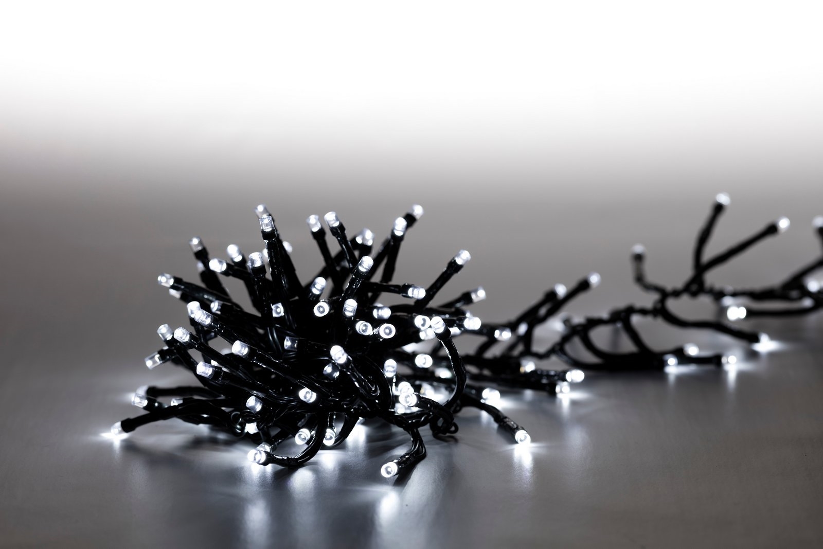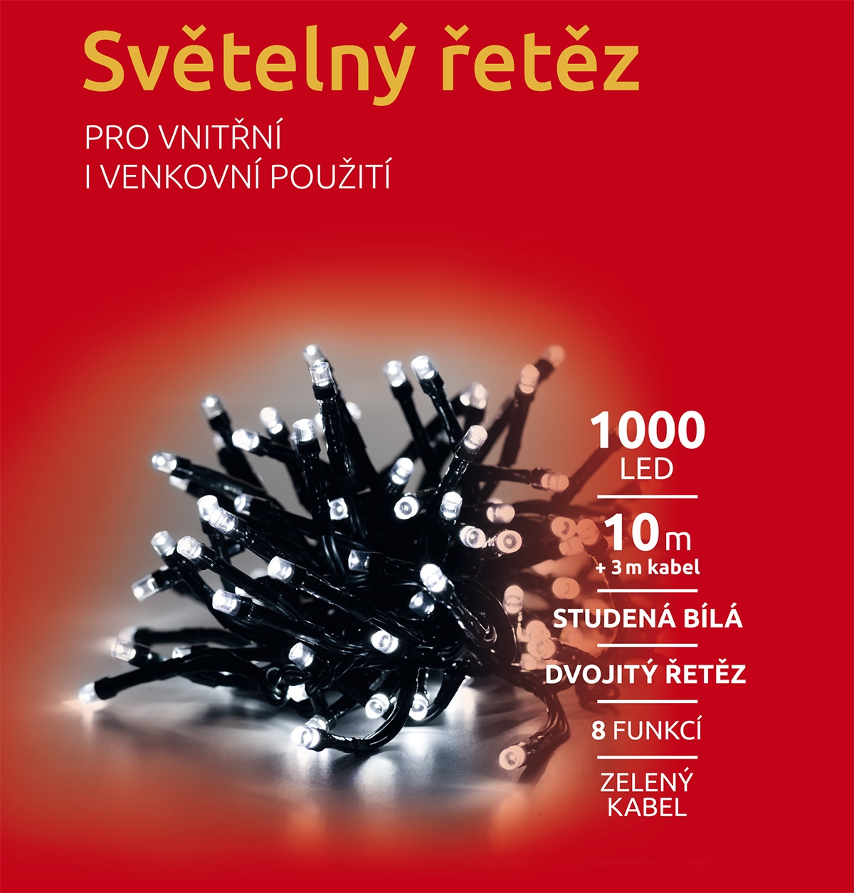 Dvojitý světelný řetěz ozáří váš interiér i exteriér. Vhodný na okno, stromek, balkón i dům. Díky LED diodám ušetříte až 90 % energie oproti klasickým žárovkám. Průměrná životnost LED diody je cca 2 000 hodin svícení. Studená bílá barva osvětlení, se světelnými efekty - 8 módů.