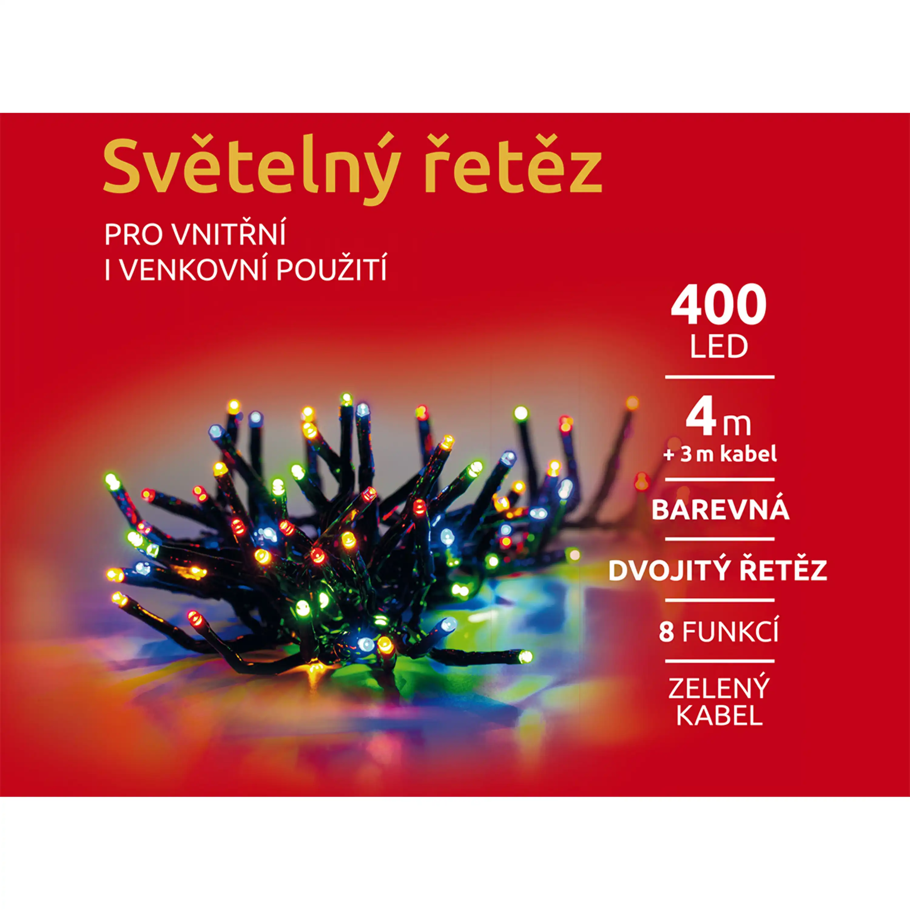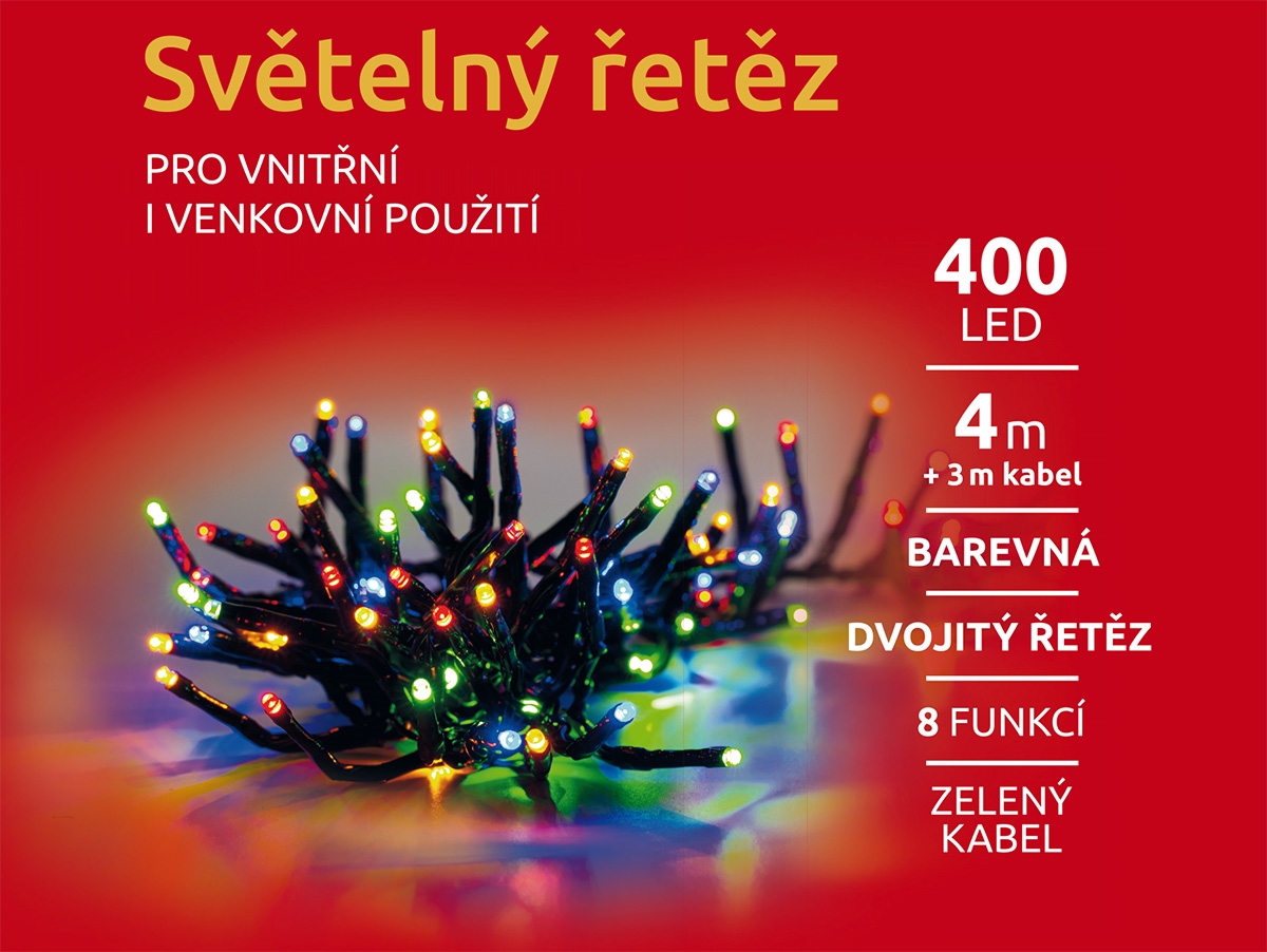 Dvojitý světelný řetěz ozáří váš interiér i exteriér. Vhodný na okno, stromek, balkón i dům. Díky LED diodám ušetříte až 90 % energie oproti klasickým žárovkám. Průměrná životnost LED diody je cca 2 000 hodin svícení. Různé barvy osvětlení, se světelnými efekty - 8 módů.