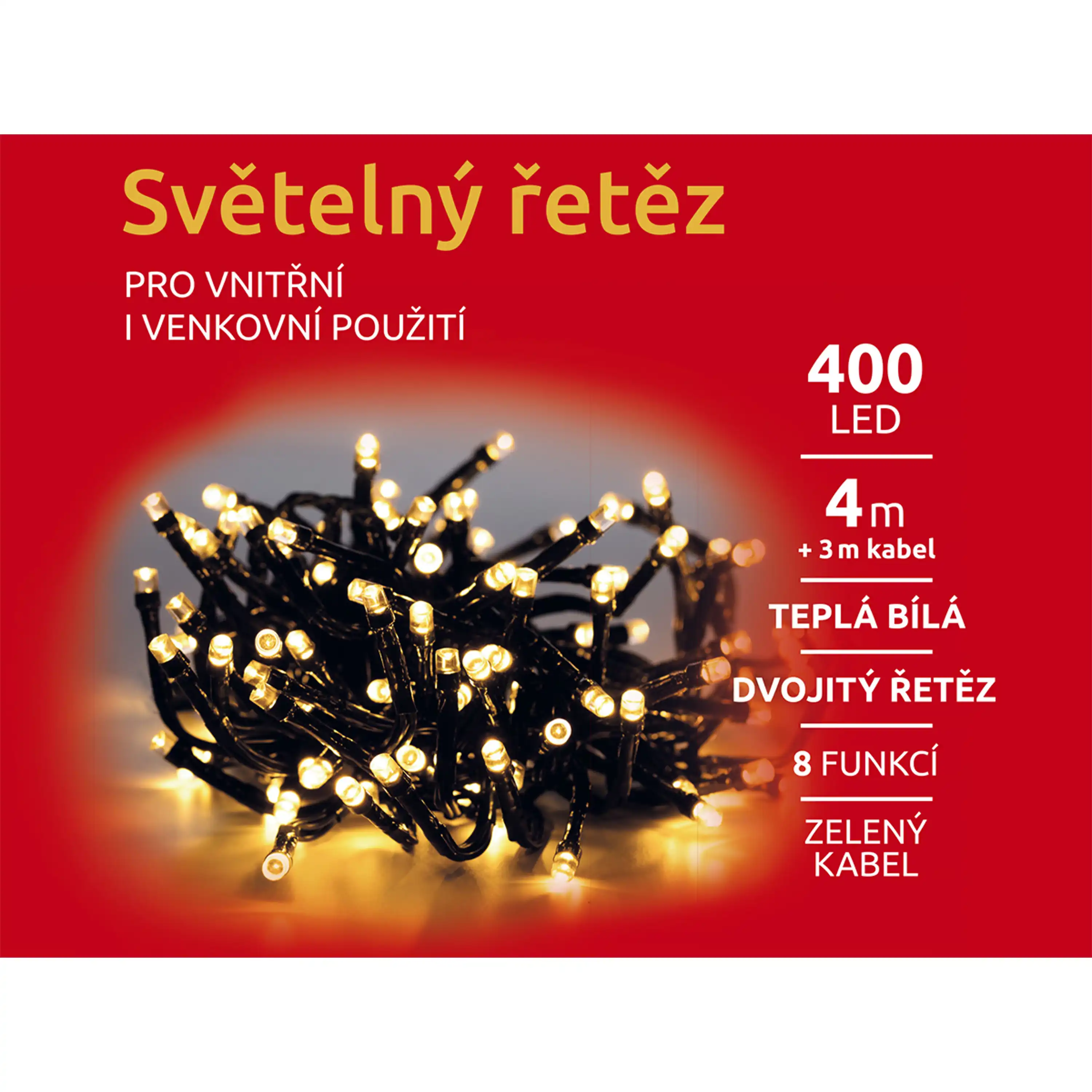Dvojitý světelný řetěz ozáří váš interiér i exteriér. Vhodný na okno, stromek, balkón i dům. Díky LED diodám ušetříte až 90 % energie oproti klasickým žárovkám. Průměrná životnost LED diody je cca 2 000 hodin svícení. Teplá bílá barva osvětlení, se světelnými efekty - 8 módů.