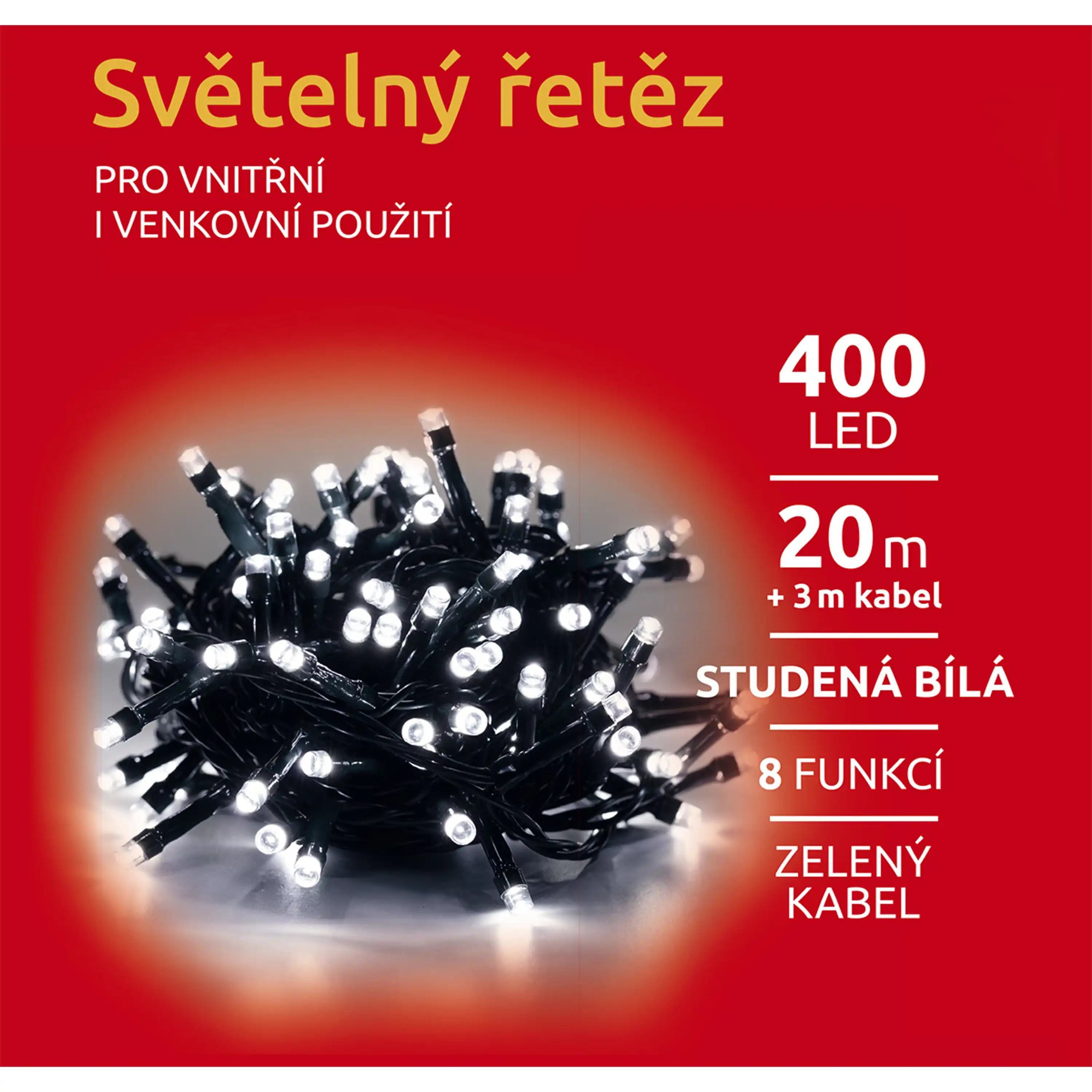 Světelný řetěz ozáří váš interiér i exteriér. Vhodný na okno, stromek, balkón i dům. Díky LED diodám ušetříte až 90 % energie oproti klasickým žárovkám. Průměrná životnost LED diody je cca 2 000 hodin svícení. Studená bílá barva osvětlení, se světelnými efekty - 8 módů.