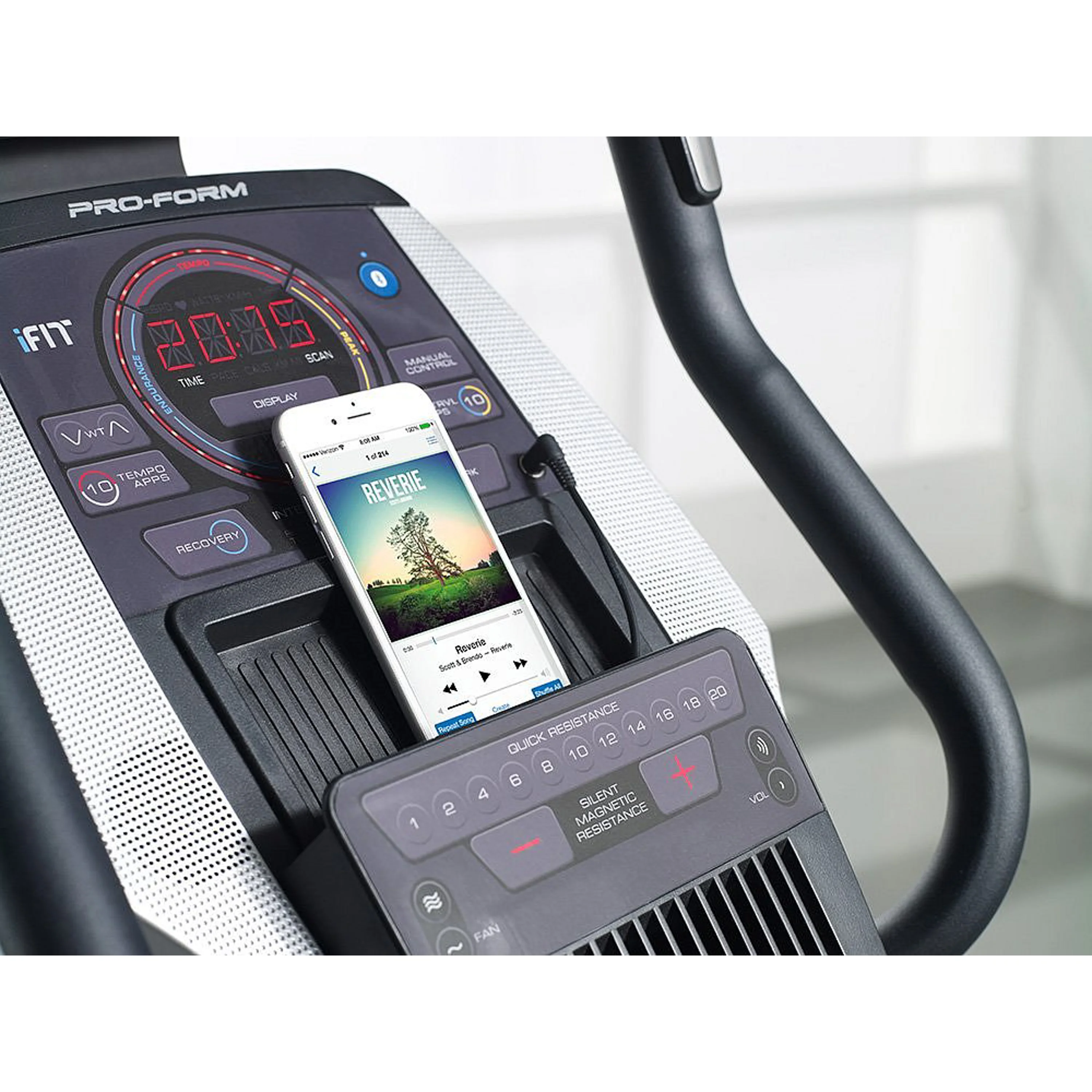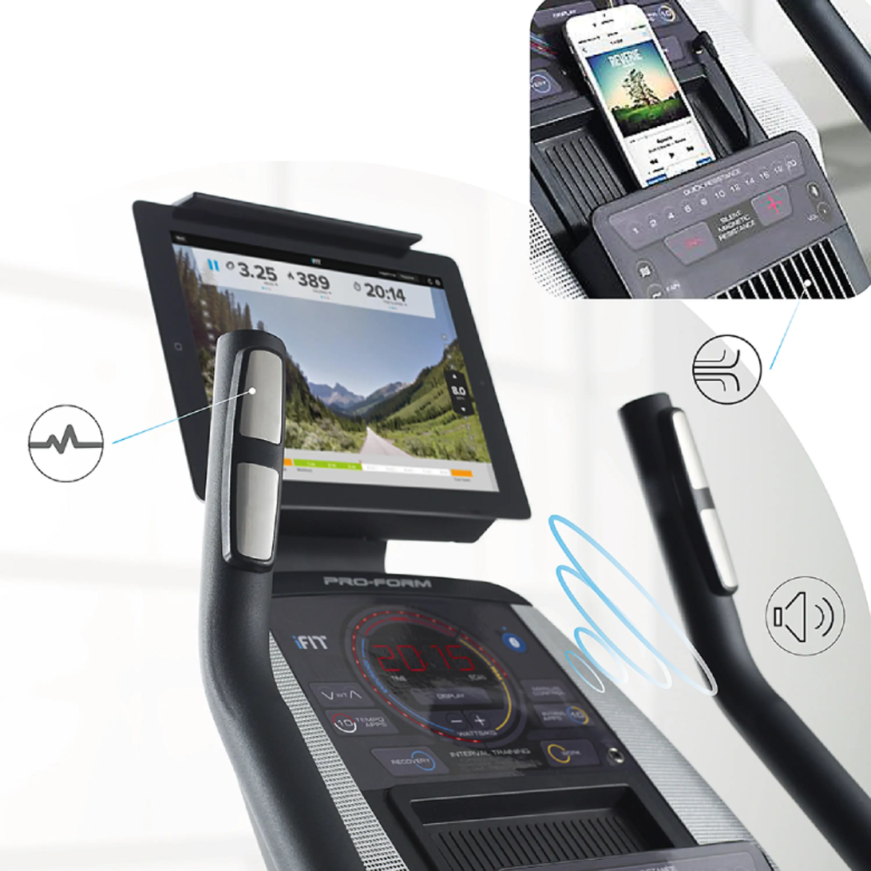Computer rotopedu PROFORM 225 CSX disponuje držákem na tablet/smartphone, bluetooth přijímačem s možností připojení k iFIT aplikaci a CoolAire ventilátorem pro maximální osvěžení při tréninku