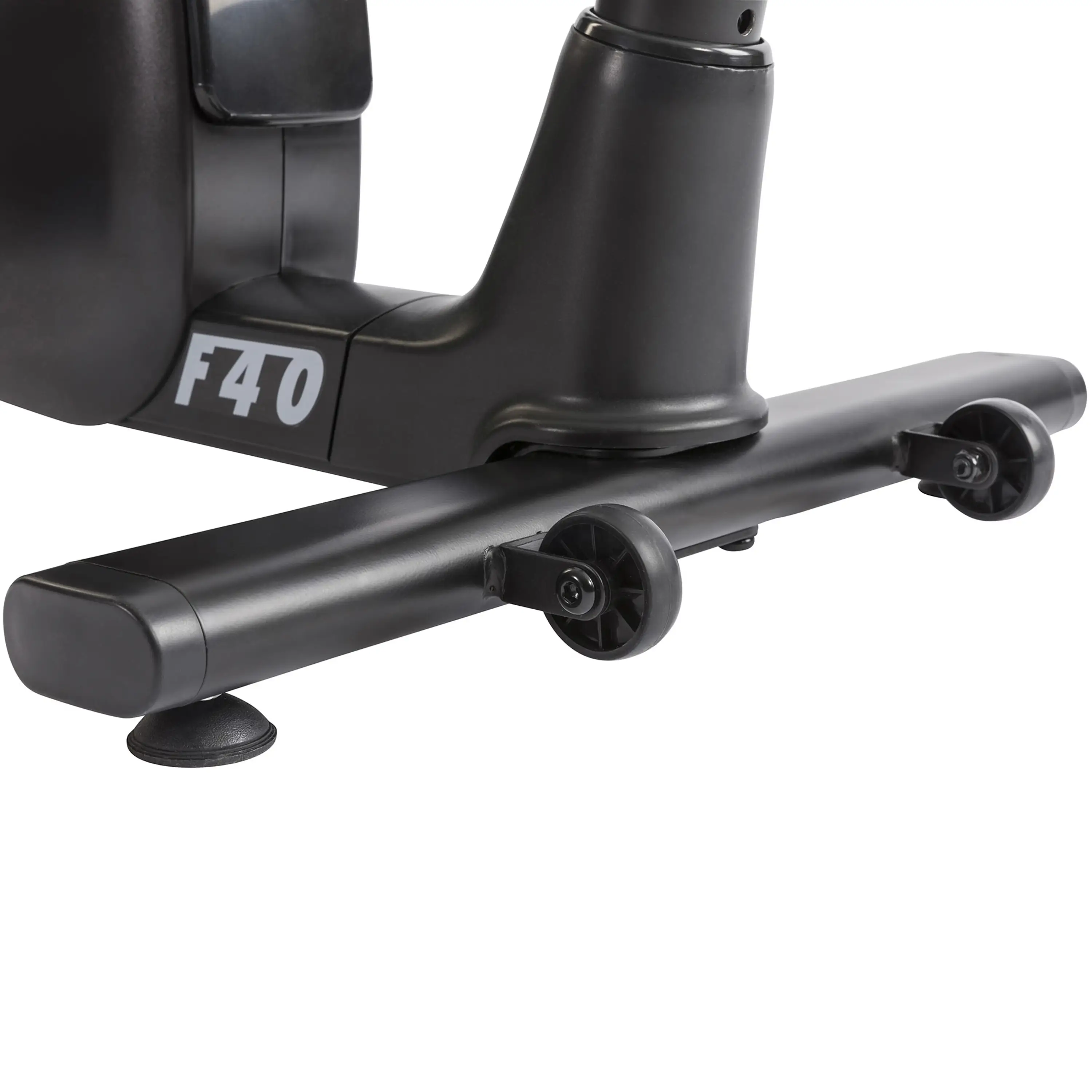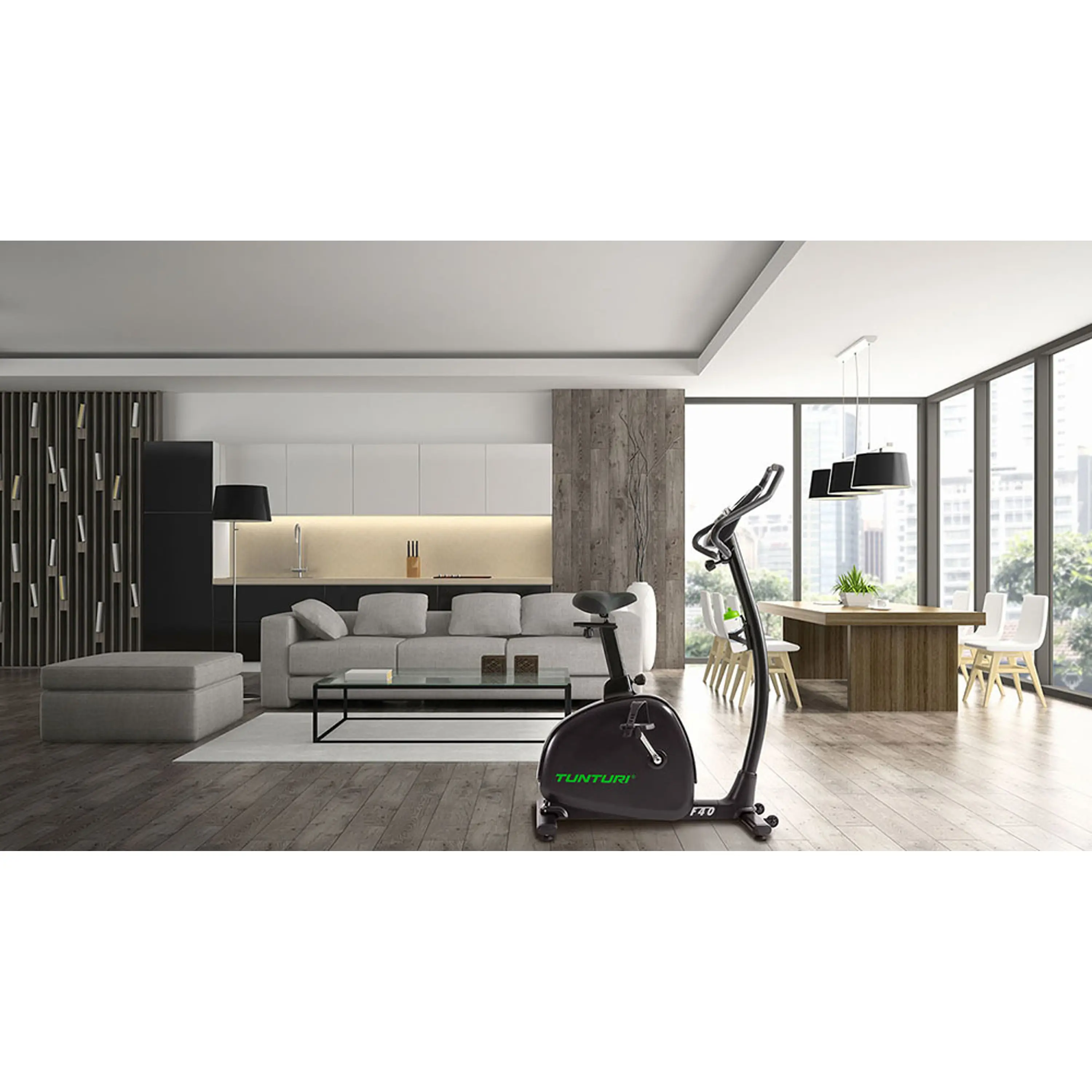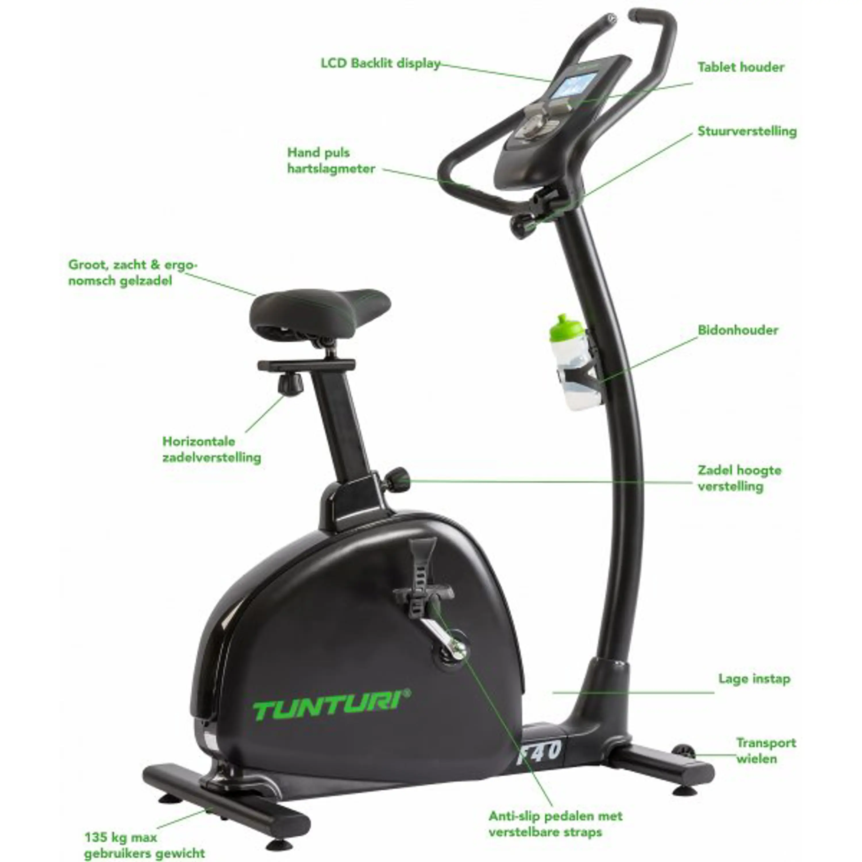 Rotoped je vybaven velice pohodlným sedlem, které je nastavitelné jak vertikálně, tak i horizontálně. Sedlo si tak lehce upravíte přímo na míru a navíc je možné přizpůsobit i sklon řídítek, což zajistí pohodlný trénink osobám různé výšky. Plastové pedály vybavené fixačními řemínky (klipsnami) drží bezpečně chodidlo na šlapačce. Předností modelu TUNTURI F40 Competence je nízký práh při nastupování a sestupování pro osoby se zdravotním hendikepem.
