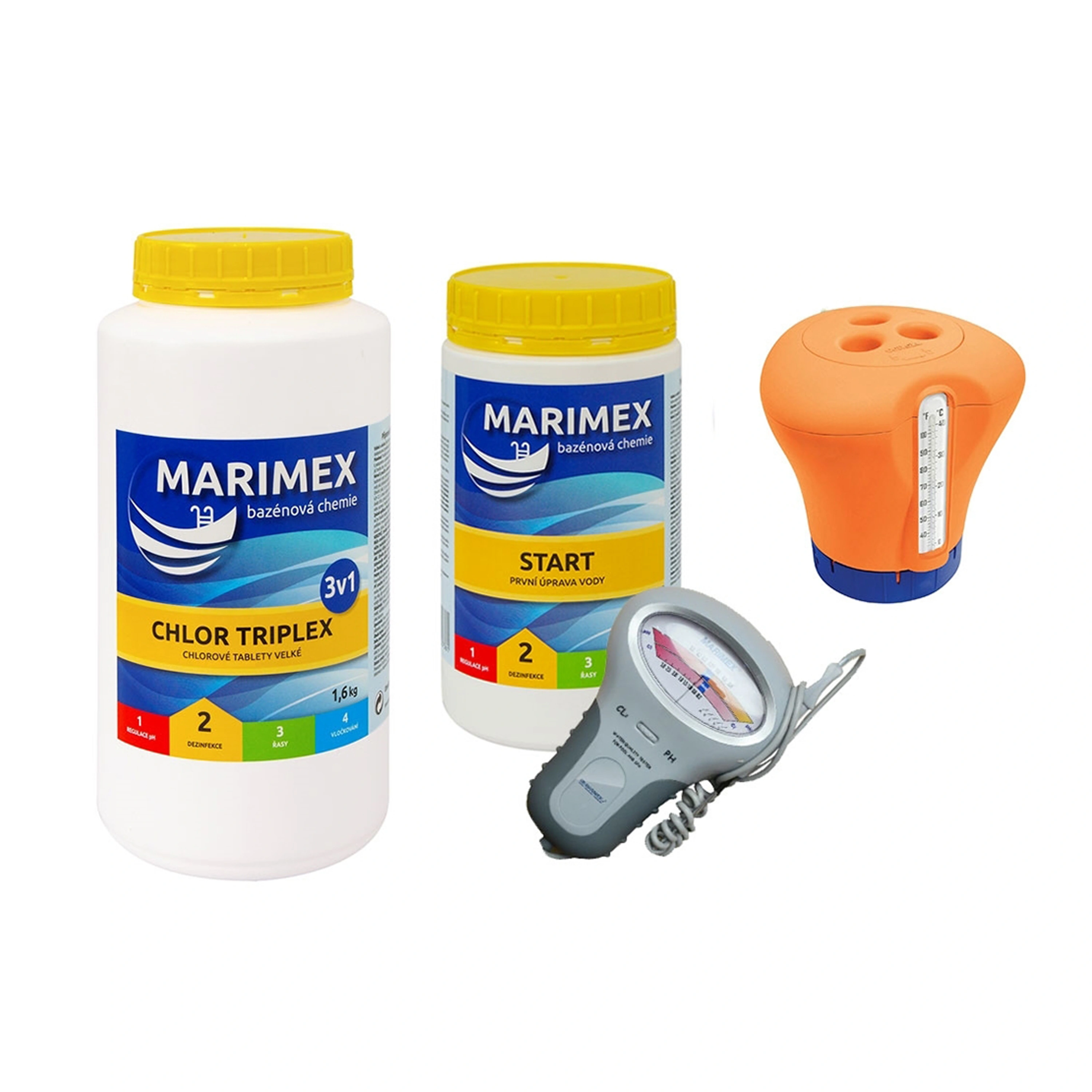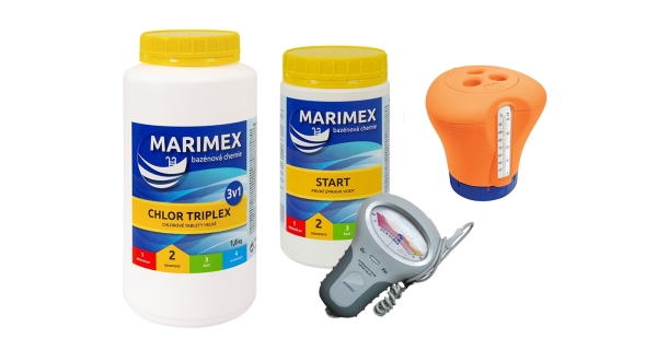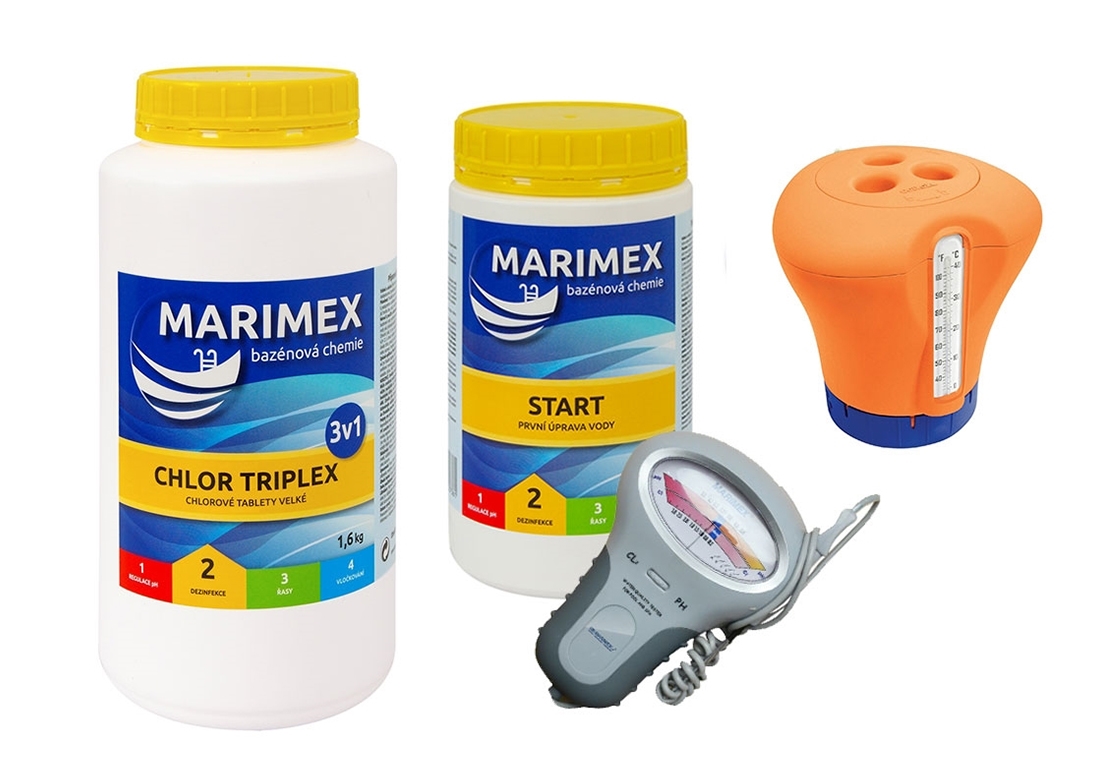 Cenově výhodná sada bazénové chemie a příslušenství na údržbu bazénové vody. Pomocí Marimex Start můžete zachlorovat bazén po prvním napuštěn, elektronický tester vám bude sledovat pH a chlor ve vodě, chlorové tablety Triplex můžete do bazénu umístit ve velkém plováku, který současně měří teplotu bazénové vody.