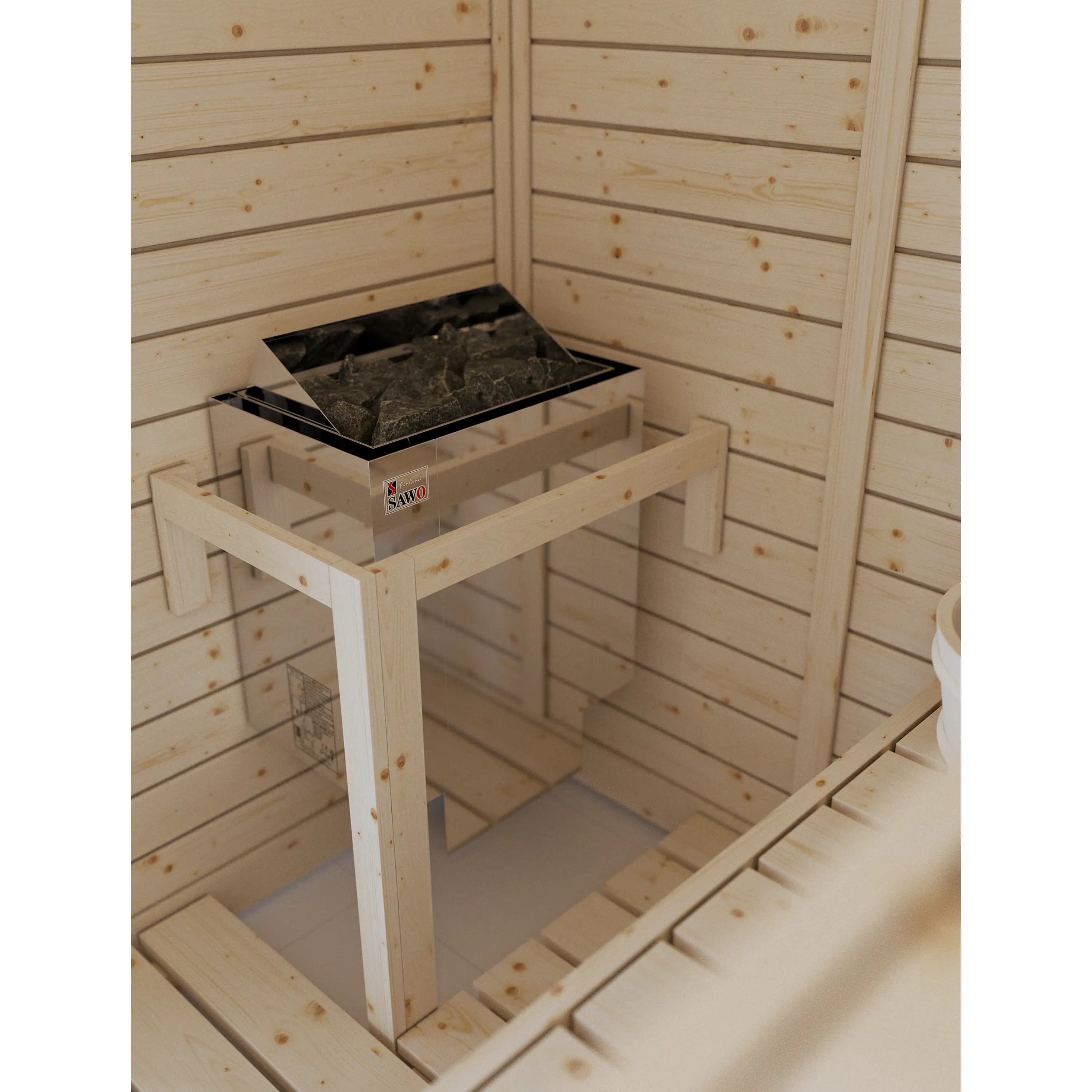 3. Prostor pro lávové kameny 18 - 22 kg. Tato saunová kamna umožňují polévaní vodou. Součástí dodávky je přídavný tepelný kryt. Kryt chrání stěnu za kamny a vede teplý vzduch i do spodní části saunové místnosti. Velmi kvalitní zpracování, testovaný výrobek. Saunová kamna jsou vyrobena z nerezavějící oceli. Kamna jsou dodávána bez přívodního kabelu a bez