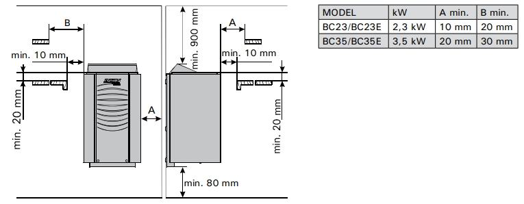 - Bezpečnostní vzdálenost A ke stěně: 20 mm