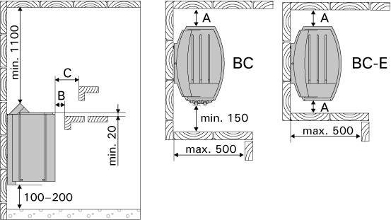 - Bezpečnostní vzdálenost A ke stěně: 50 mm