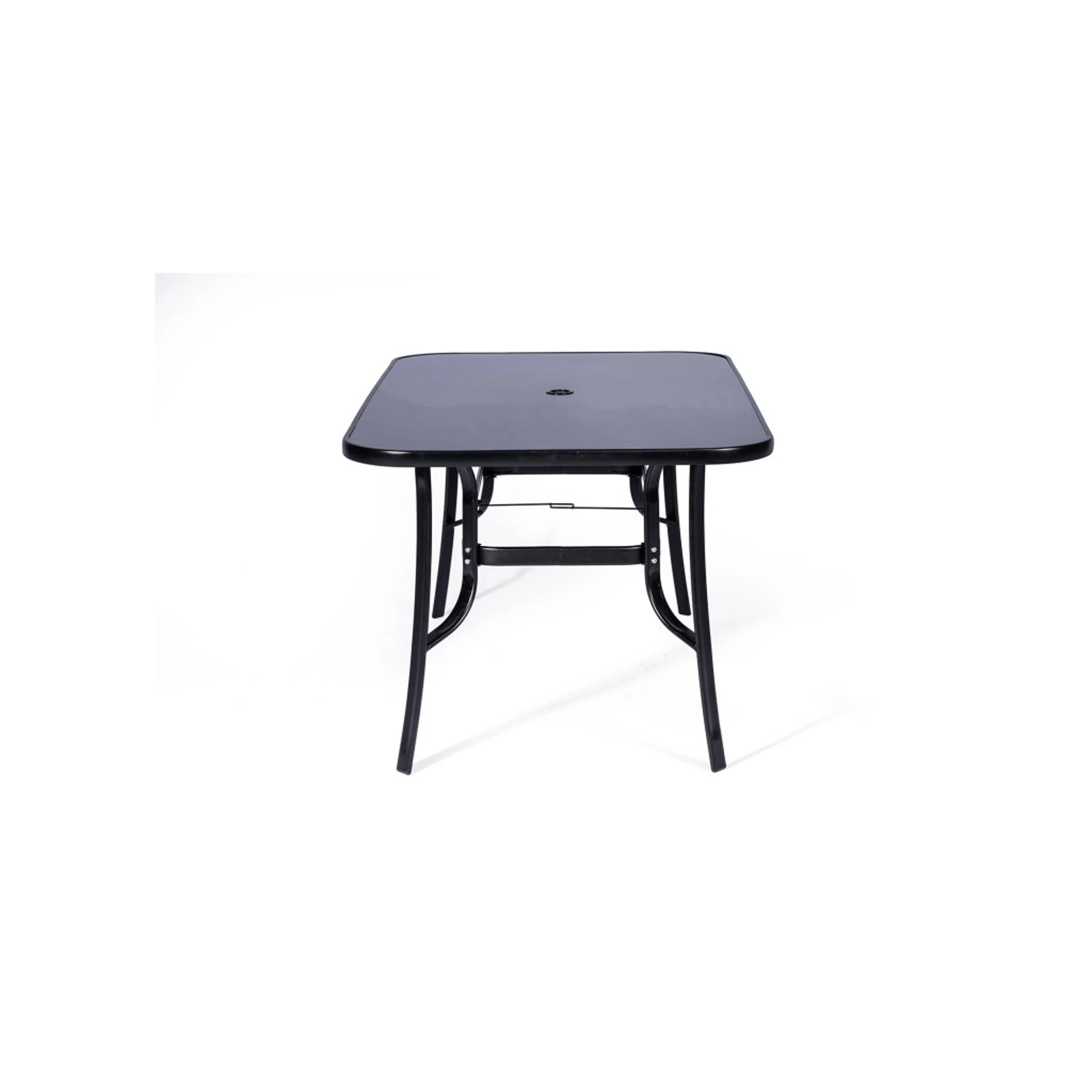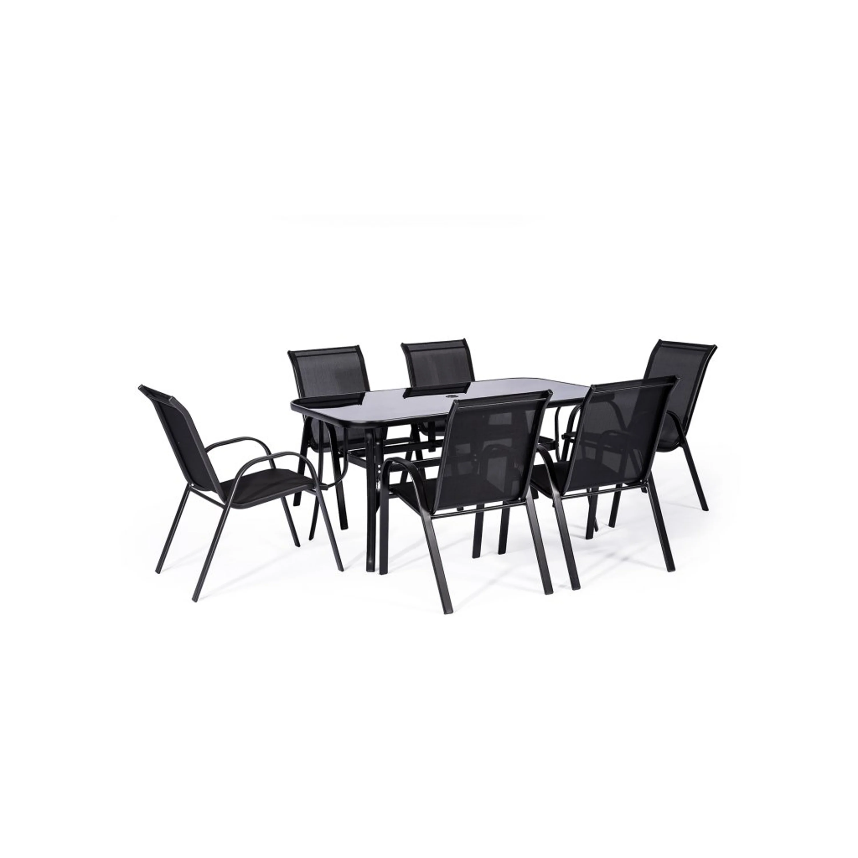 Hledáte vysoce komfortní a kvalitní set pro svoji zahradu či terasu? Set RAMADA jednoznačně splní všechny Vaše požadavky. Konstrukce židlí i stolu je vyrobena z oceli, jež dodává nábytku potřebnou stabilitu a odolnost. Ocel je ošetřena metodou práškového lakování, které zajistí kromě rezistence vůči rzi i stálost barvy. Židle s pohodlnou vysokou zádovou opěrkou a širokým sedákem zaručuje maximální komfort sezení. Prodyšná a na dotek příjemná textilie je na údržbu nenáročná, postačí Vám vlhký hadřík. V případě potřeby můžete židle postříkat zahradní hadicí. Židle jsou stohovatelné, takže jejich uskladnění nezabere příliš mnoho místa. Stůl, jehož deska je vyrobena z temperovaného skla v černé barvě, krásně ladí s celým setem a dodává mu na eleganci. Stůl je široký 90 cm a dlouhý 150 cm. Pohodlně se k němu vejde všech šest židlí. Praktickým detailem stolu je otvor na slunečník ve středu desky. Slunečník můžete kdykoliv jednoduše vyndat a plachtu stáhnout pomocí otočné kličky. Díky volitelnosti slunečníku je set vhodný jak pro ty, kteří si rádi užívají přímého slunce, tak pro ty, kteří preferují stín. Průměr slunečníku je 1,8 m.