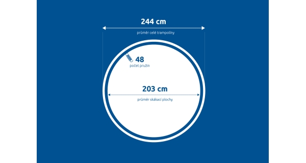 Průměr skákací plochy: 203 cm (měří se po vlákně tkaniny – od jednoho okraje k druhému přes střed, tolerance rozměru ± 2 cm).