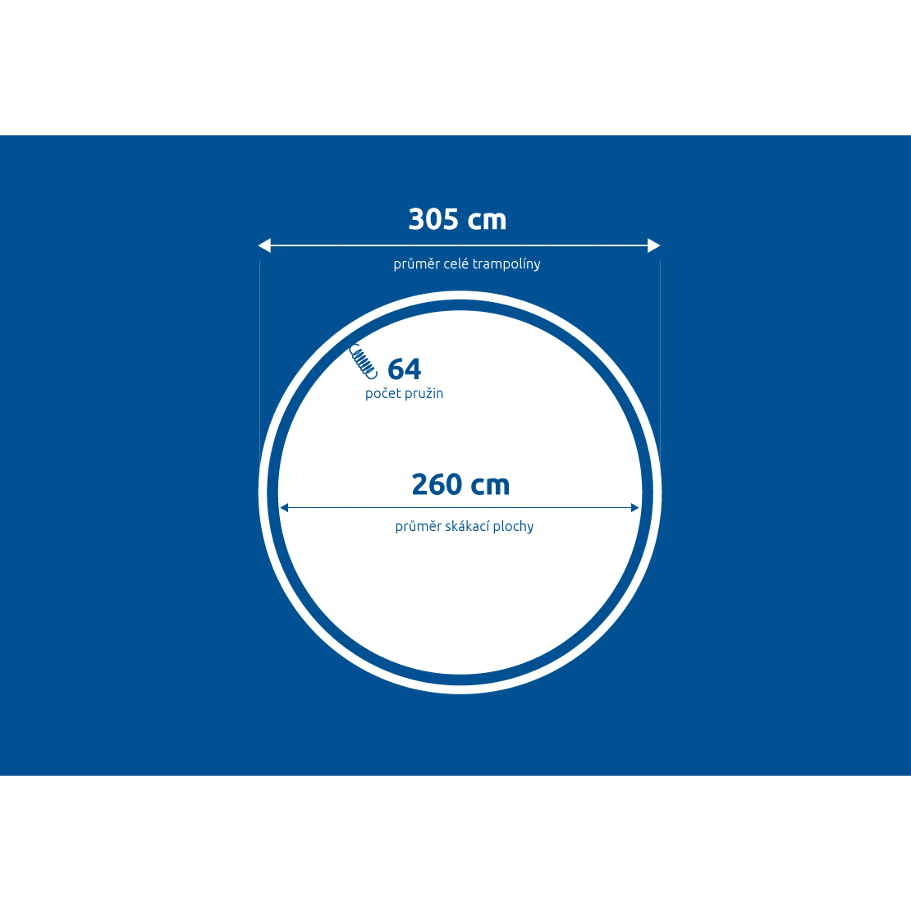 Průměr skákací plochy: 260 cm (měří se po vlákně tkaniny – od jednoho okraje k druhému přes střed, tolerance rozměru ± 2 cm).