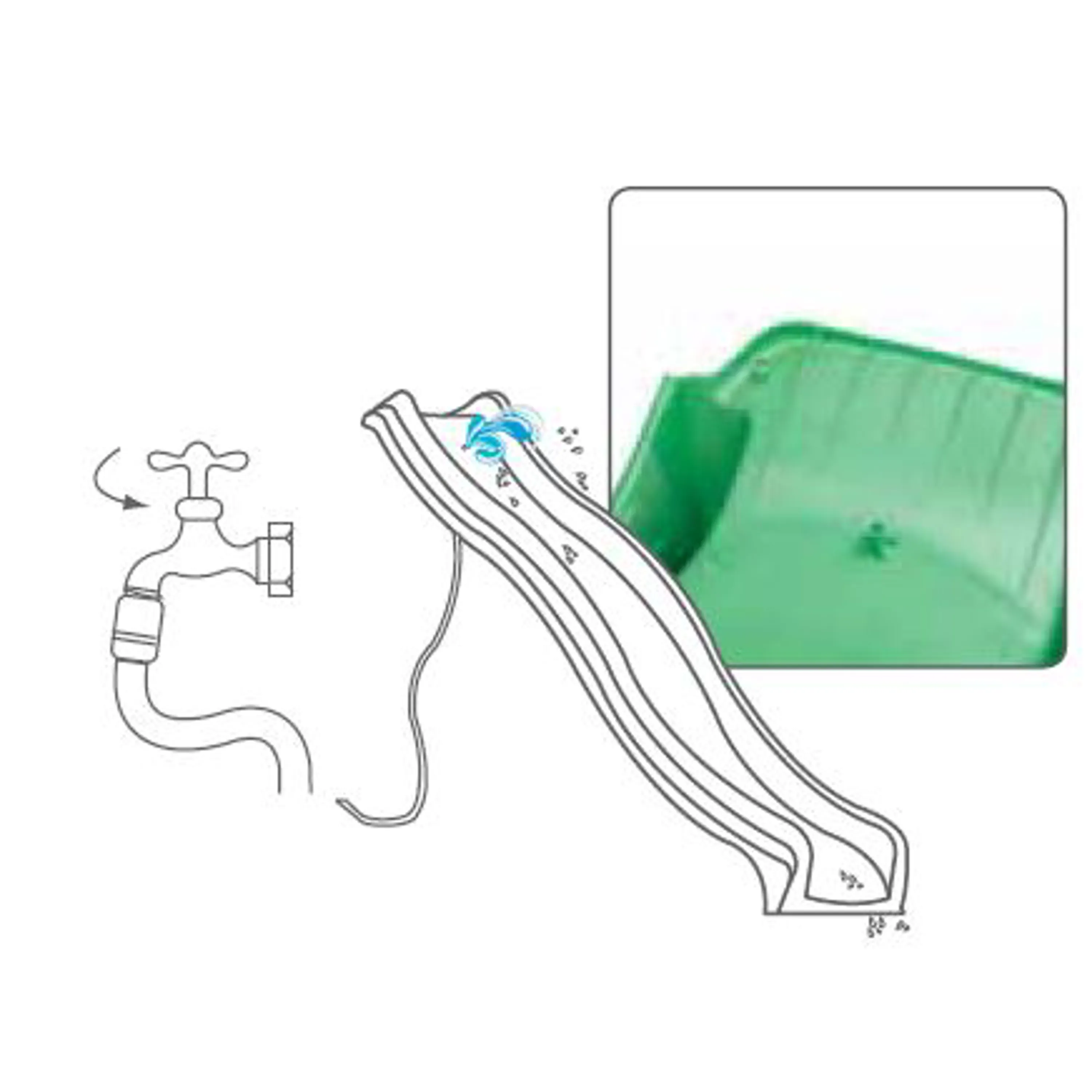 Kvalitní dětská skluzavka s přípojkou na vodu je vyrobena z pevného plastu. Přídavnou skluzavku lze umístit k většině dětských hřišť s nástupní výškou 150 cm.