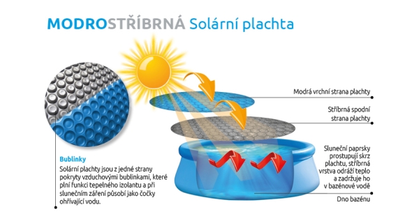 Sluneční paprsky prostupují solární plachtou a ohřívají vodu bezprostředně pod hladinou. Bublinky působí při slunečním záření jako čočky a tím zvyšují teplotu vody. V noci zamezují odparu vody, chemických prostředků a ochlazování vody. Solární plachta také částečně chrání proti spadu nečistoto do bazénu. Solární plachta je vyrobena z modrostříbrné bublinkové polyetylénové tepelně izolační plachty.