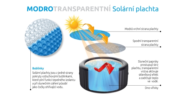 Sluneční paprsky prostupují solární plachtou a ohřívají vodu bezprostředně pod hladinou. Bublinky působí při slunečním záření jako čočky a tím zvyšují teplotu vody. V noci zamezují odparu vody, chemických prostředků a ochlazování vody. Solární plachta také částečně chrání proti spadu nečistoto do vířivky. Solární plachta je vyrobena z modro-transparentní bublinkové tepelně izolační plachty.