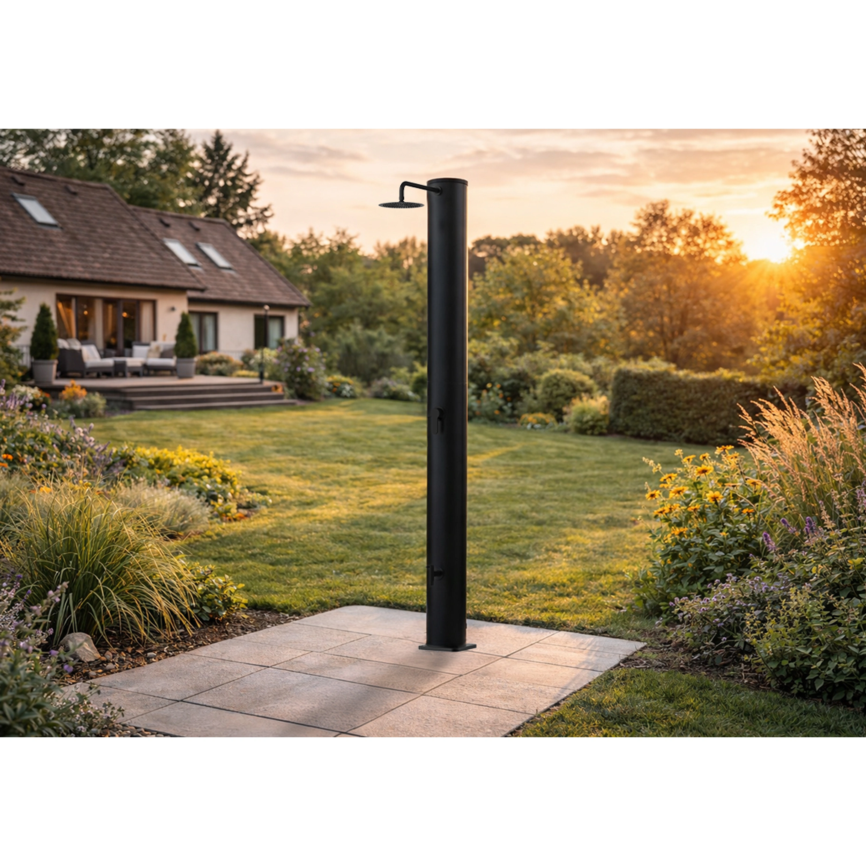 Zahradní dvoudílná a skladná sprcha DUO s objemem 40 l pro venkovní použití zajistí ohřev vody přiváděné ze zahradní hadice a tím perfektní pocit pohodlí při sprchování teplou nebo vlažnou vodou. Sprcha má pákovou baterii i kohoutek na oplach nohou. Ohřev vody zajišťuje sluneční záření a tělo sprchy, které funguje jako solární kolektor. Pro sprchování musí být zahradní sprcha stále napojena na vodovodní řad. Není-li napojena, nelze se sprchovat. Sprcha se kotví pomocí 4 šroubů (nejsou součástí balení) pevně k zemi, čímž je zajištěna její perfektní stabilita.