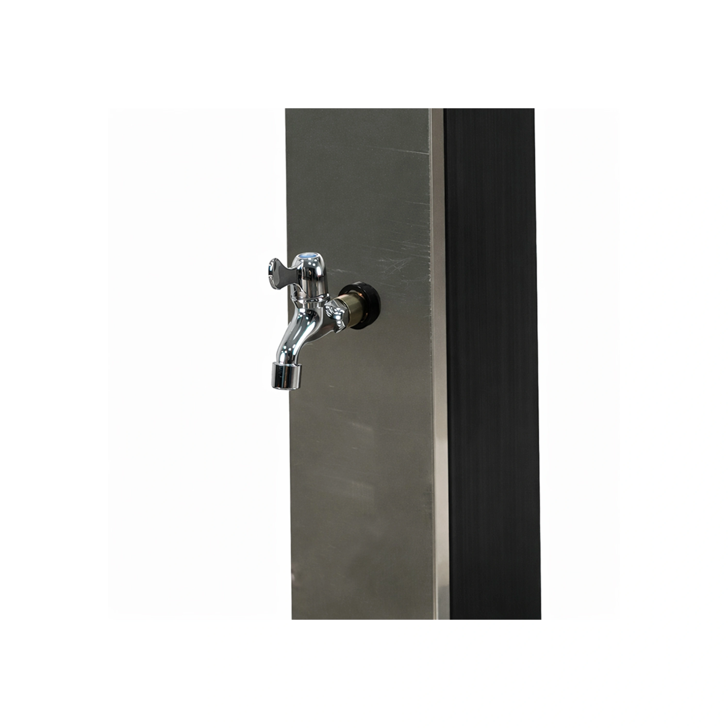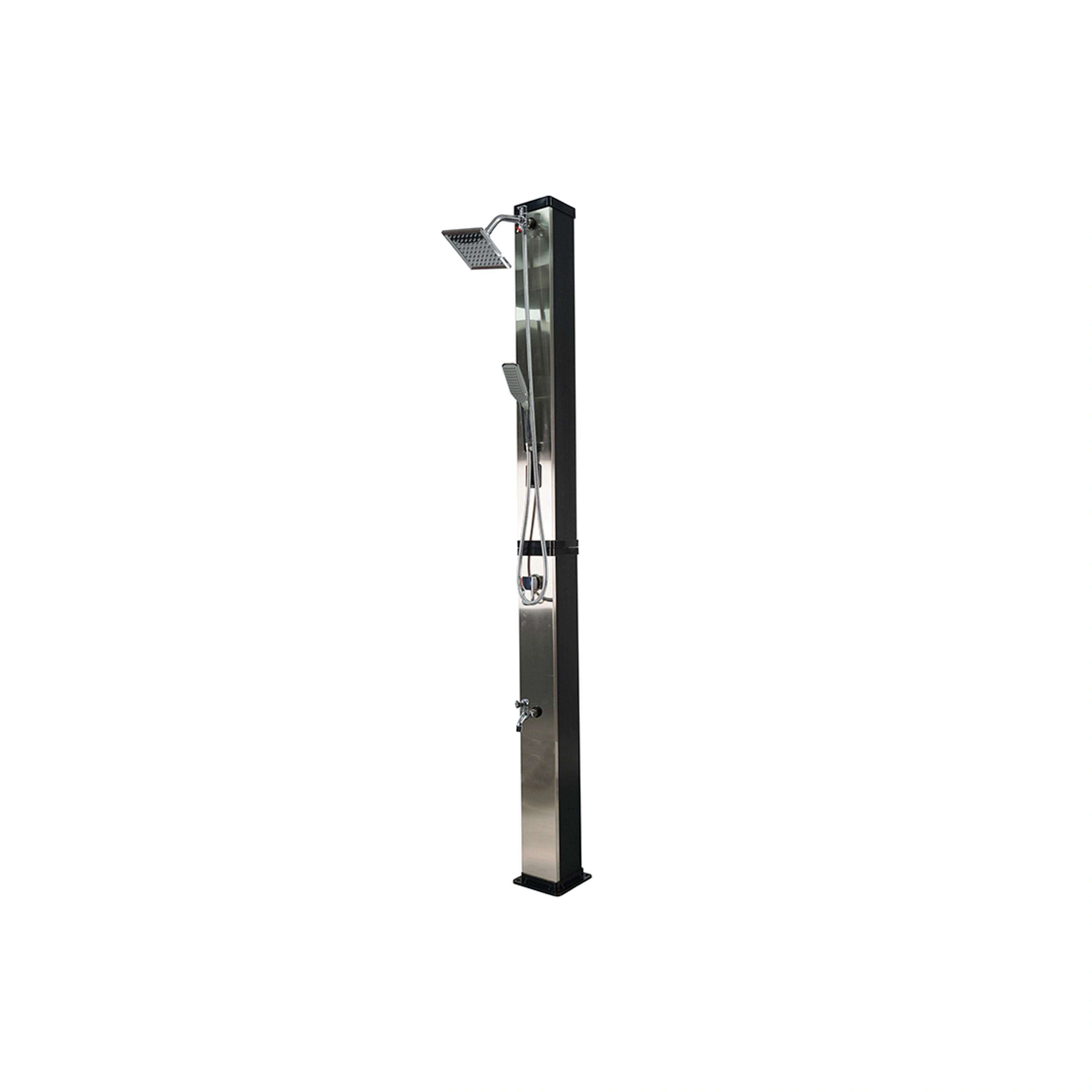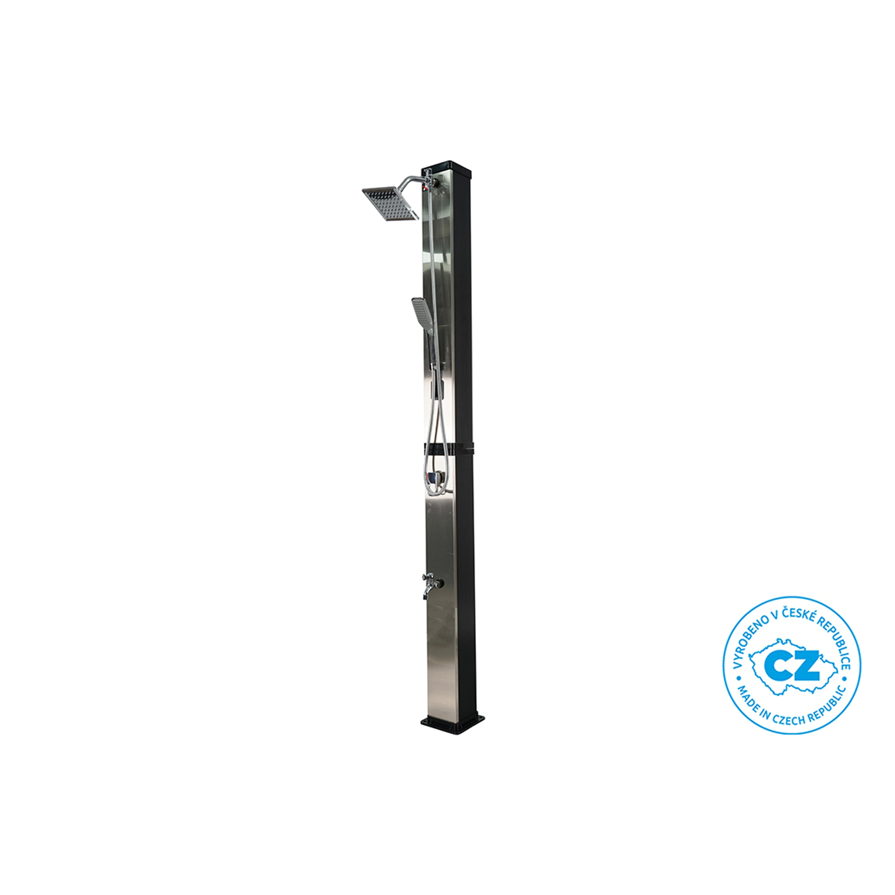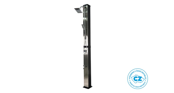 Zahradní dvoudílná a skladná sprcha DUO s objemem 40 l pro venkovní použití zajistí ohřev vody přiváděné ze zahradní hadice a tím perfektní pocit pohodlí při sprchování teplou nebo vlažnou vodou. Sprcha má pákovou baterii, ruční sprchu i kohoutek na oplach nohou. Ohřev vody zajišťuje sluneční záření a tělo sprchy, které funguje jako solární kolektor. Pro sprchování musí být zahradní sprcha stále napojena na vodovodní řad. Není-li napojena, nelze se sprchovat. Sprcha se kotví pomocí 4 šroubů (nejsou součástí balení) pevně k zemi, čímž je zajištěna její perfektní stabilita.