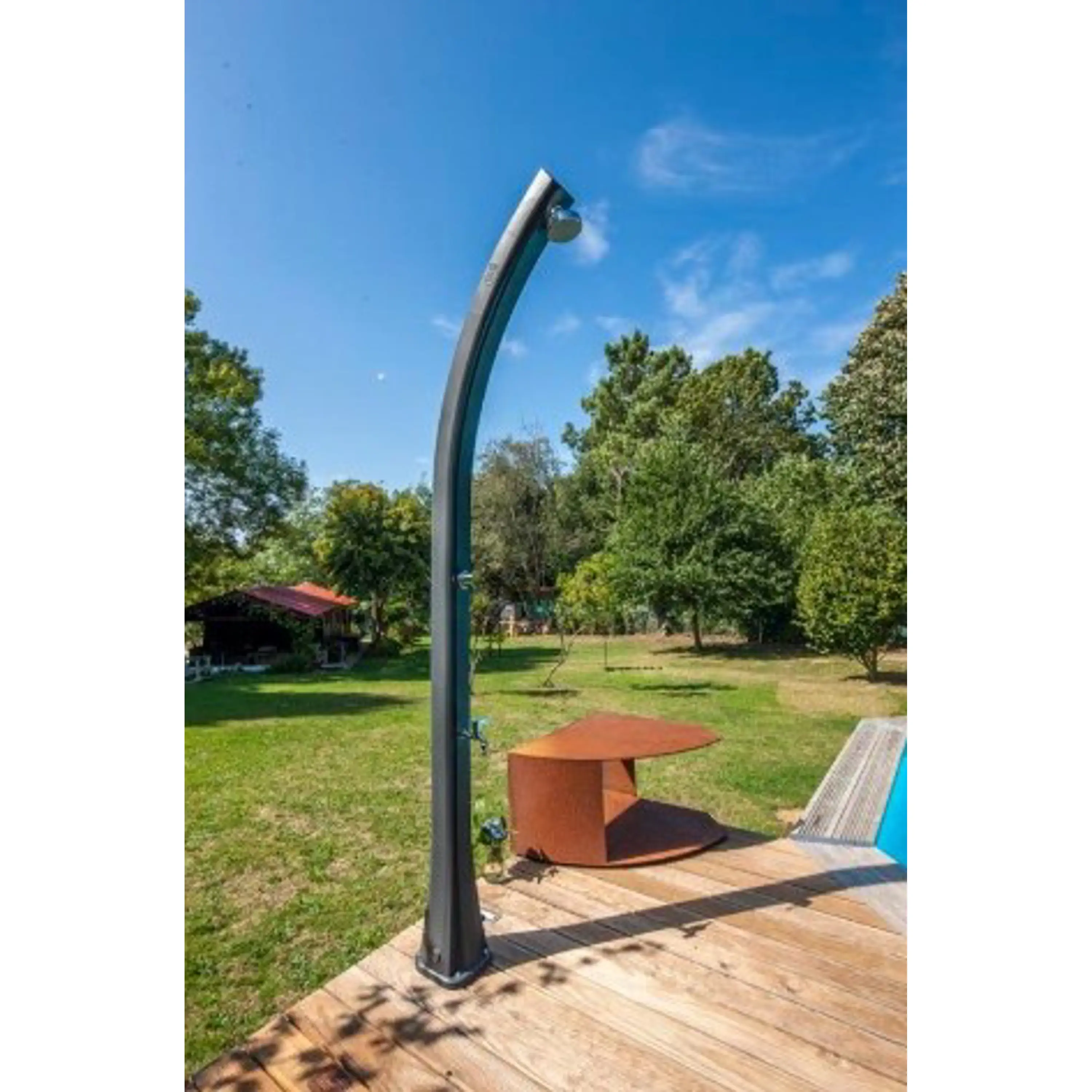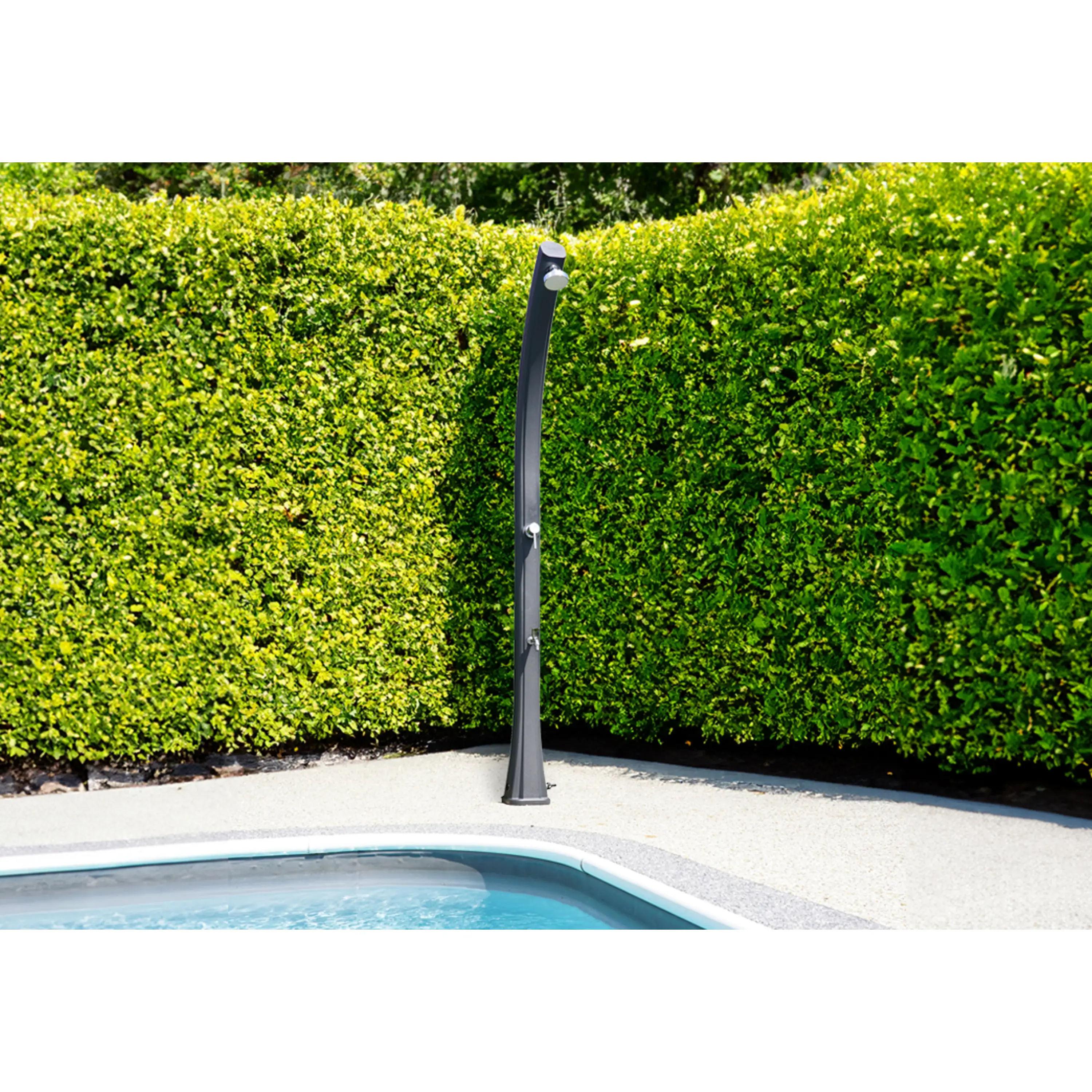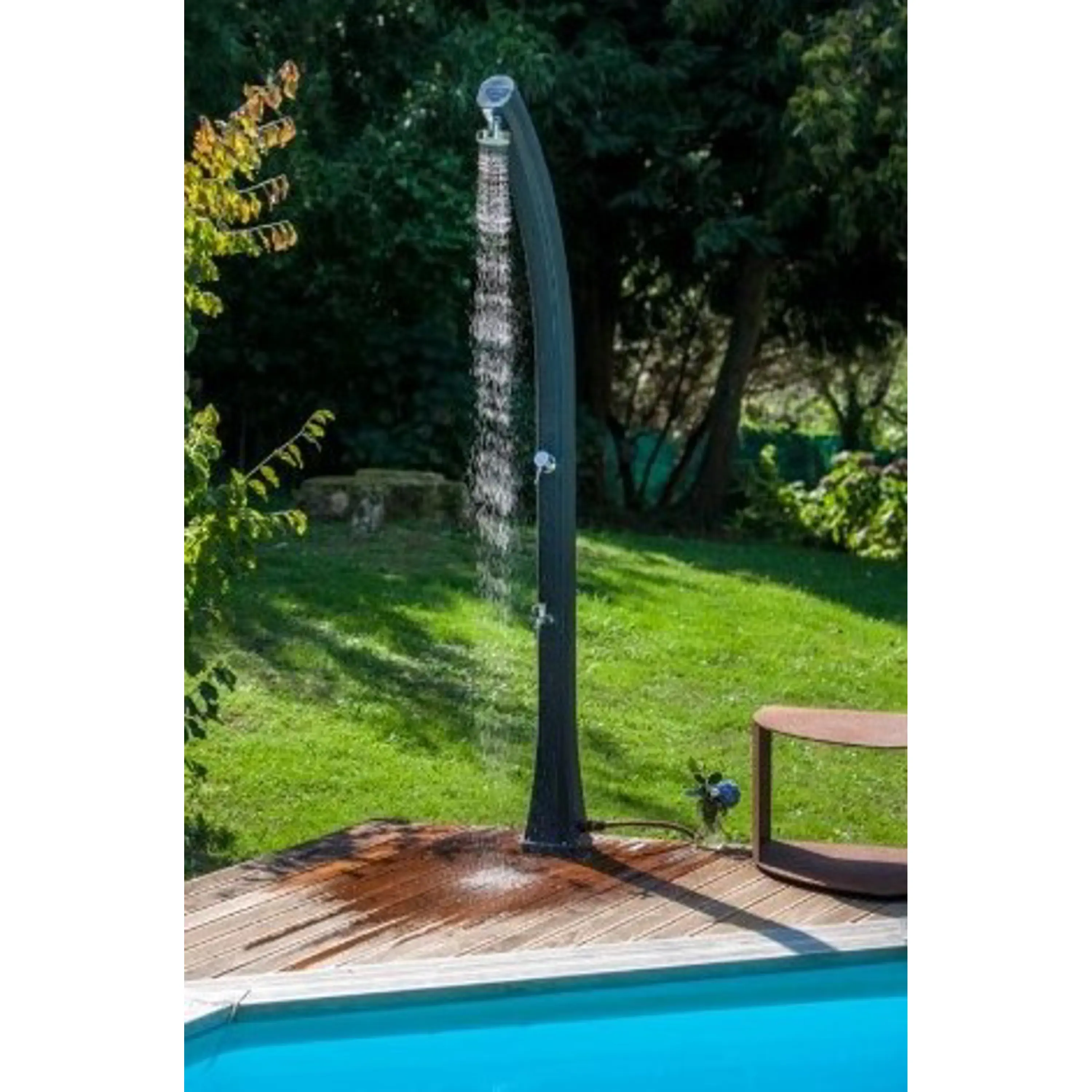 Solární sprchy se dají využívat samostatně, ale můžou tvořit i doplněk k bazénům. Pomáhají tak před zbytečným znečištěním bazénové vody například od trávy či hlíny.
