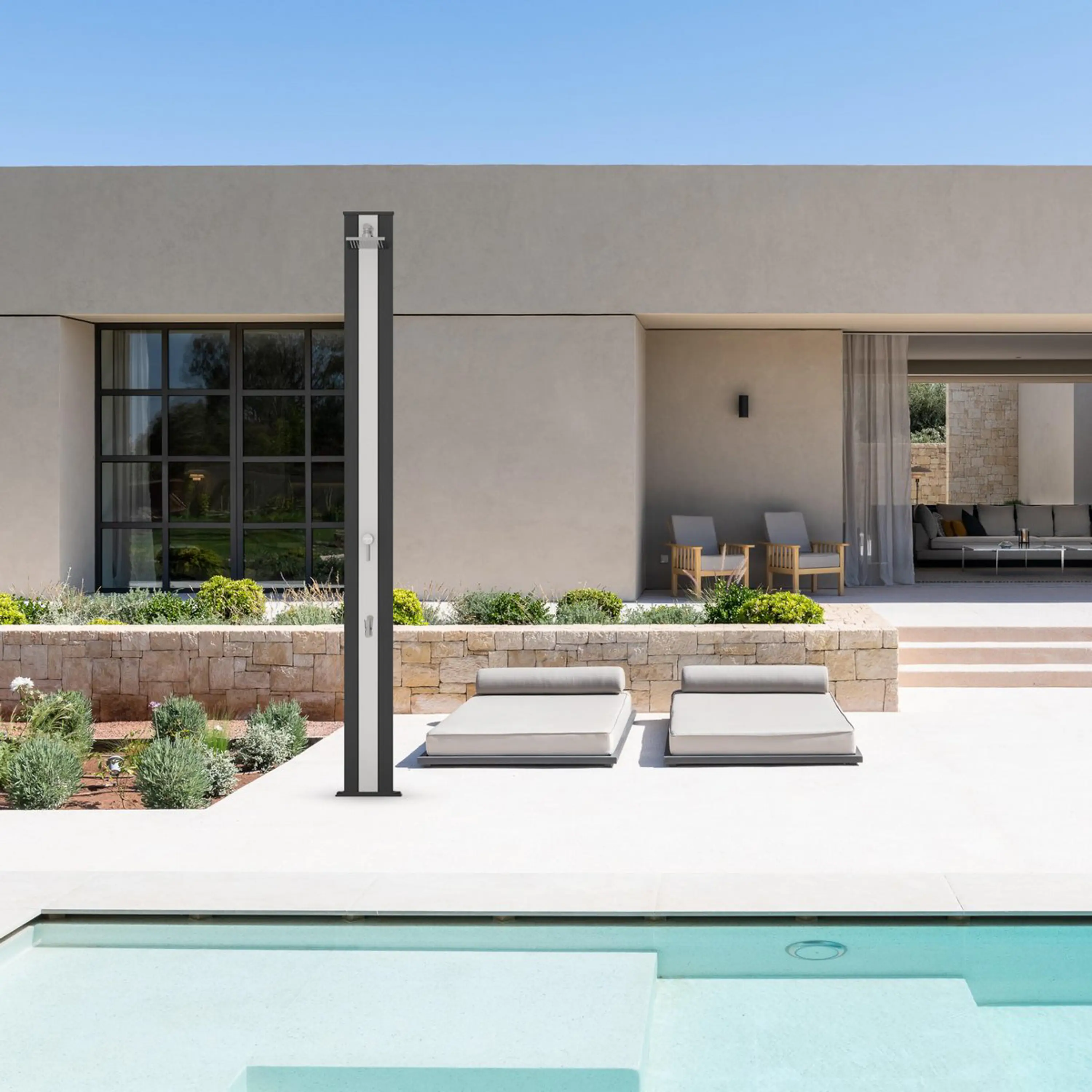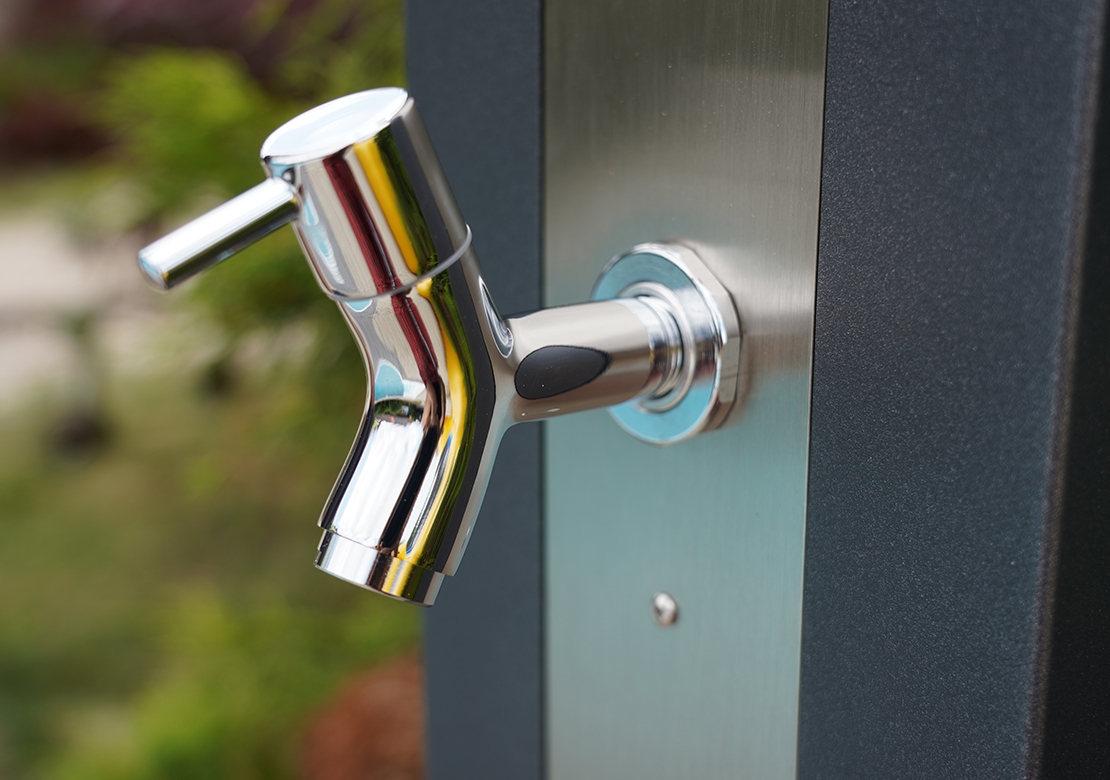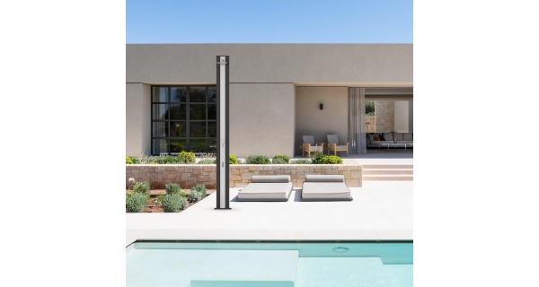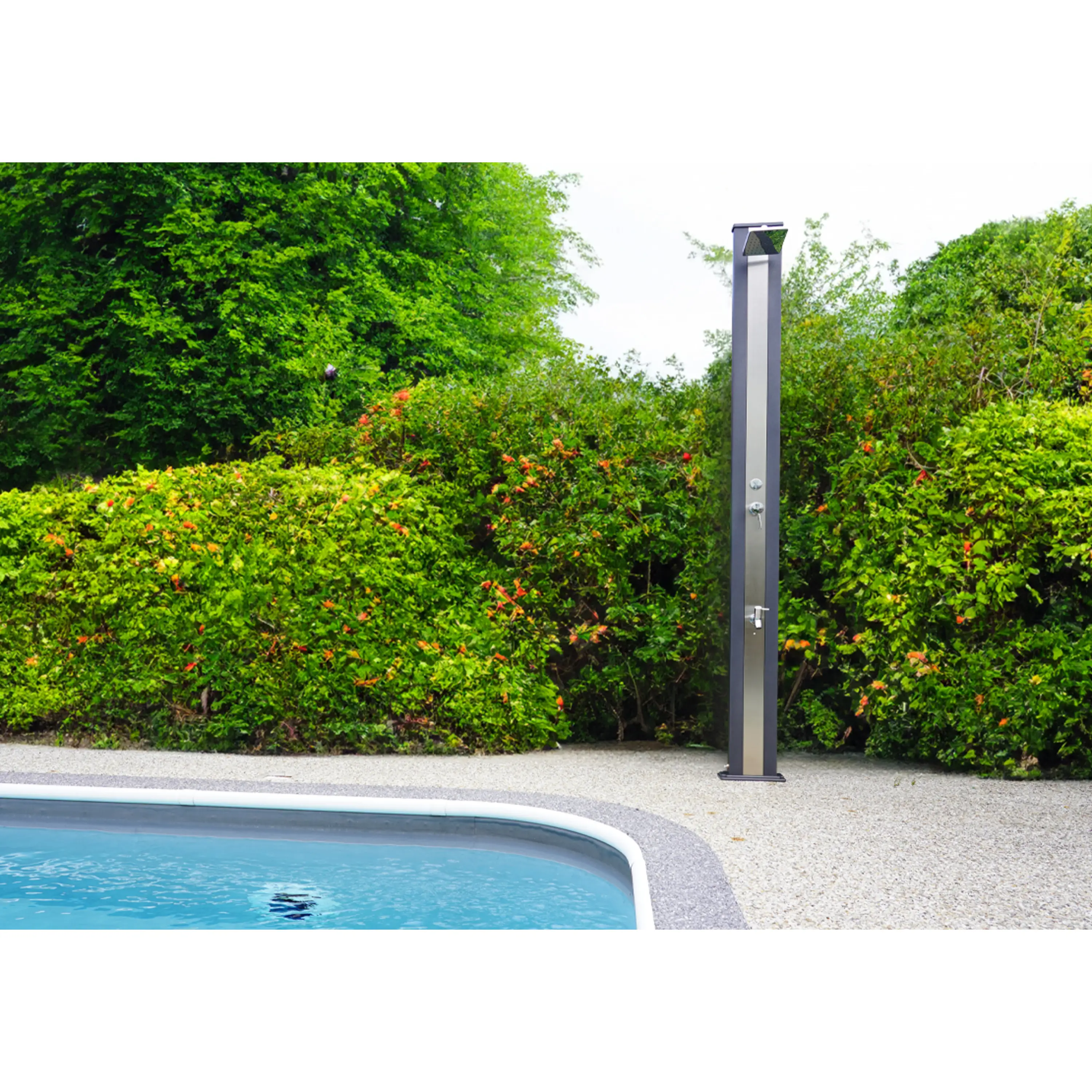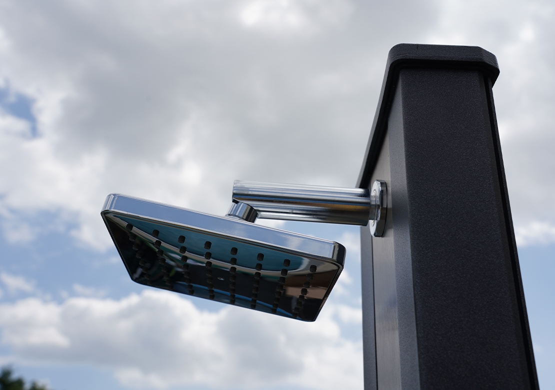 Solární sprchy se dají využívat samostatně, ale můžou tvořit i doplněk k bazénům. Pomáhají tak před zbytečným znečištěním bazénové vody například od trávy či hlíny.