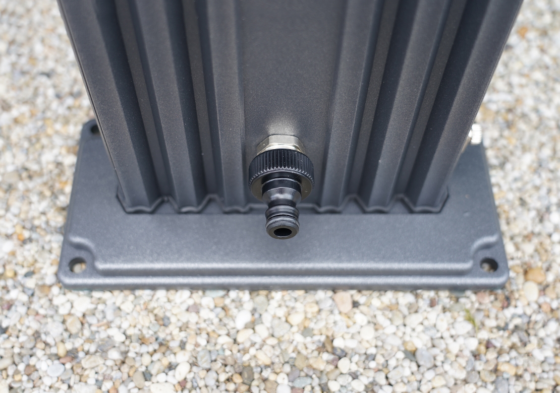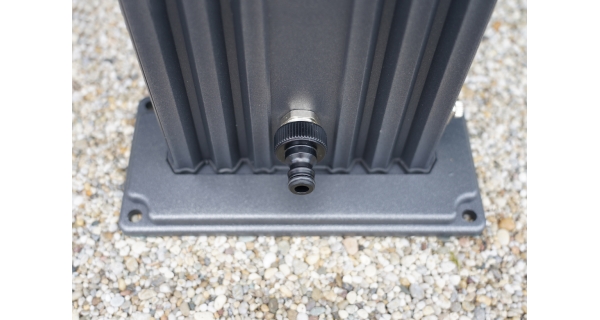 Zahradní sprcha UNO s objemem 25 l zajistí ekologický ohřev vody a tím perfektní pocit pohodlí při sprchování teplou nebo vlažnou vodou. Sprcha má lehkou konstrukci. Dalším benefitem je nastavení teploty vody pákovou baterií a kohoutek na oplach nohou. Zahradní sprchu na Vaší zahradě smontujete velmi rychle a snadno. Materiál: slitina hliníku .