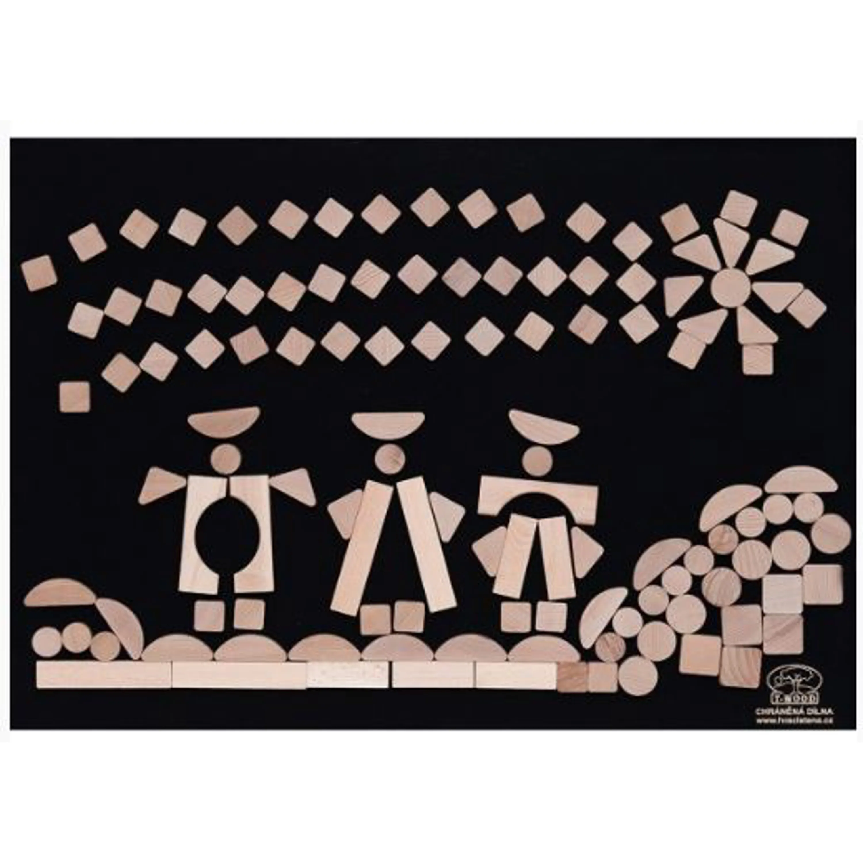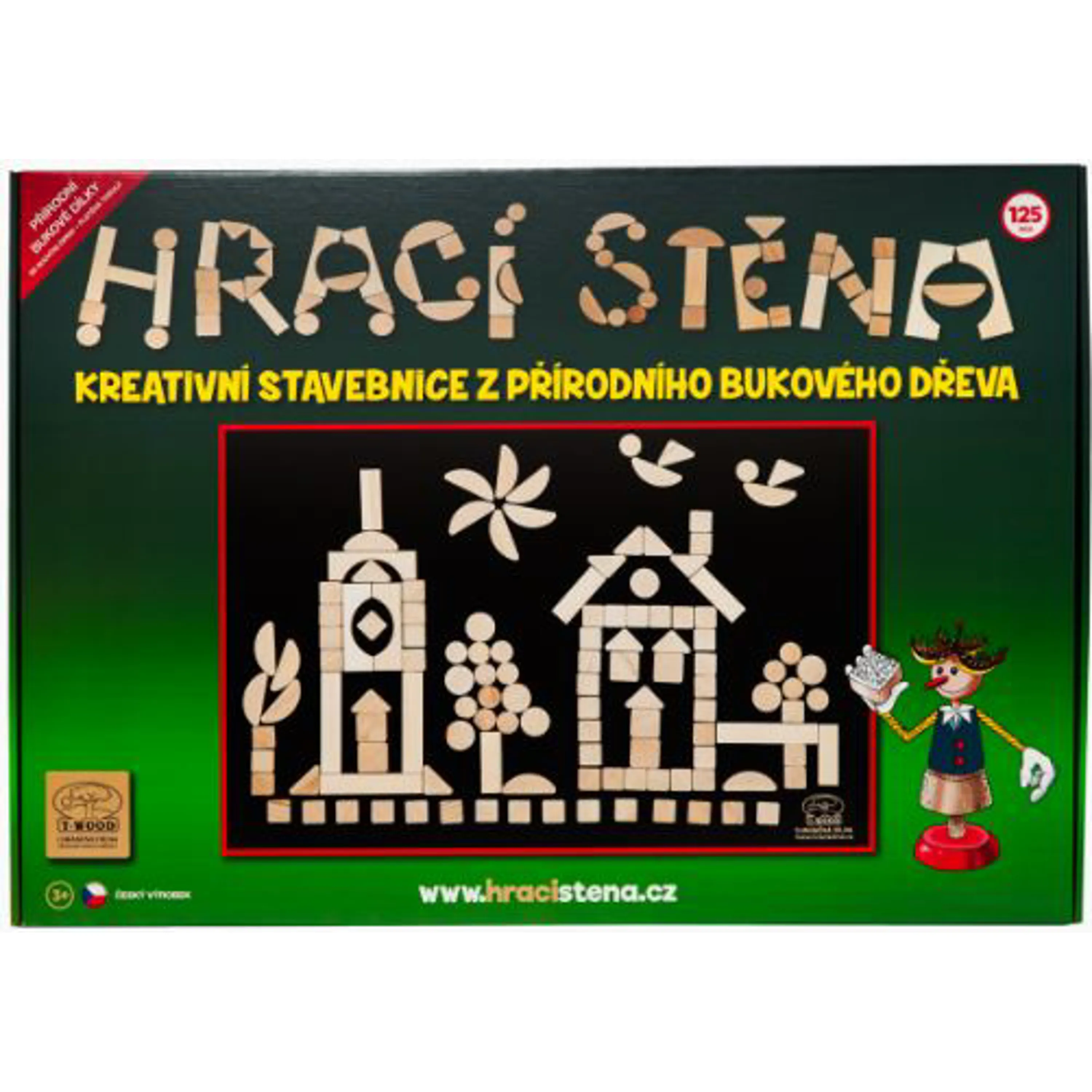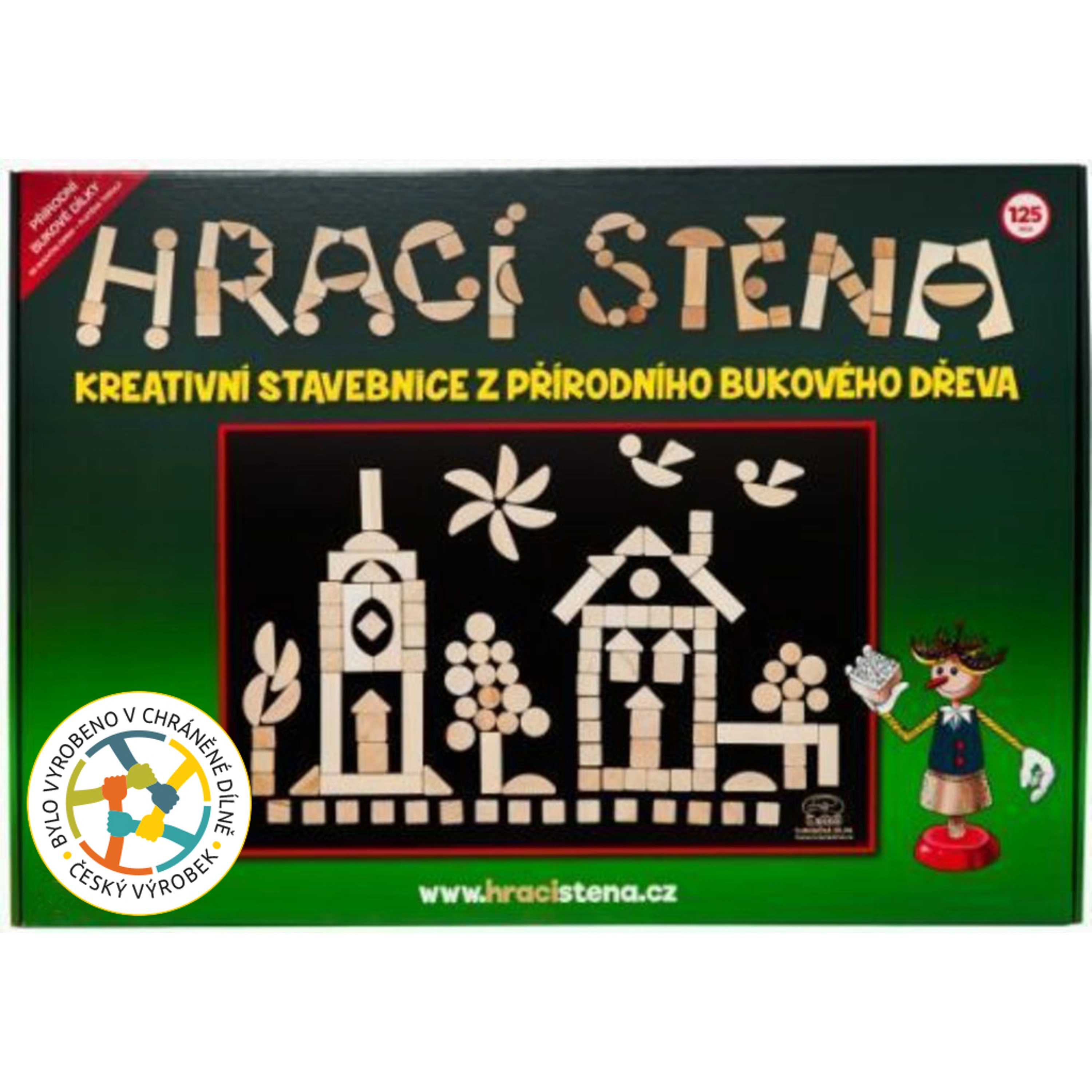 • hrací stěna se skládá z plstěné tabule o rozměrech 70 x 50 centimetrů a 125 skládacích dílků různých tvarů z kvalitního bukového dřeva