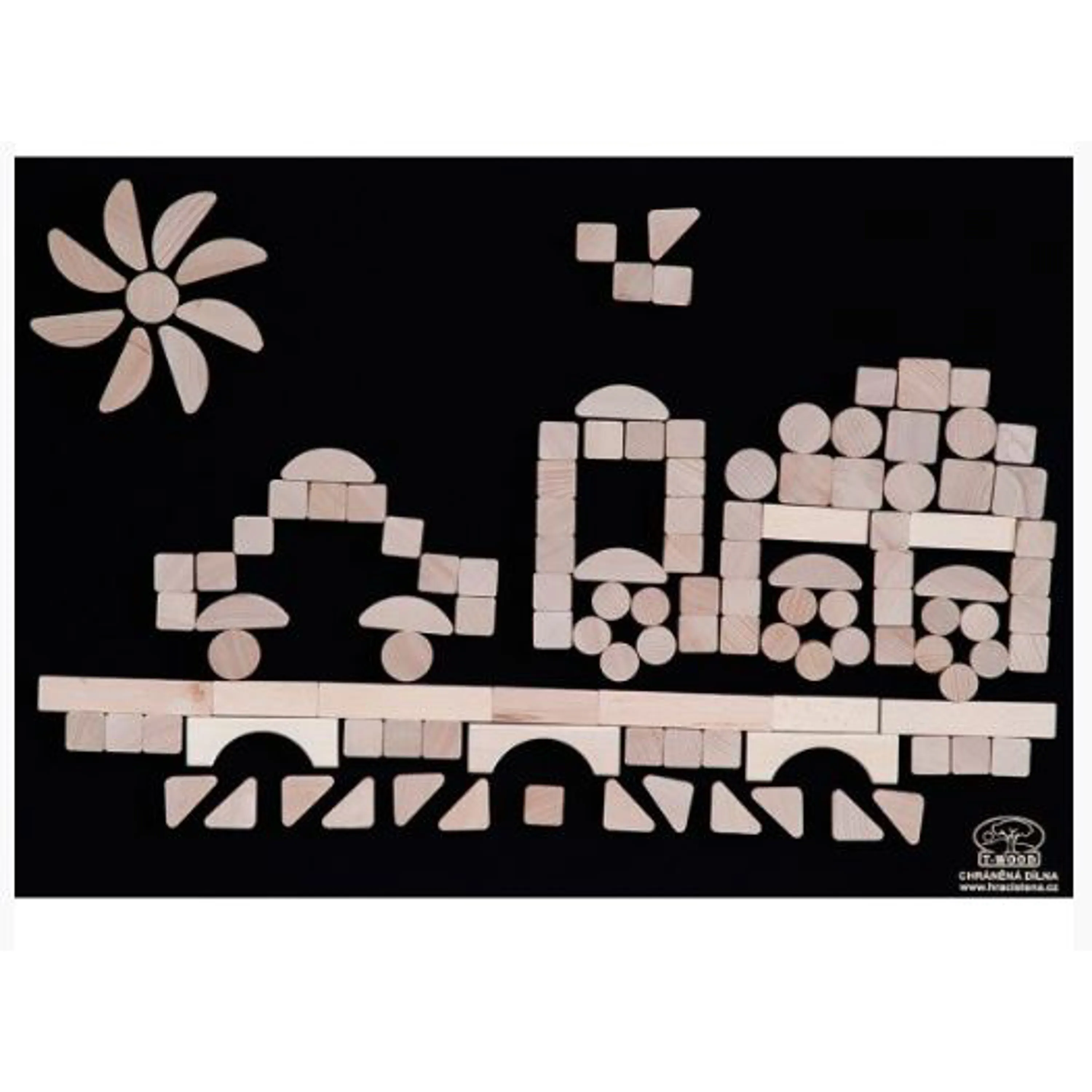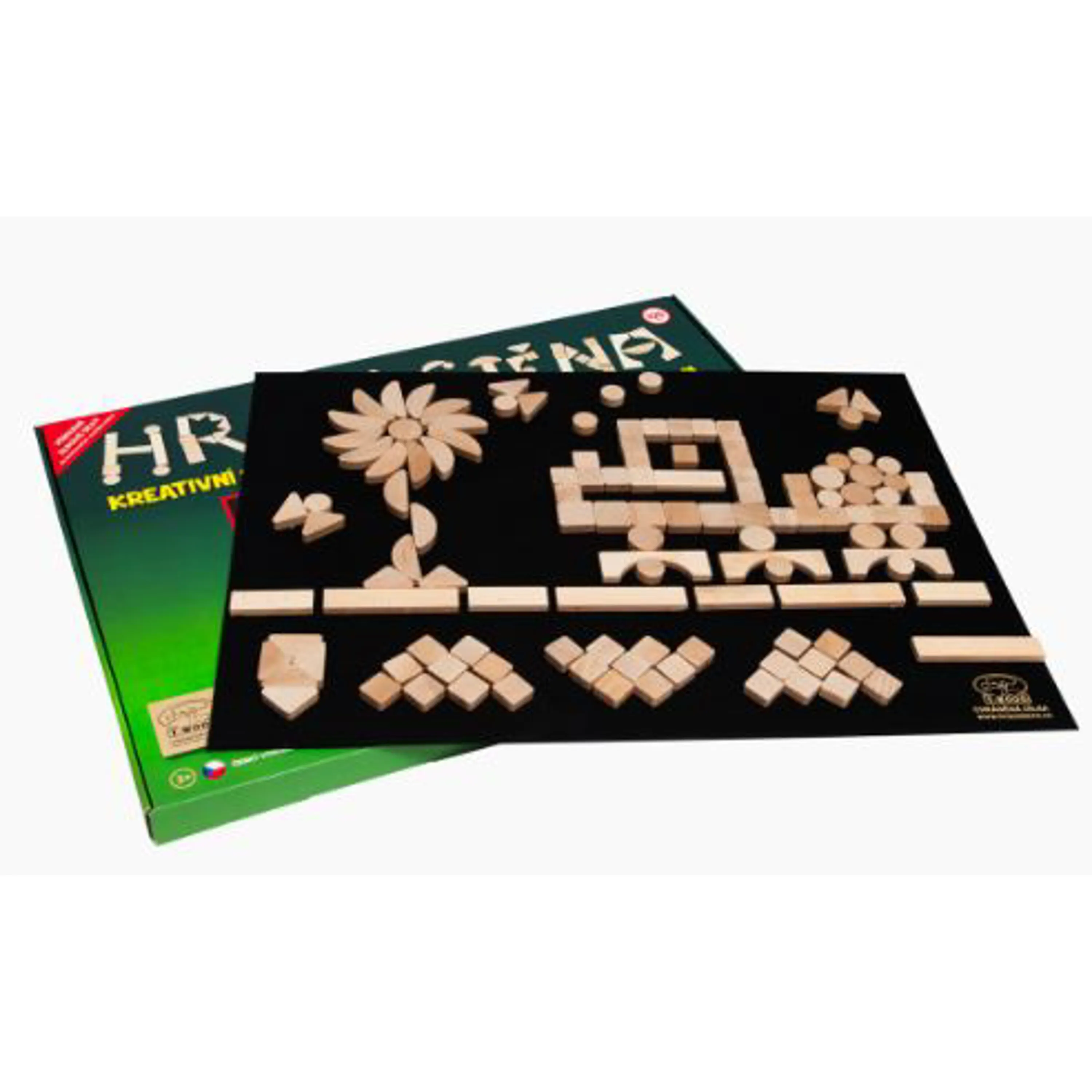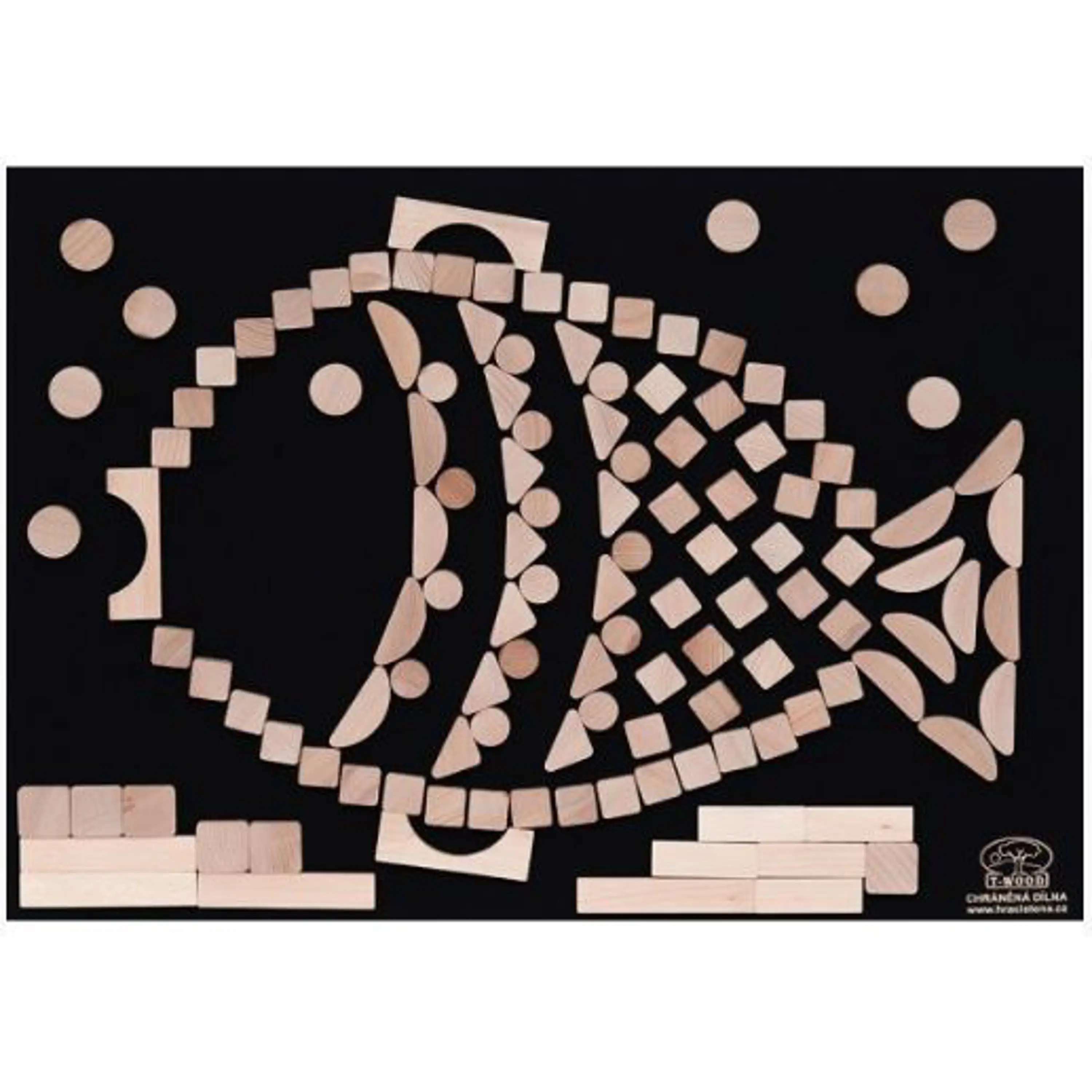 • hrací stěna se skládá z plstěné tabule o rozměrech 70 x 50 centimetrů a 125 skládacích dílků různých tvarů z kvalitního bukového dřeva