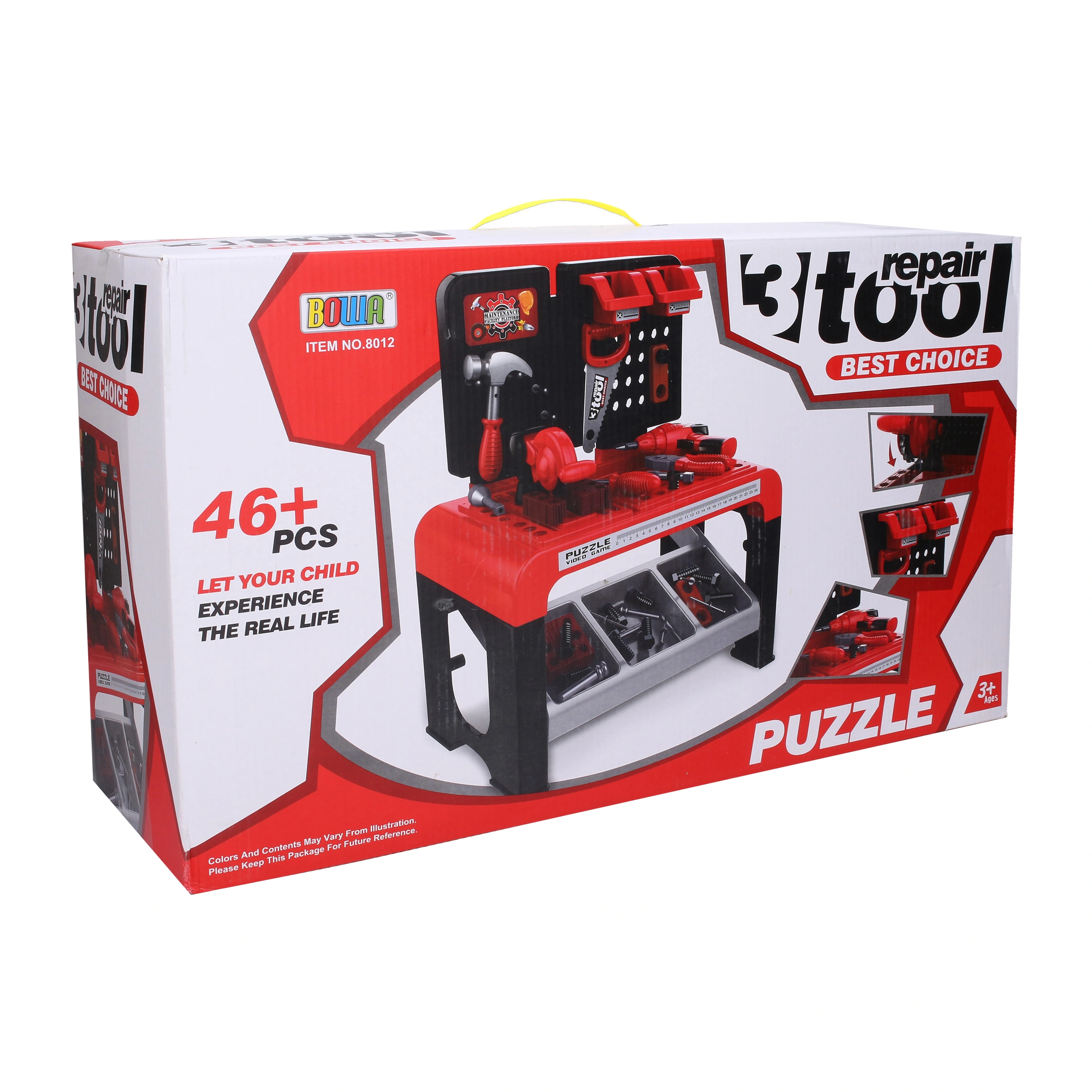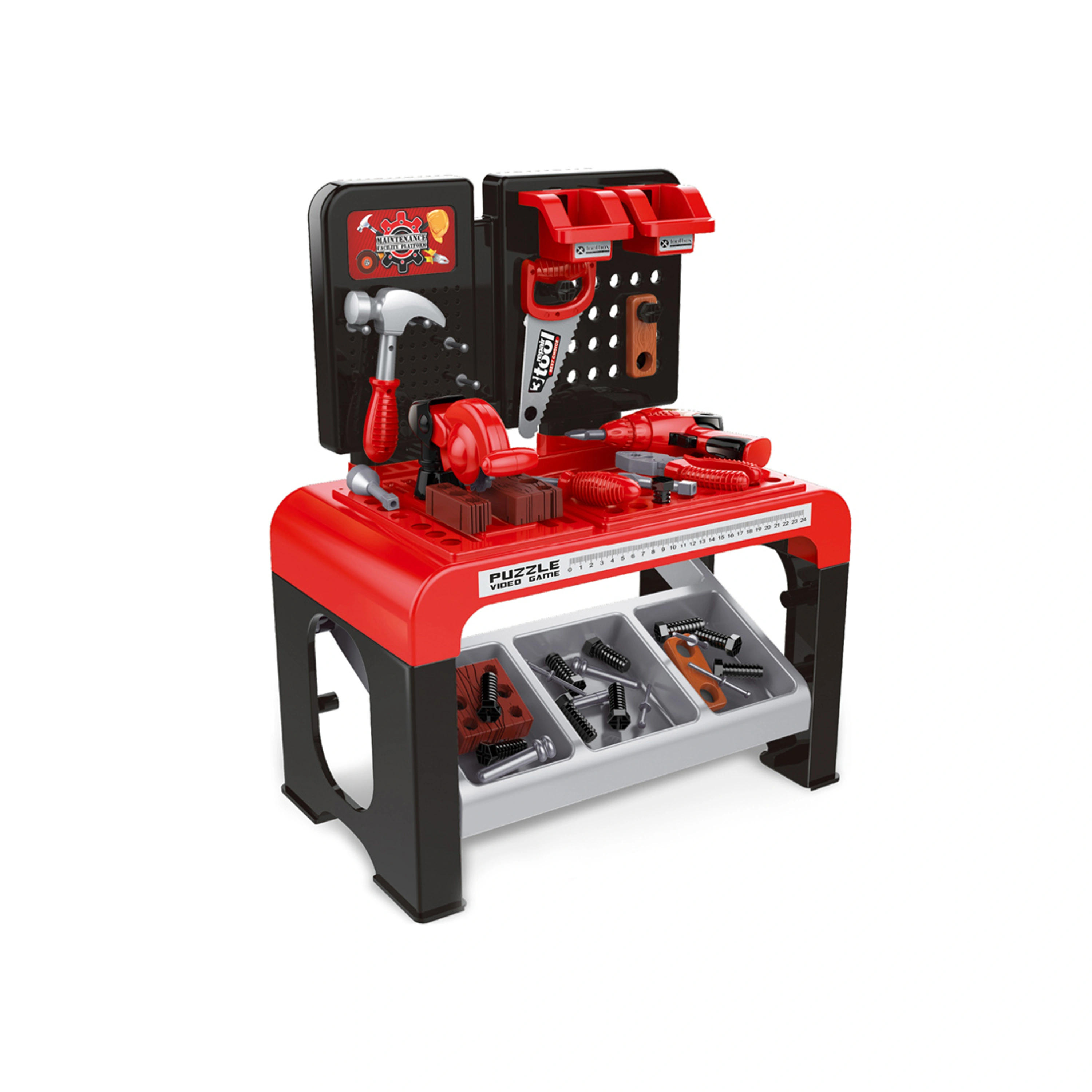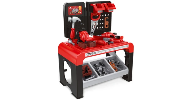 Stolek s nářadím. Rozměry 47x28x57,5 cm. 46 ks nářadí - šrouby, hřebíky, kladivo, šroubovák, kleště, ruční pila, okružní pila. Včetně věšáků a přihrádek na nářadí.