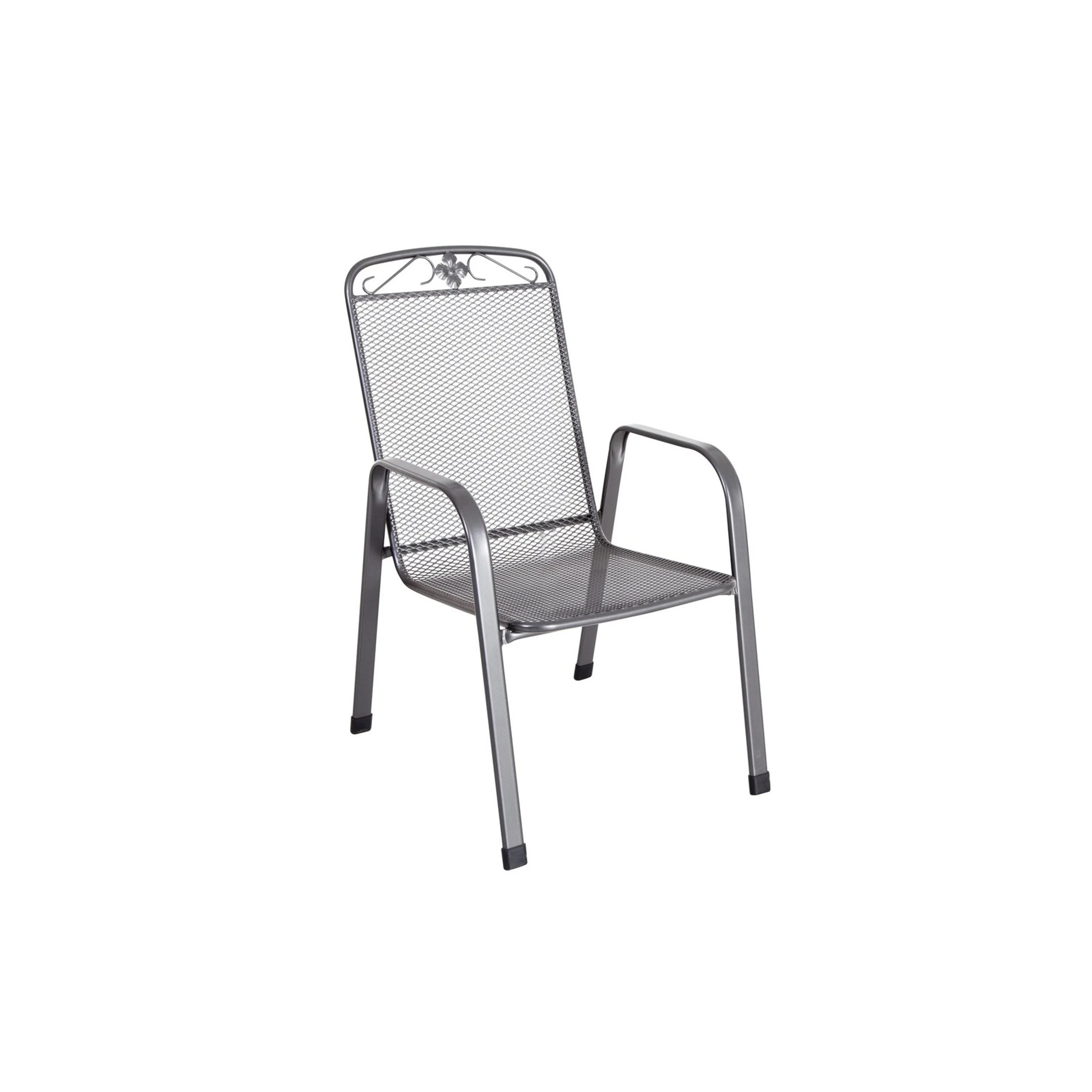 Elegantní zahradní křesílko z tahokovu, s pohodlným posedem a širokým stabilním profilem nohou vydrží i větší namáhání. Univerzální tmavě šedá barva se hodí do různého prostředí.Židle je stohovatelná a tak šetří prostor při skladování.