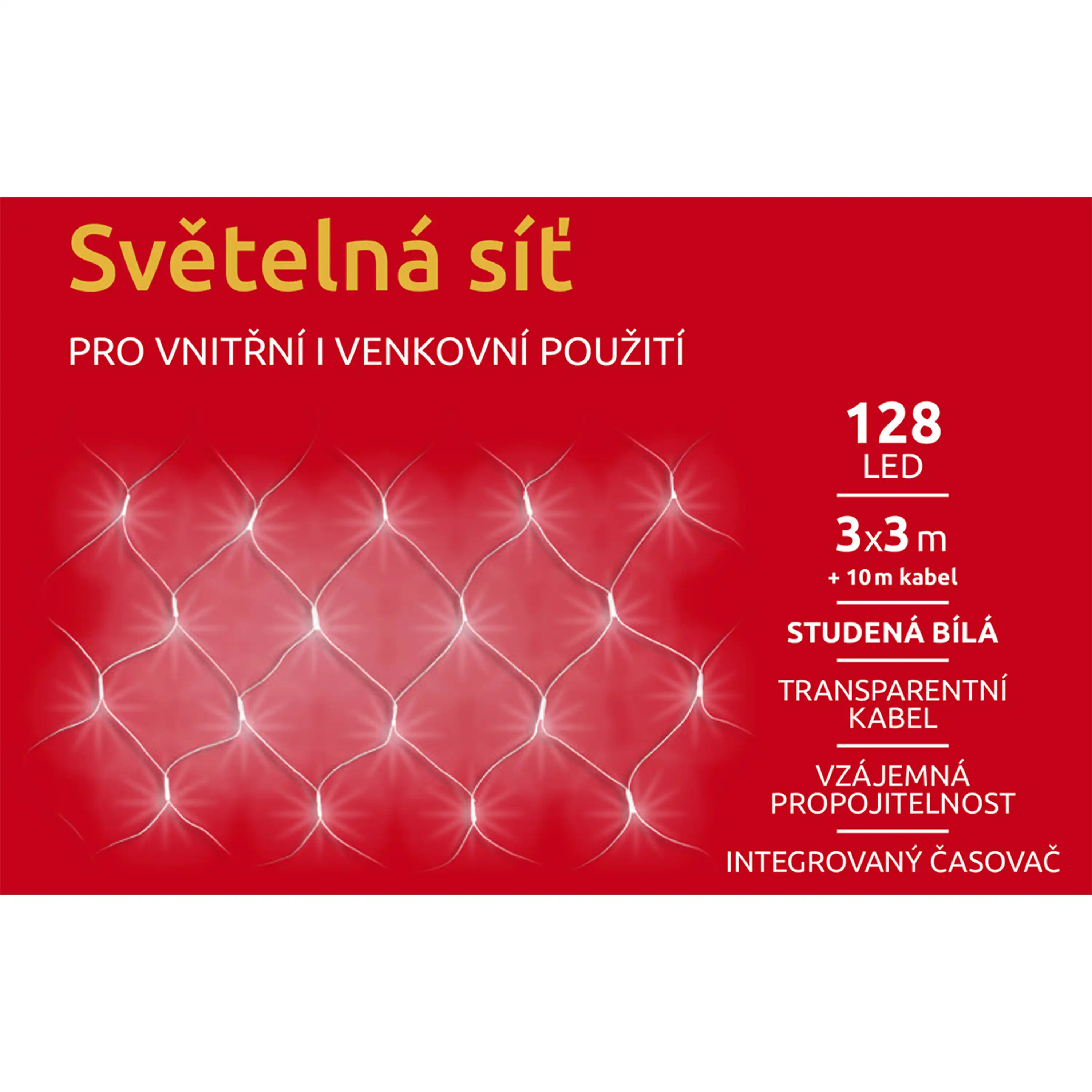Elegantní světelná síť se 128 LED, která se dá umístit do okna, na dům, pergolu apod. Dekorace je vhodná pro vnitřní i venkovní použití. Velikost 3 x 3 m.